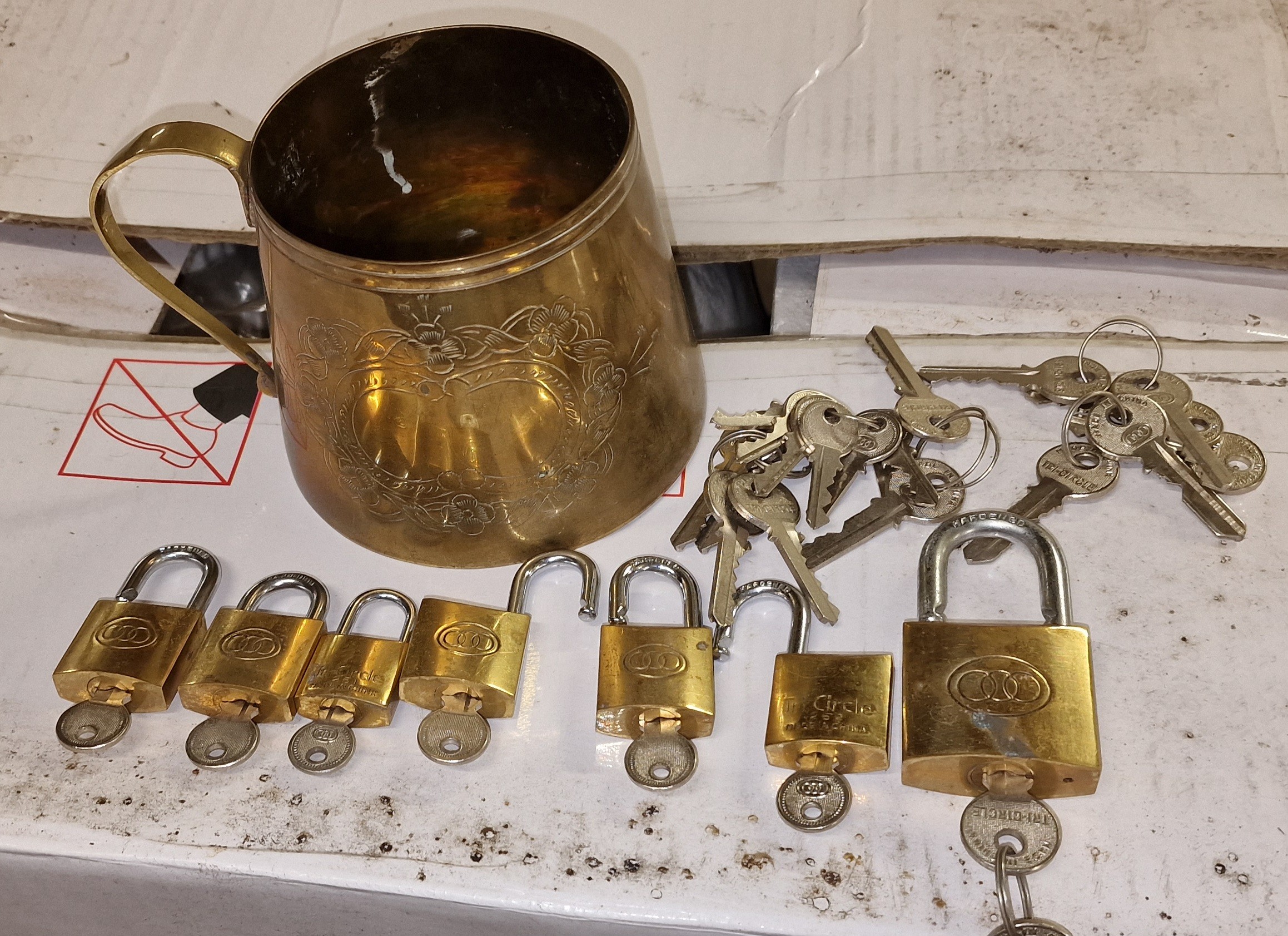 9 cm tall engraved pattern brass cup with assorted padlocks and keys