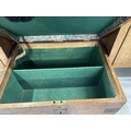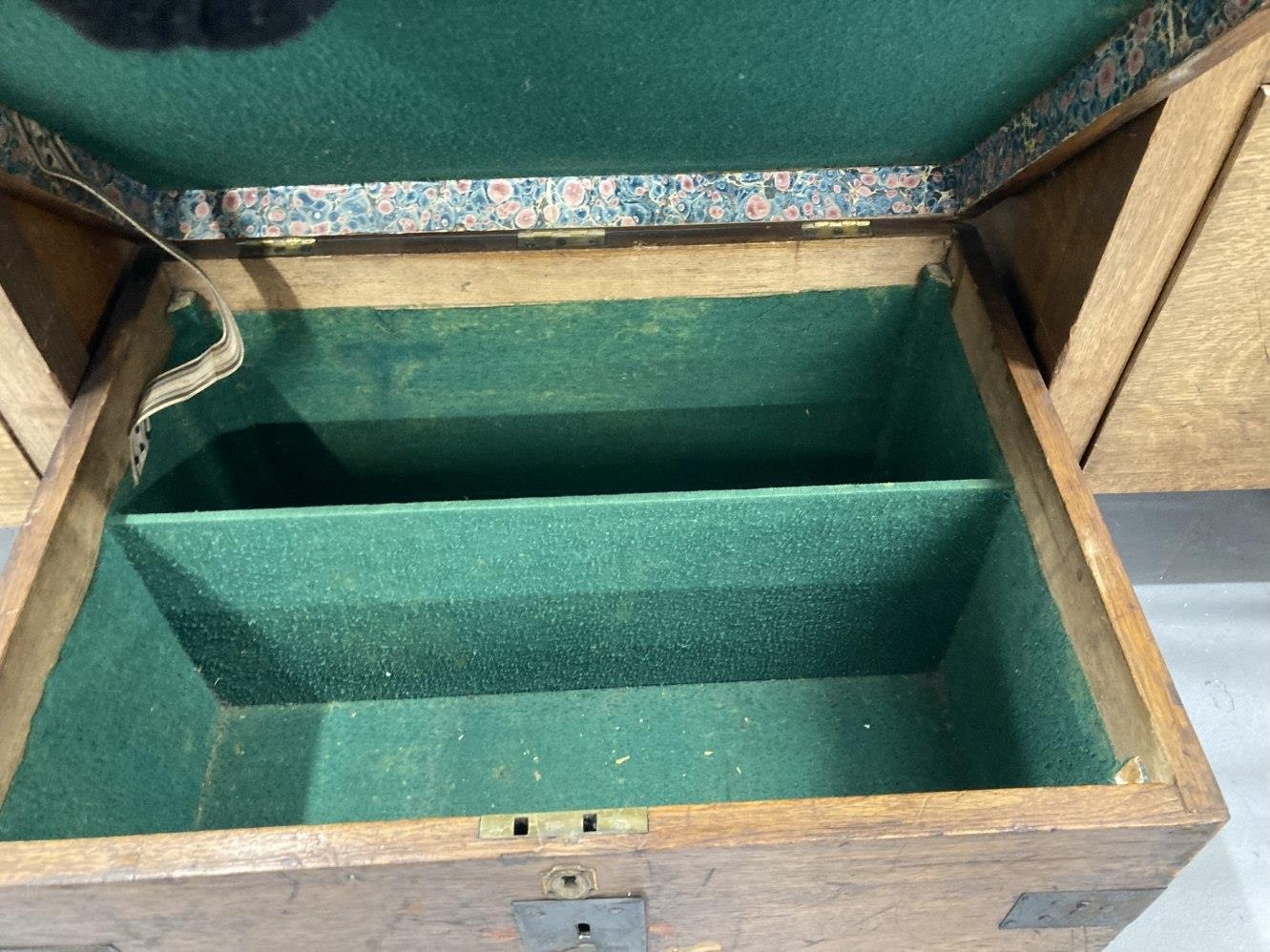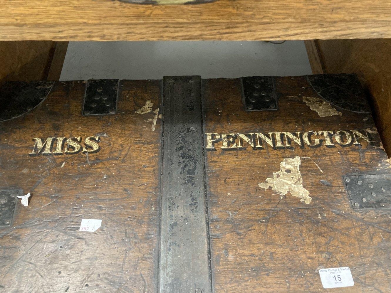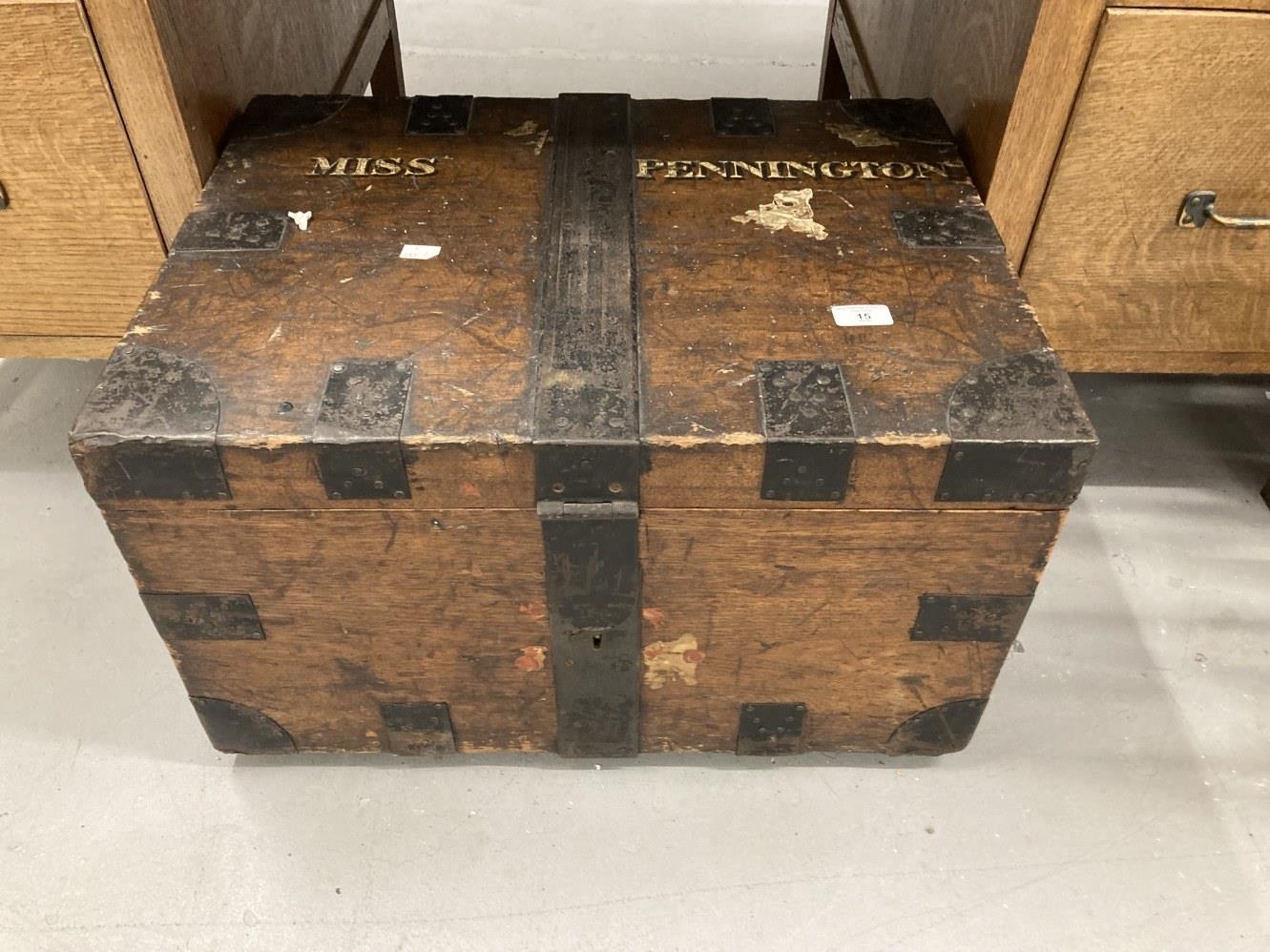 19th cent. Oak iron bound silver/valuables box. The lid stencilled with original lettering Miss Pennington. 18ins. x 14ins. x 24ins.