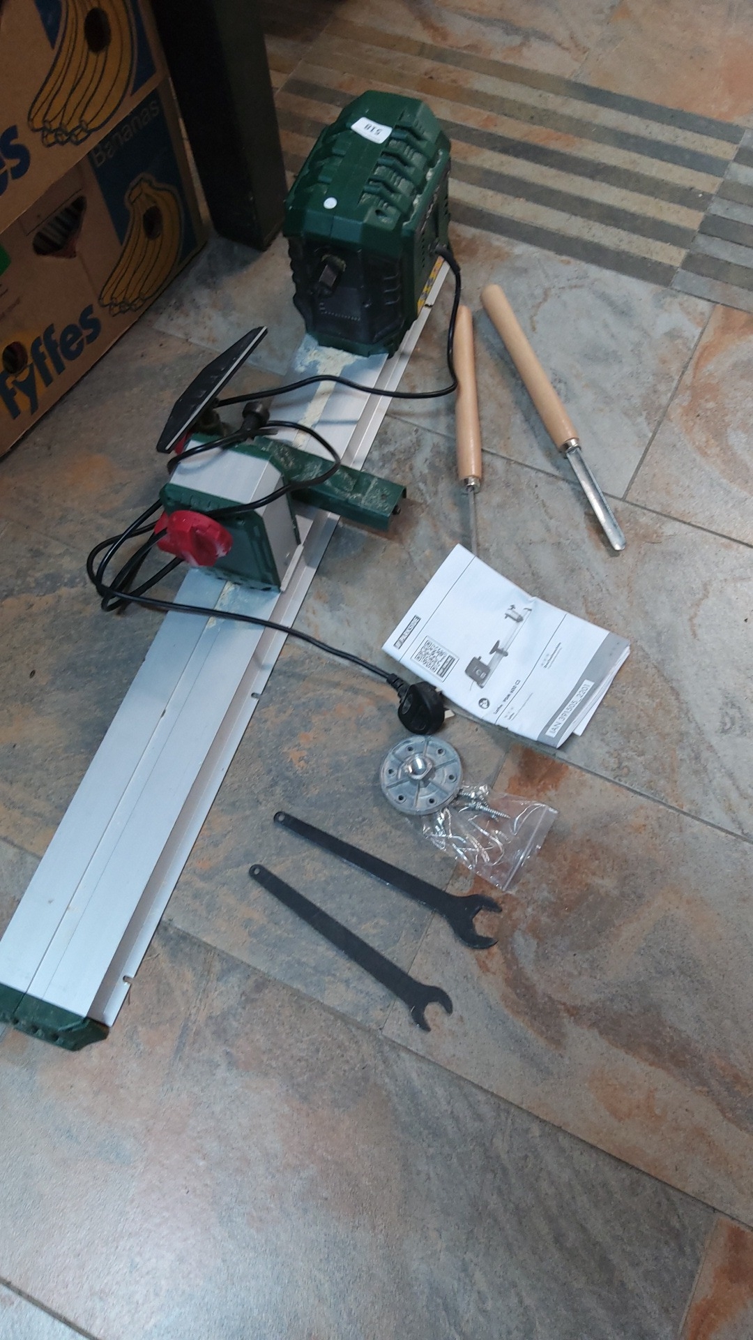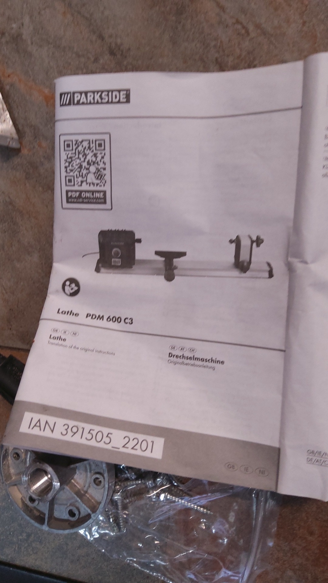 Parkside PDM 600 C3 mini woodturning lathe with metal bed and green motor housing, including instruction manual, turning tools, faceplate, drive centre, fixing screws, and two open-ended spanners.