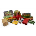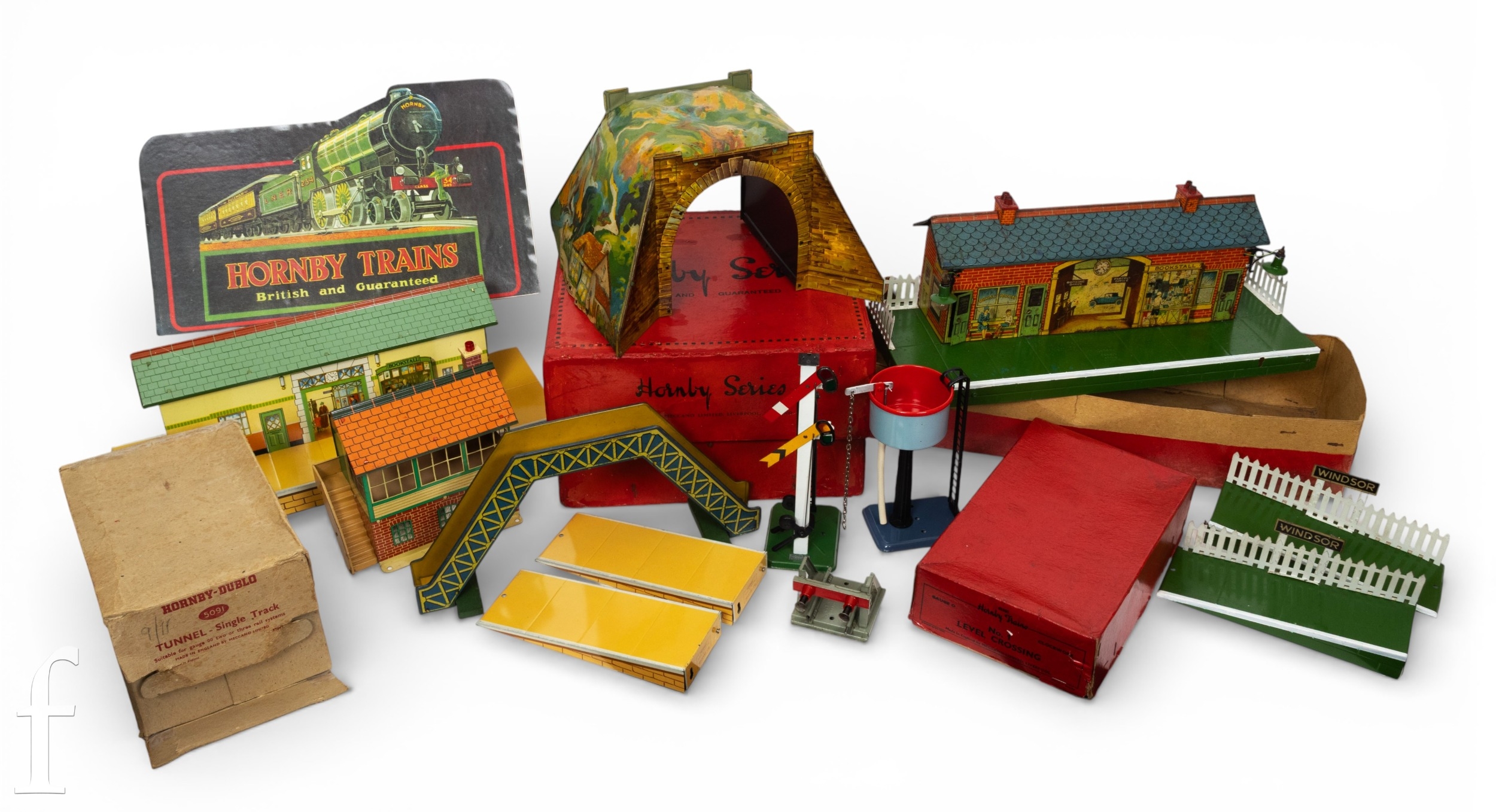 A group of Hornby O gauge items to include No.2E station 'Windsor' with electric lights and ramps, No.3 station and ramps, A855 tunnel, boxed, level crossing, boxed, signal box, sprung buffers, signal, water tower, footbridge, assorted track and two reproduction advertising signs, together with a Hornby Dublo OO gauge 5091 tunnel, boxed. (qty)