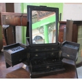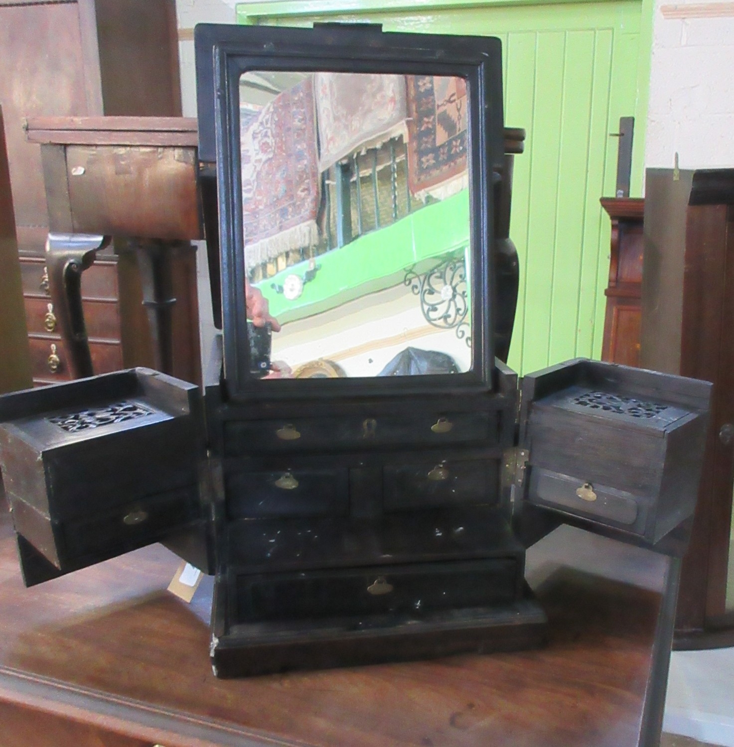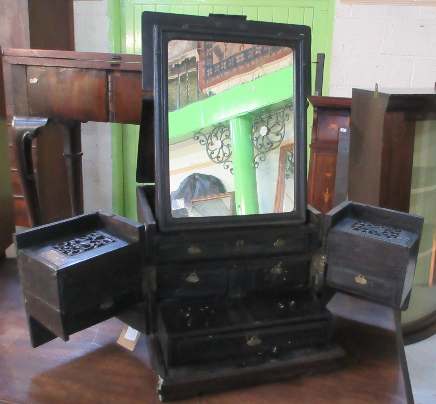 Chinese carved hardwood brass bound vanity box, the lift-up lid enclosing a mirror above an arrangement of six drawers, with two side handles, W60cm D32cm H47cm max