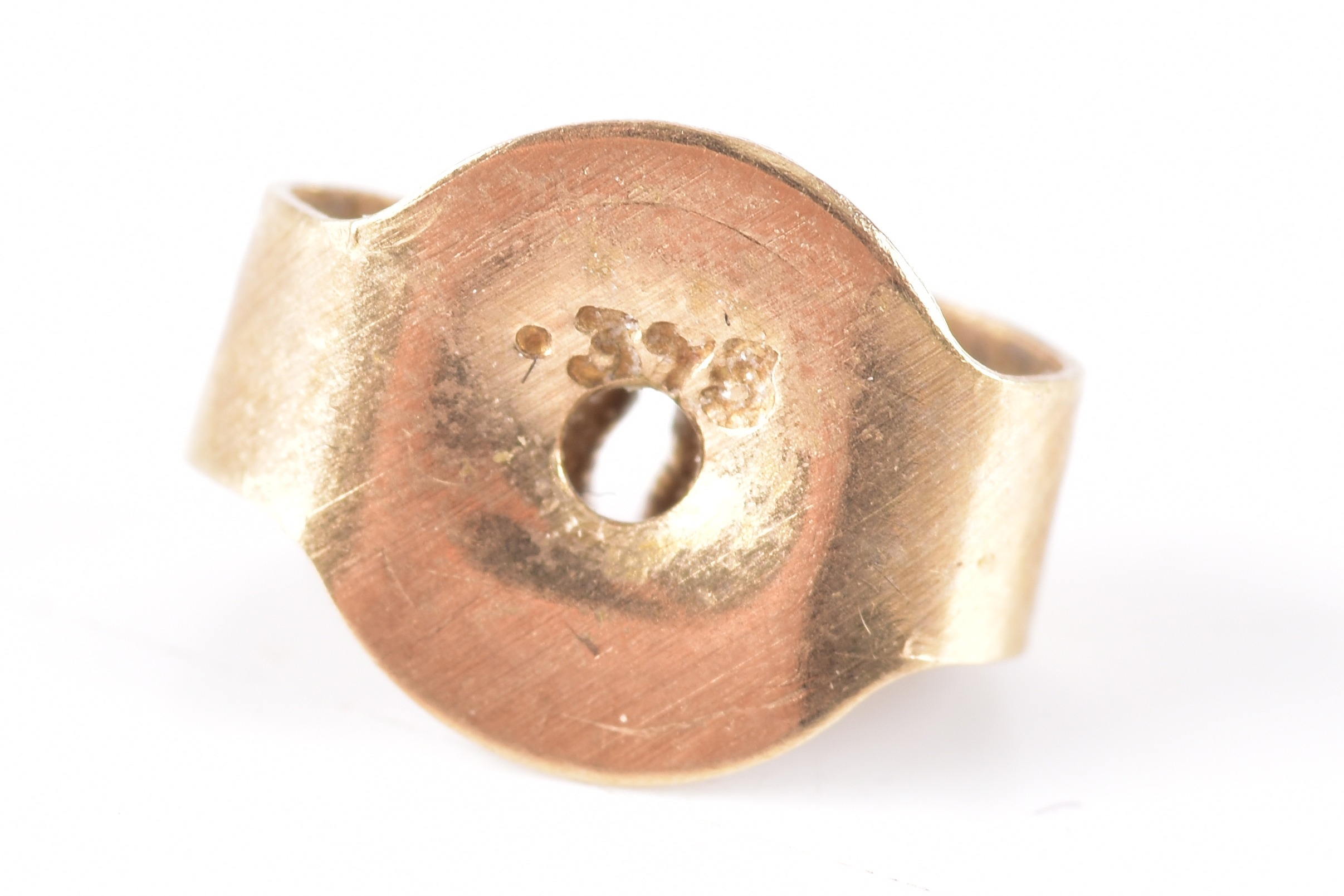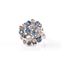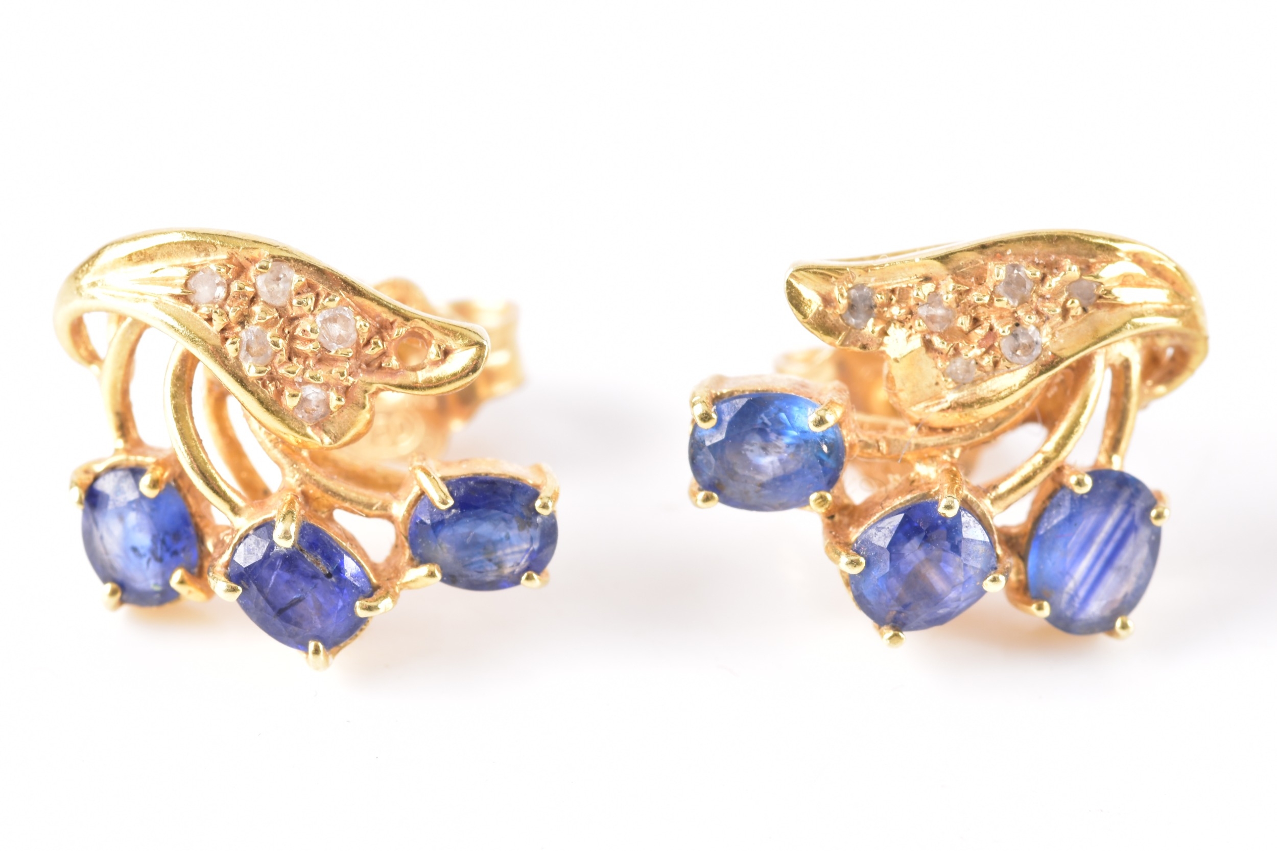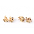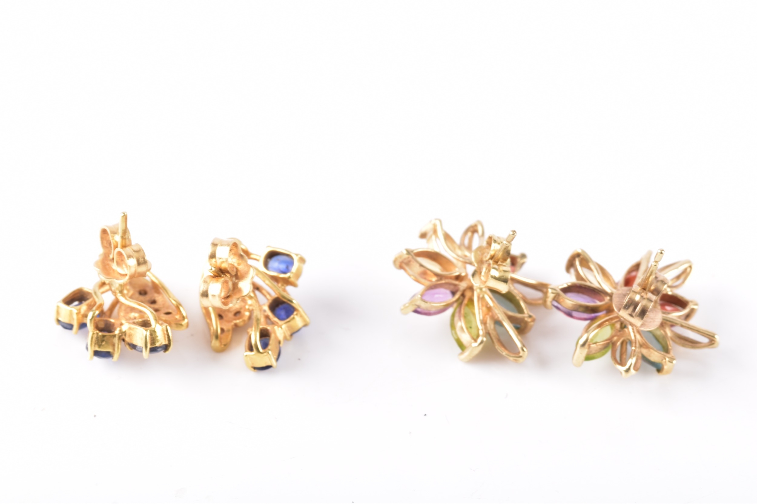 A pair of 9ct yellow gold and multigem floral cluster earrings, (one lacking a stone) together with a pair of unmarked yellow gold, diamond, and sapphire cluster earrings (one lacking a small diamond). (2)