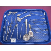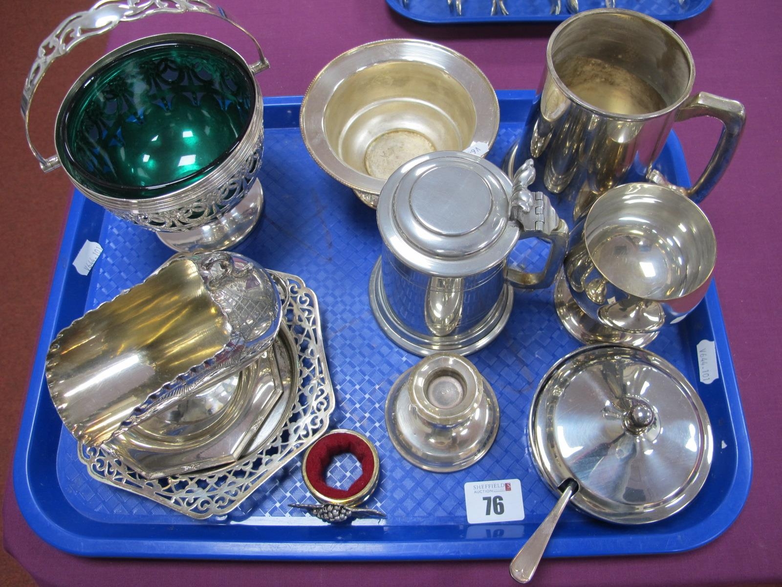 Assorted Plated Ware, including decorative swing handled sugar basket with green glass liner, a hallmarked silver dwarf candlestick, lidded and other mugs, sugar scuttle etc :- One Tray