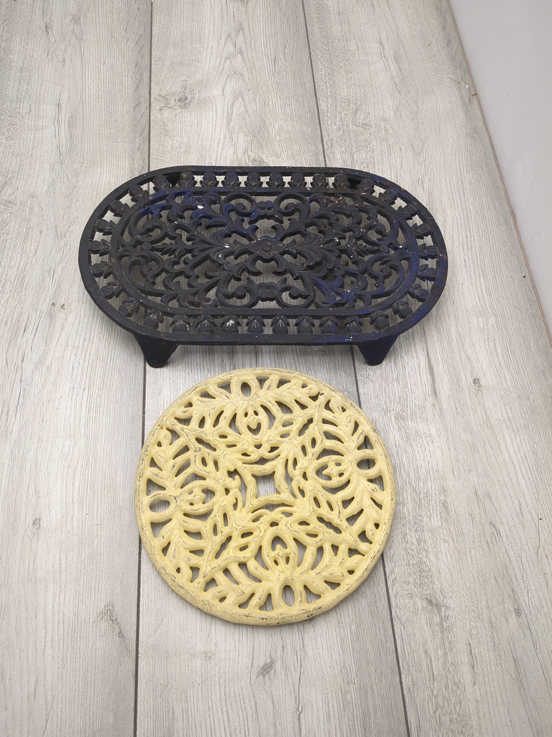 This lot includes two decorative cast iron trivets, featuring intricate cut-out patterns. One trivet is an oval shape with a dark finish, while the other is round with a light finish. These trivets can serve both functional and ornamental purposes, suitable for indoor or outdoor settings.