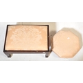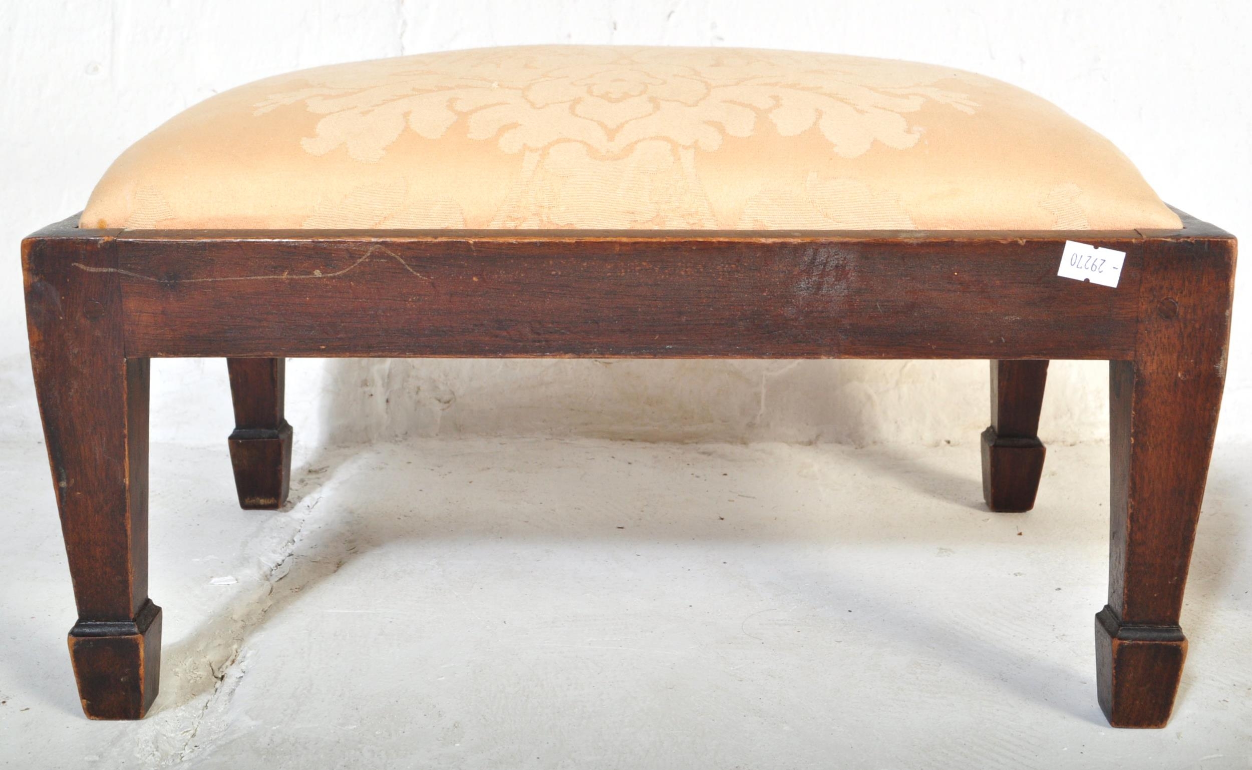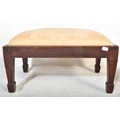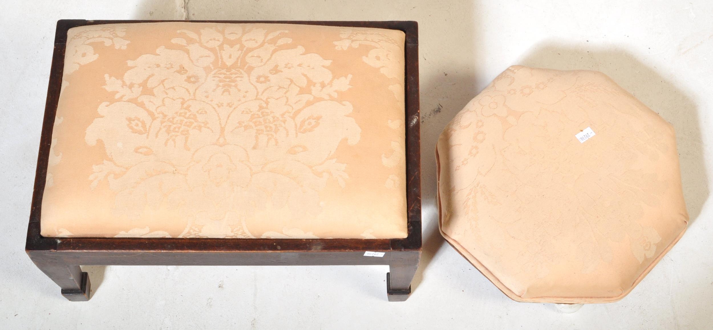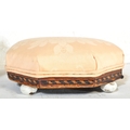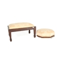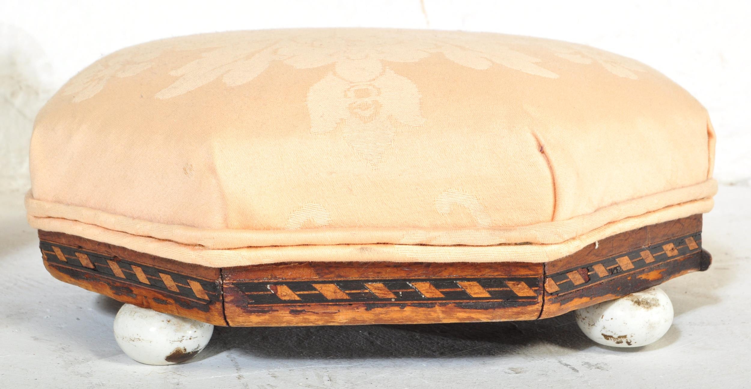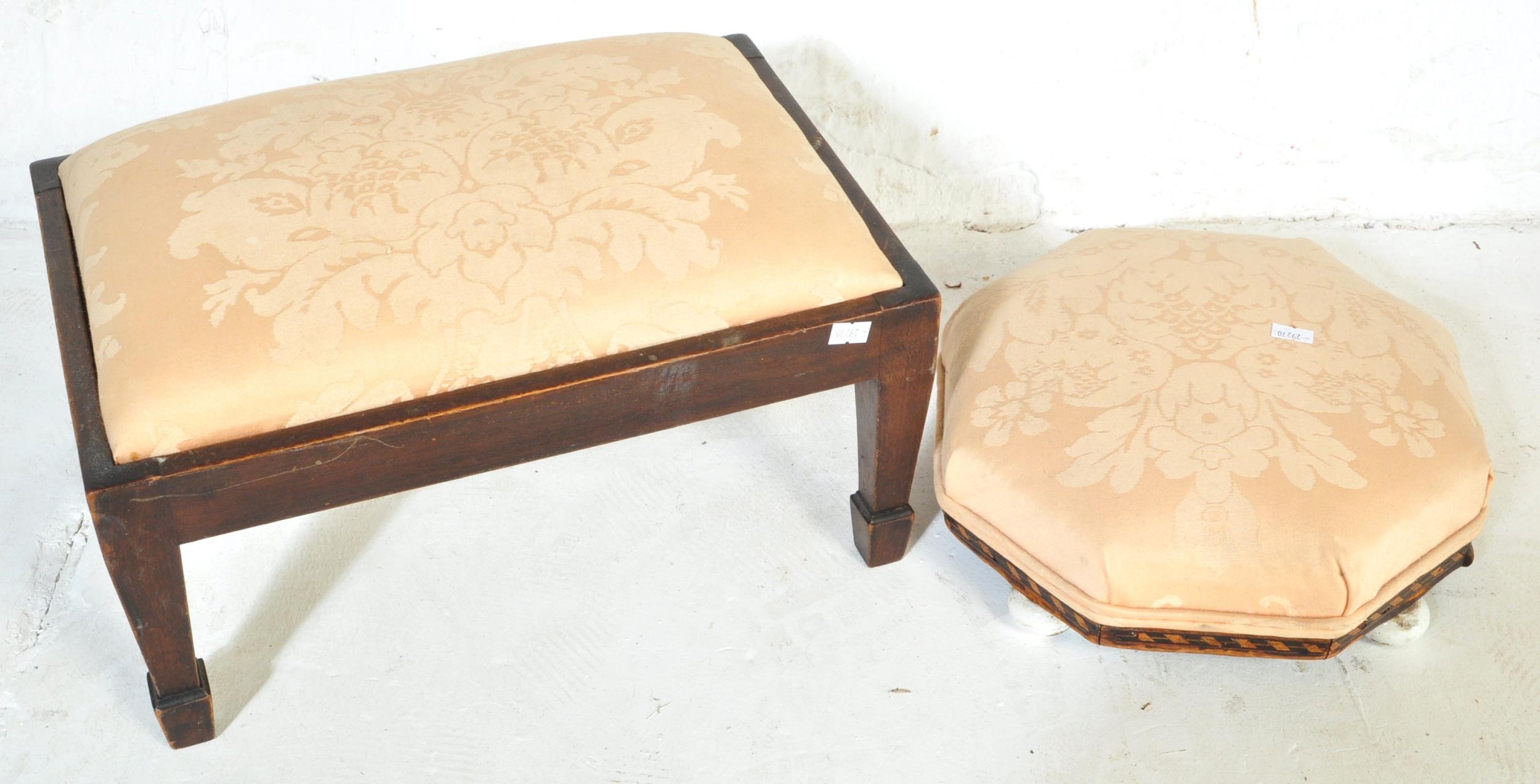 A pair of 19th Century low foot stools. Of octagonal shape with upholstered fabric cushioned top with inlaid mahogany base raised on painted bun feet. Together with a chamfered leg rectangular footstool. Measures approx.