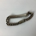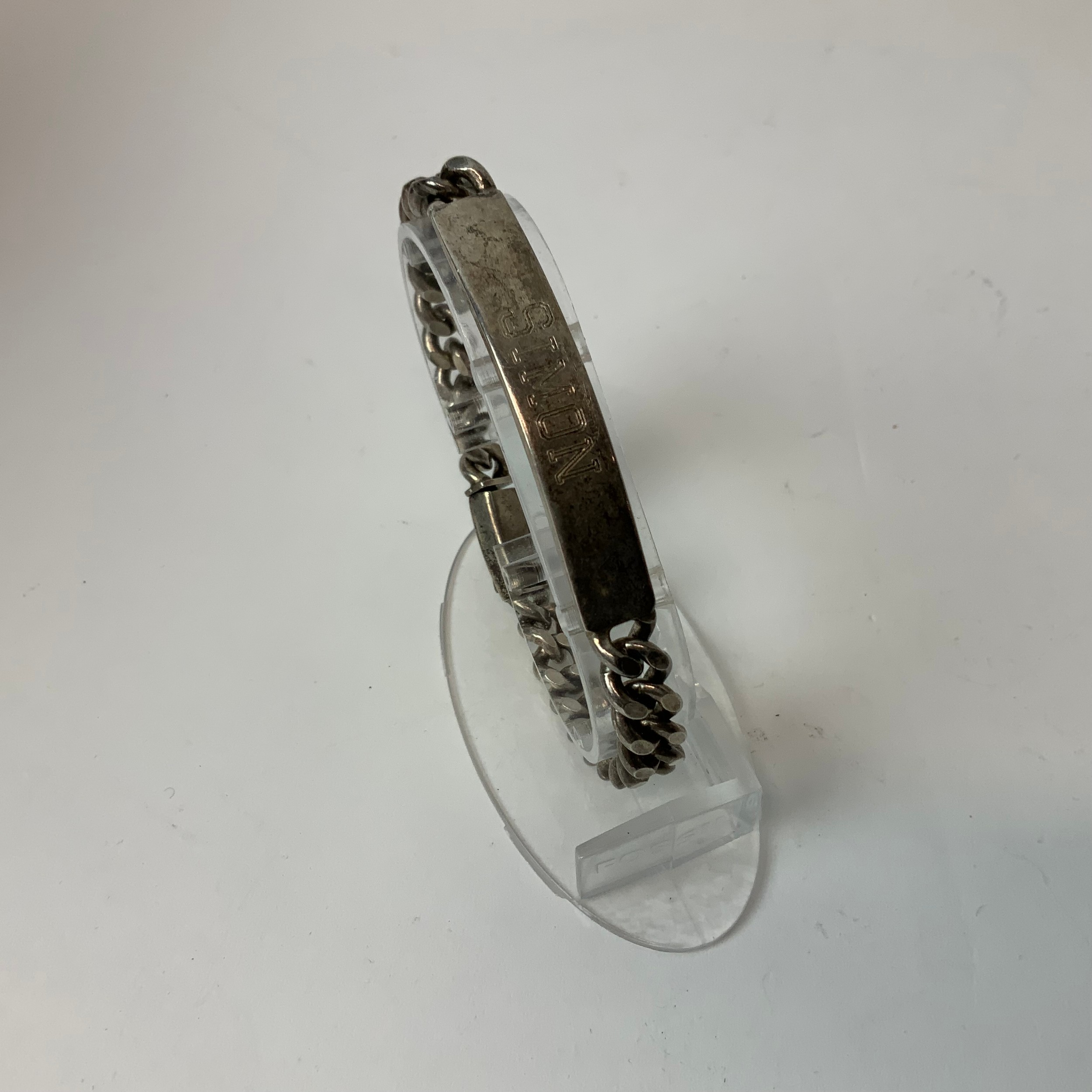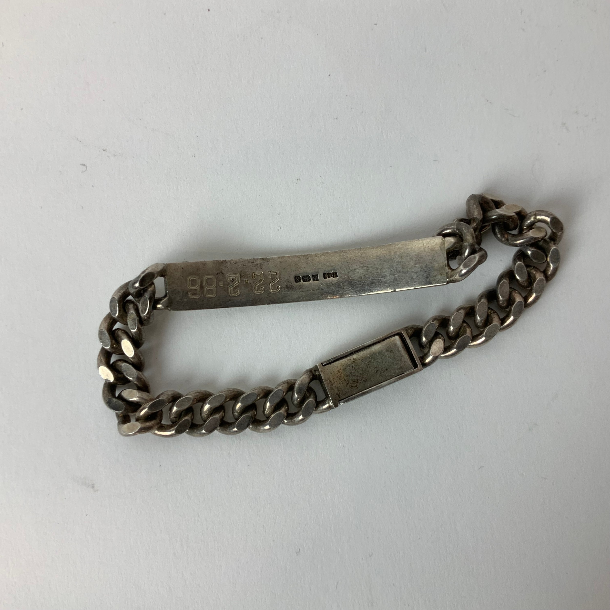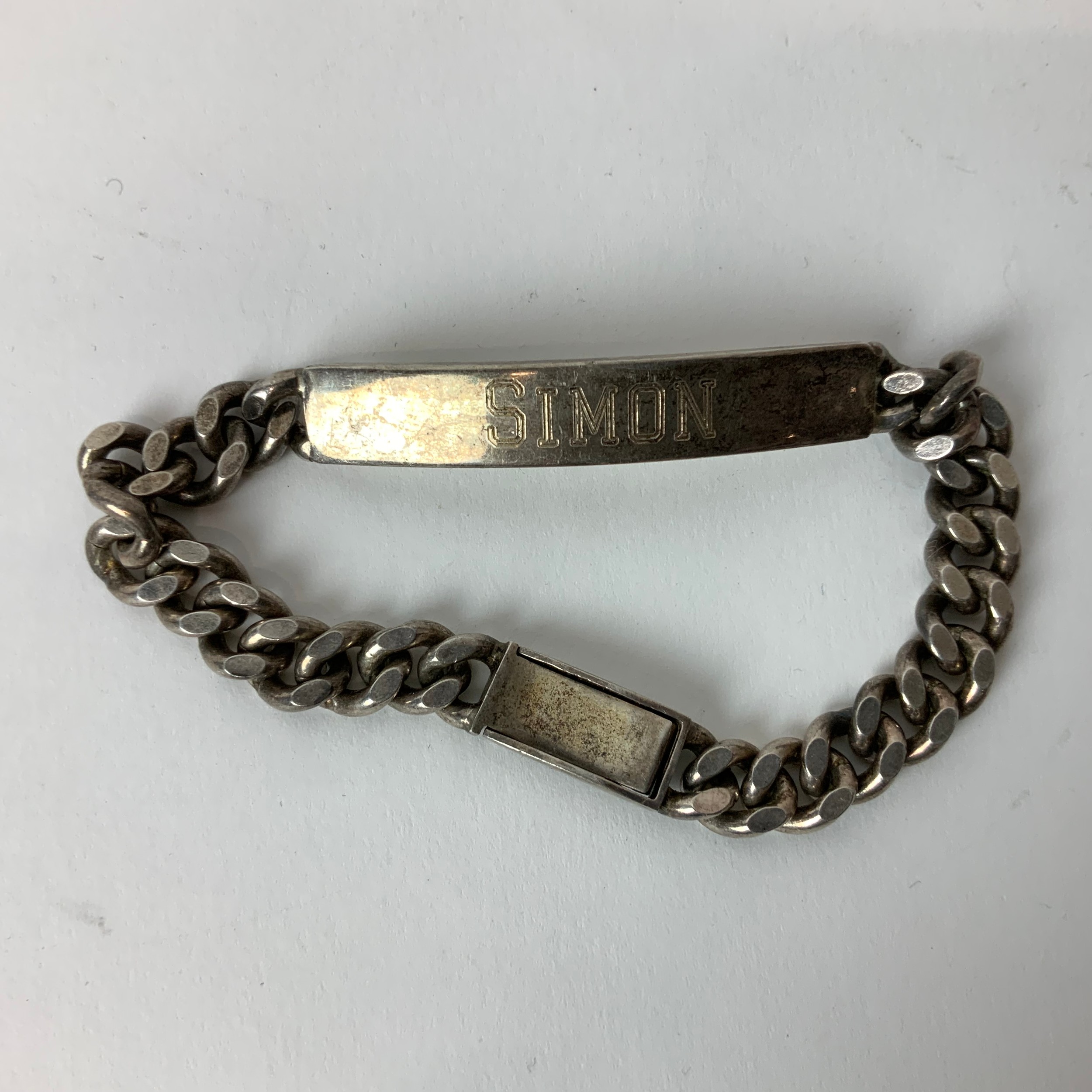 A gentlemen's silver curb link identity bracelet engraved Simon. Total weight 37.7 grams.