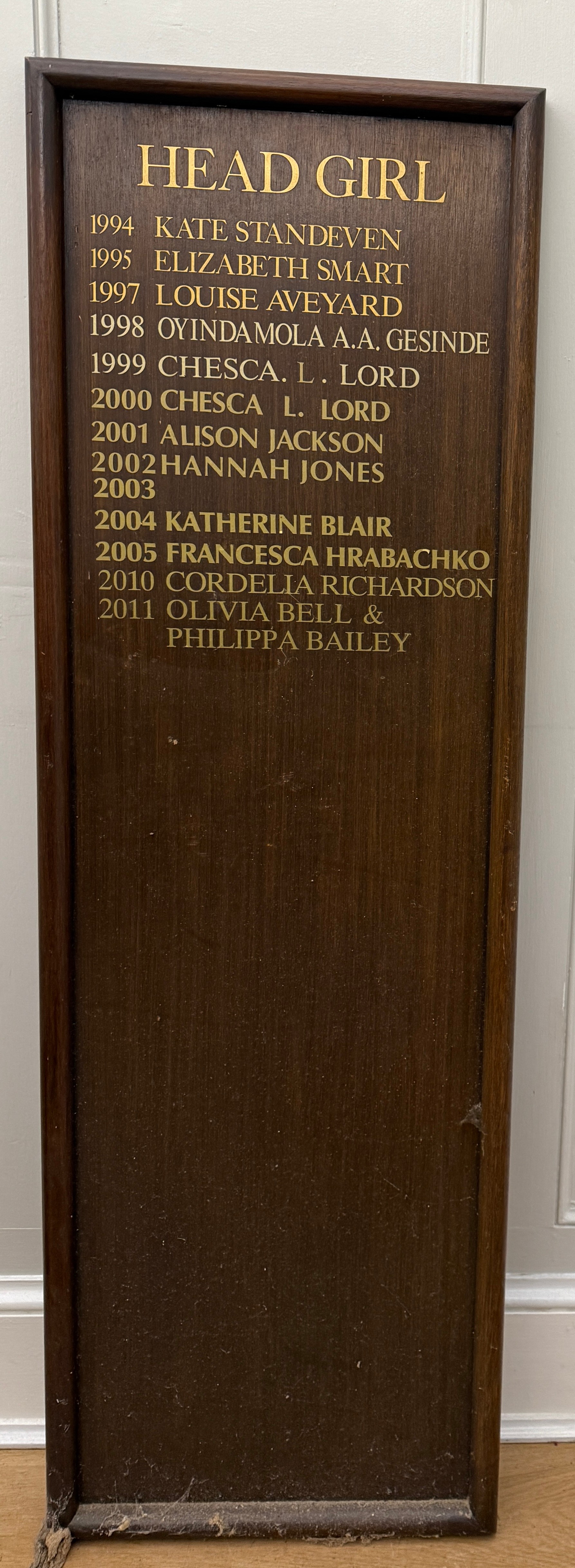 Moorlands School honour board. Head girl. Starting 1994. 119cm x 38cm.