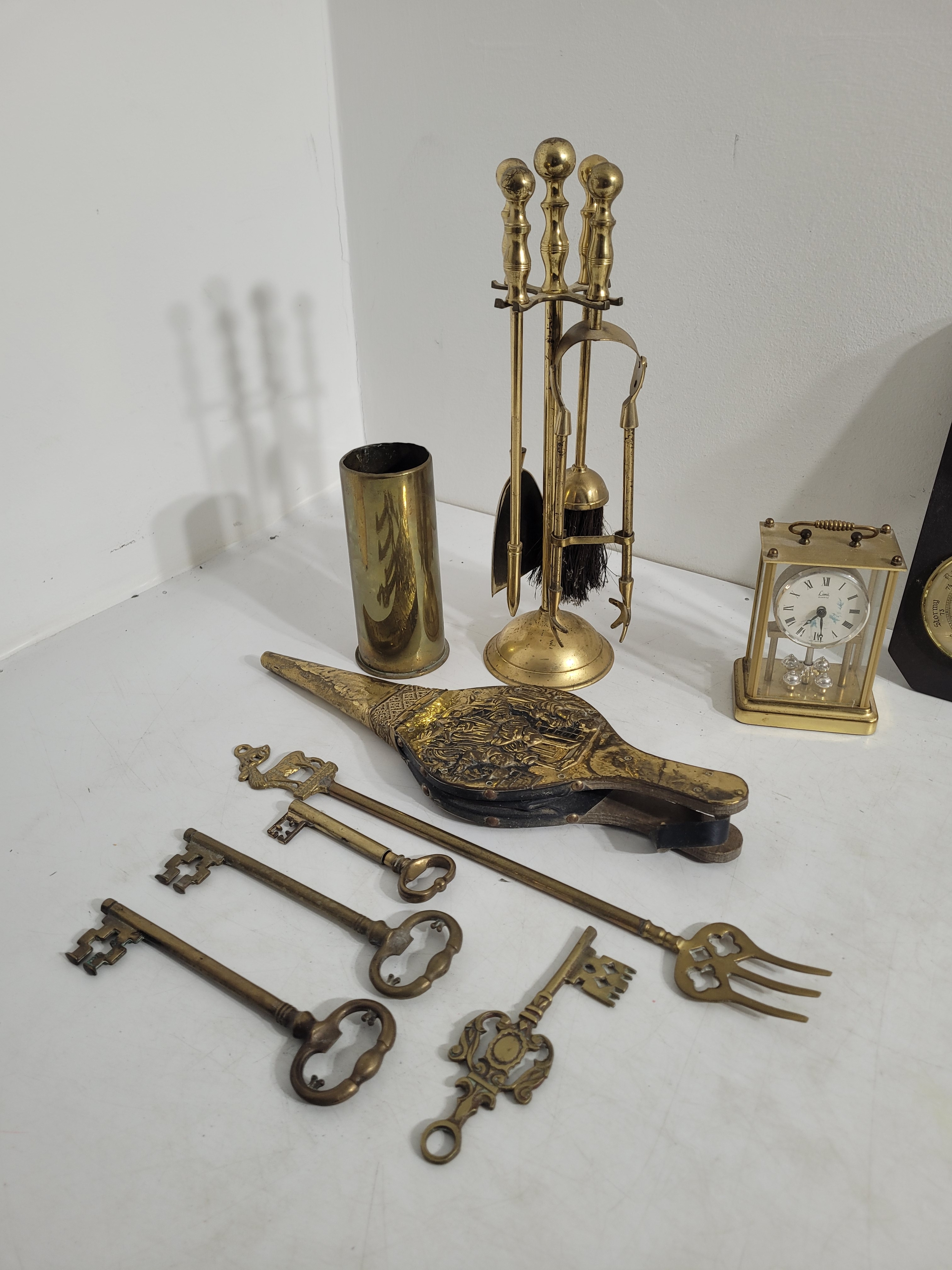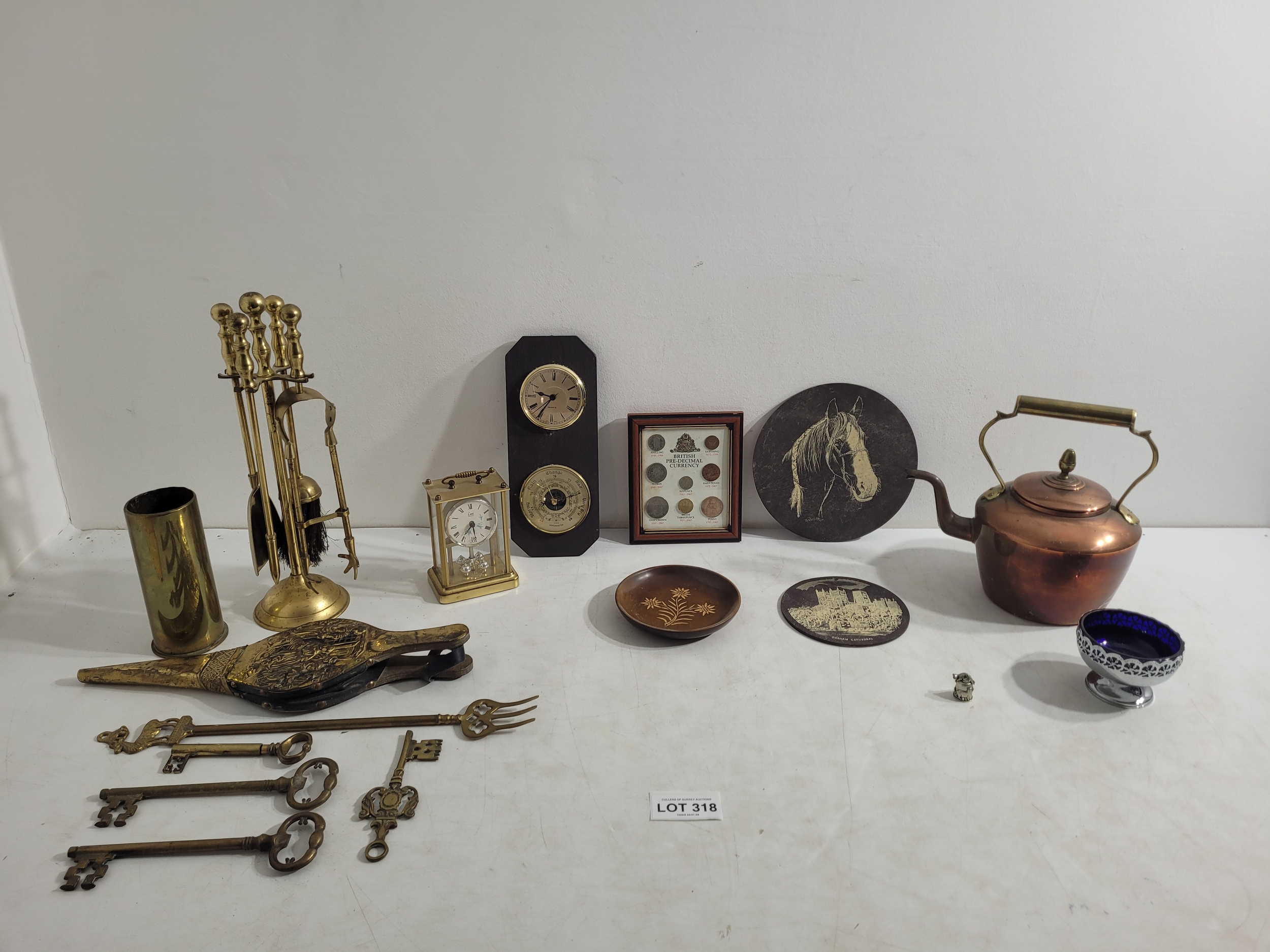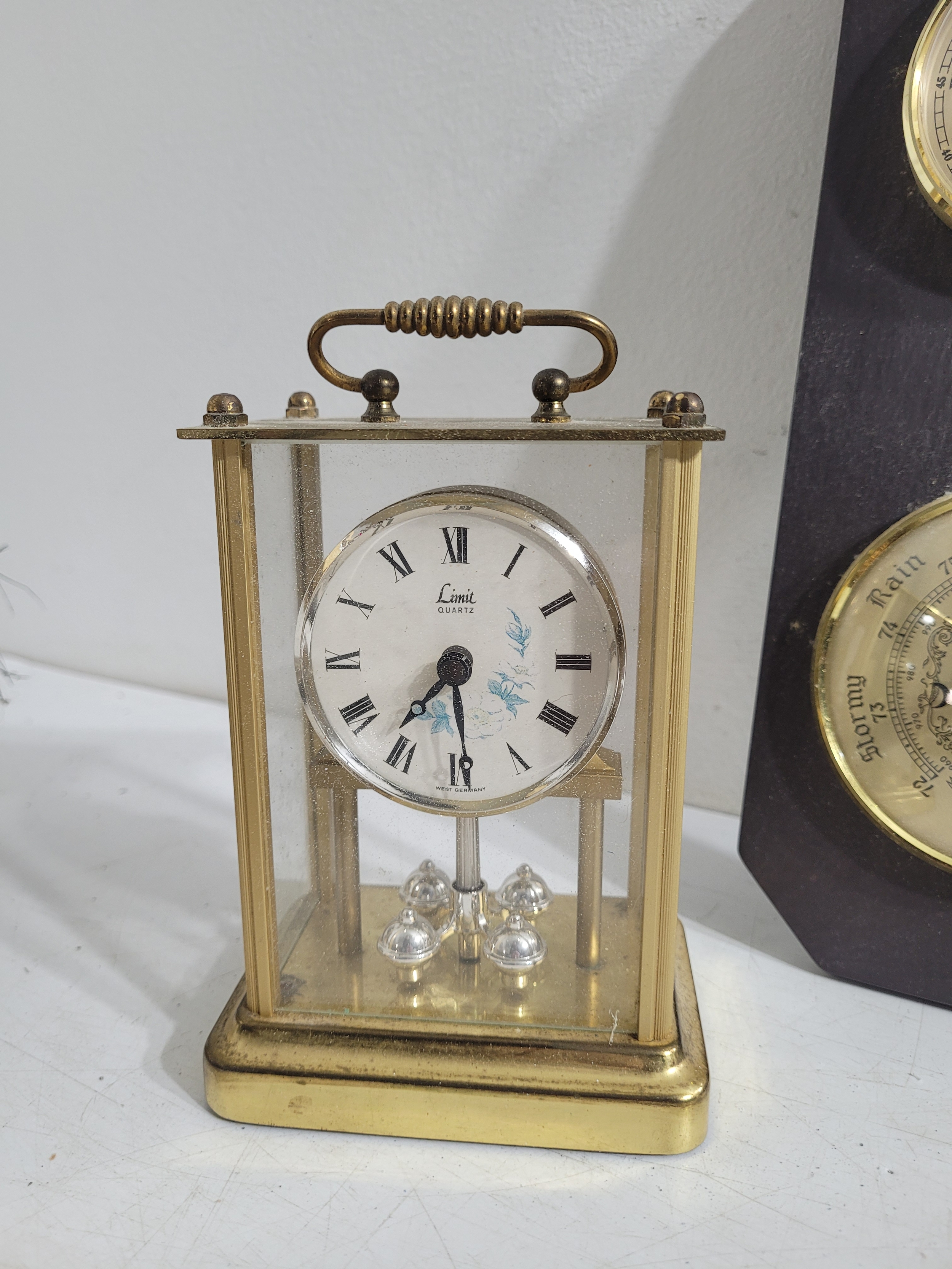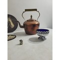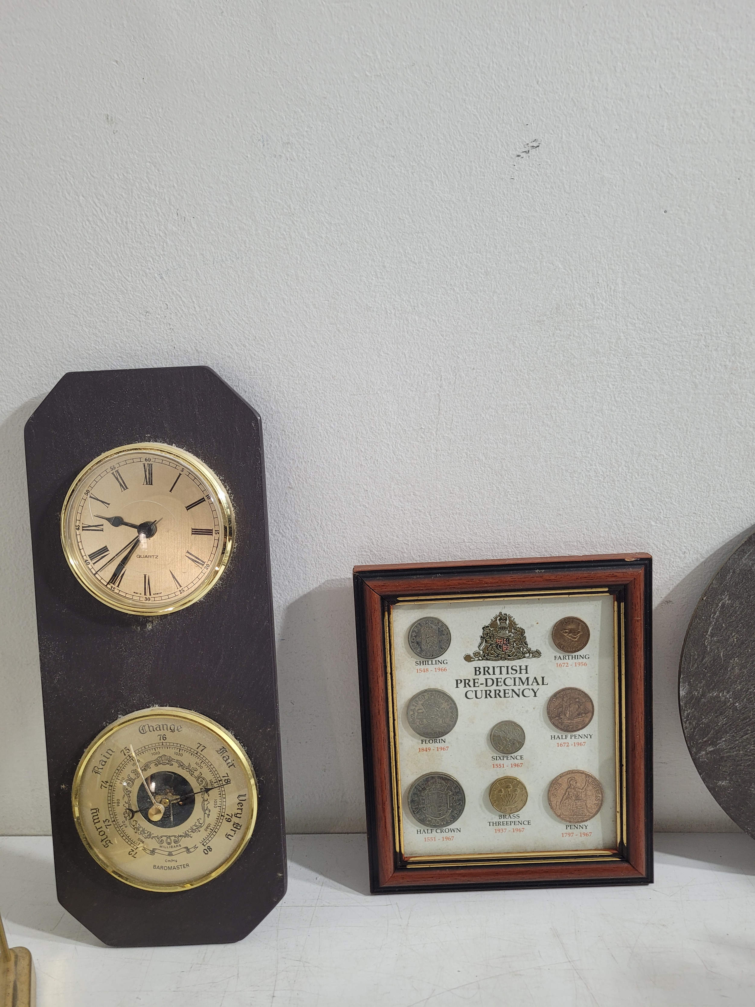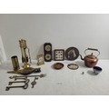Collection of collectables including brass, cooper, etched plaques, barometer, clocks and more