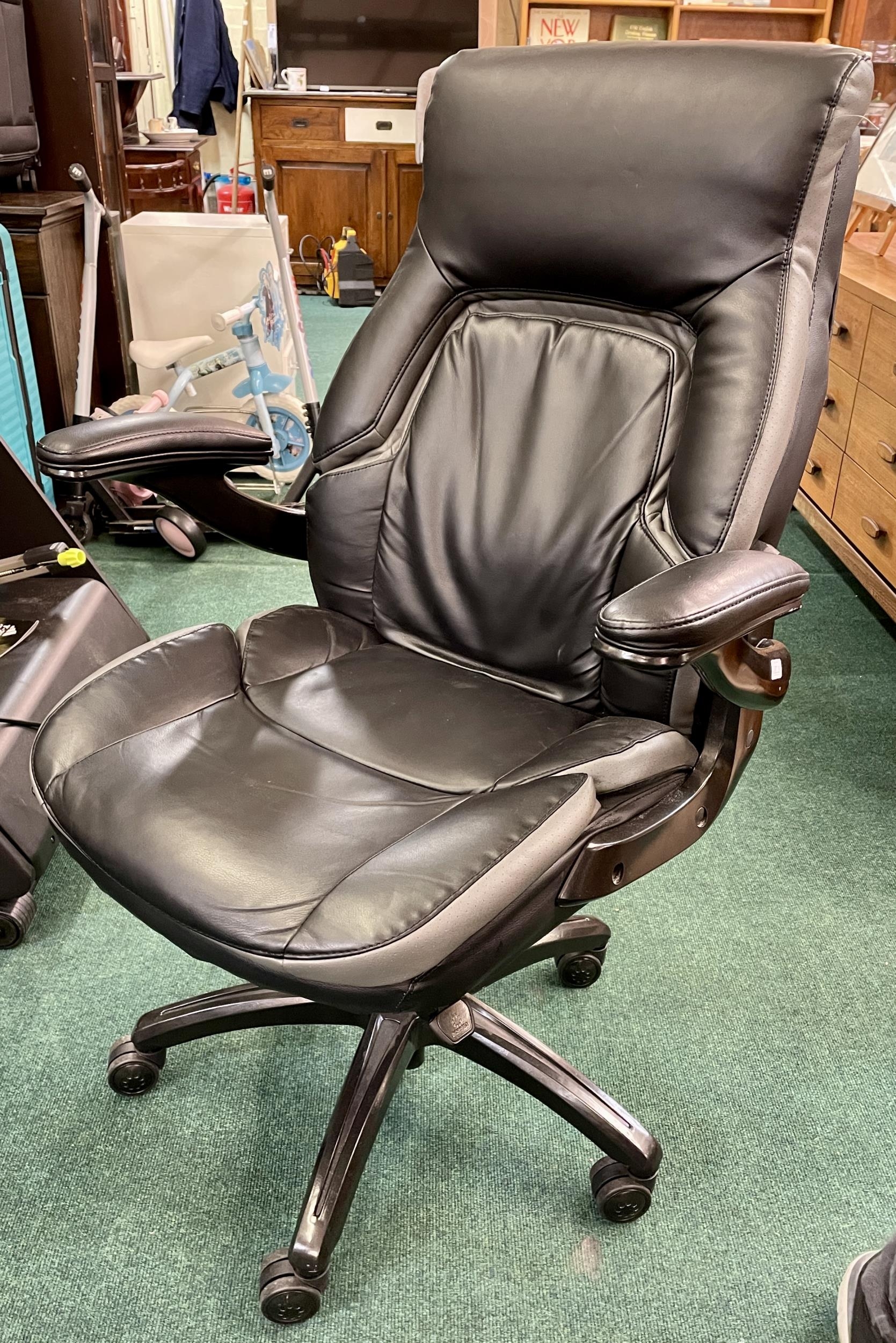DORMEO TWO/TONE LEATHER OFFICE/GAMING CHAIR WITH RISE AND FALL ARMS - SLIGHT WEARING TO ARMS