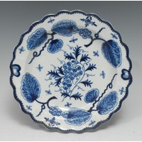 A Worcester Peony pattern sauce boat, the exterior in relief with rose and fuchsias, the interior in under glaze blue with peony and other flowers, cell border, 16.5cm wide, crescent mark