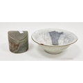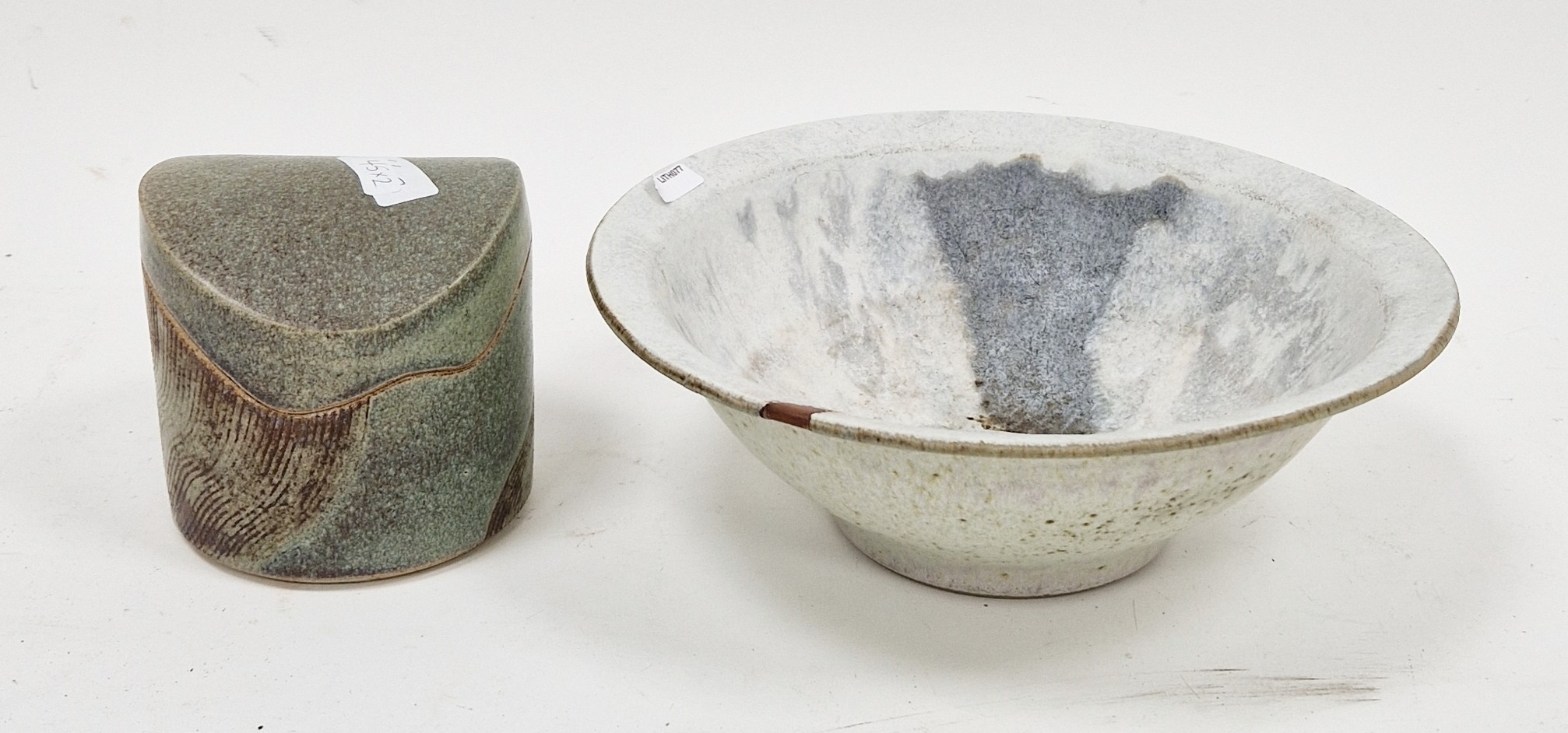 LOT WITHDRAWN; Anthony Bernulf Hodge (1949-2009) (Tony Hodge) studio stoneware bowl with grey, blue and brown glaze, with double tree impressed mark, 23cm diameter x 10cm high, and an Anthony Hodge stoneware canister in mottled green, brown glaze, cylindrical with wave-pattern lid, 10cm high x 10cm diameter (2)