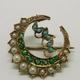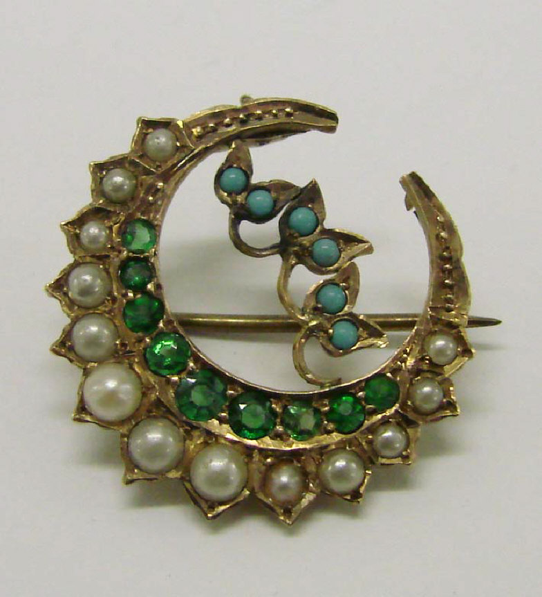 9ct gold moon brooch set with pearls, turquoise and green stones