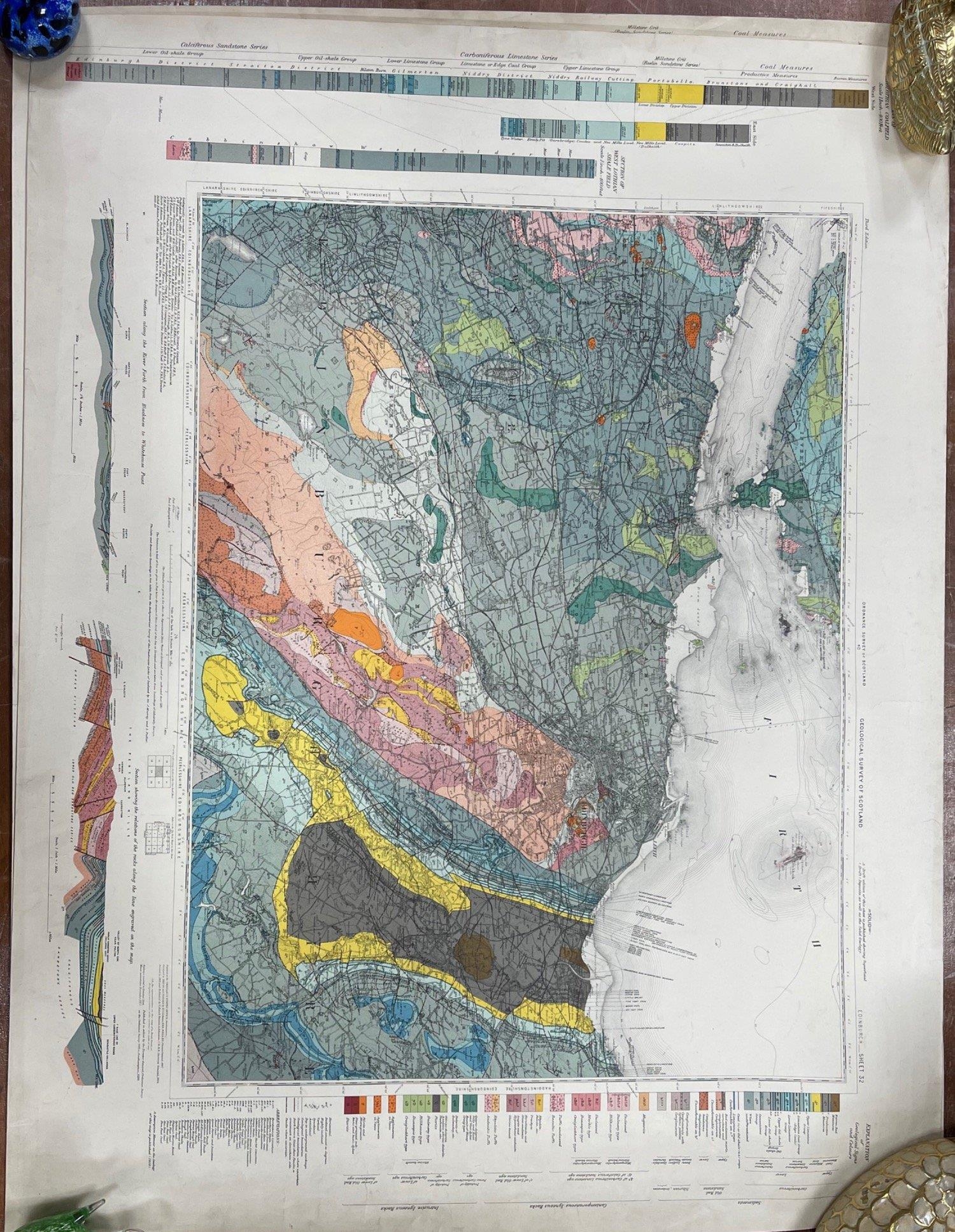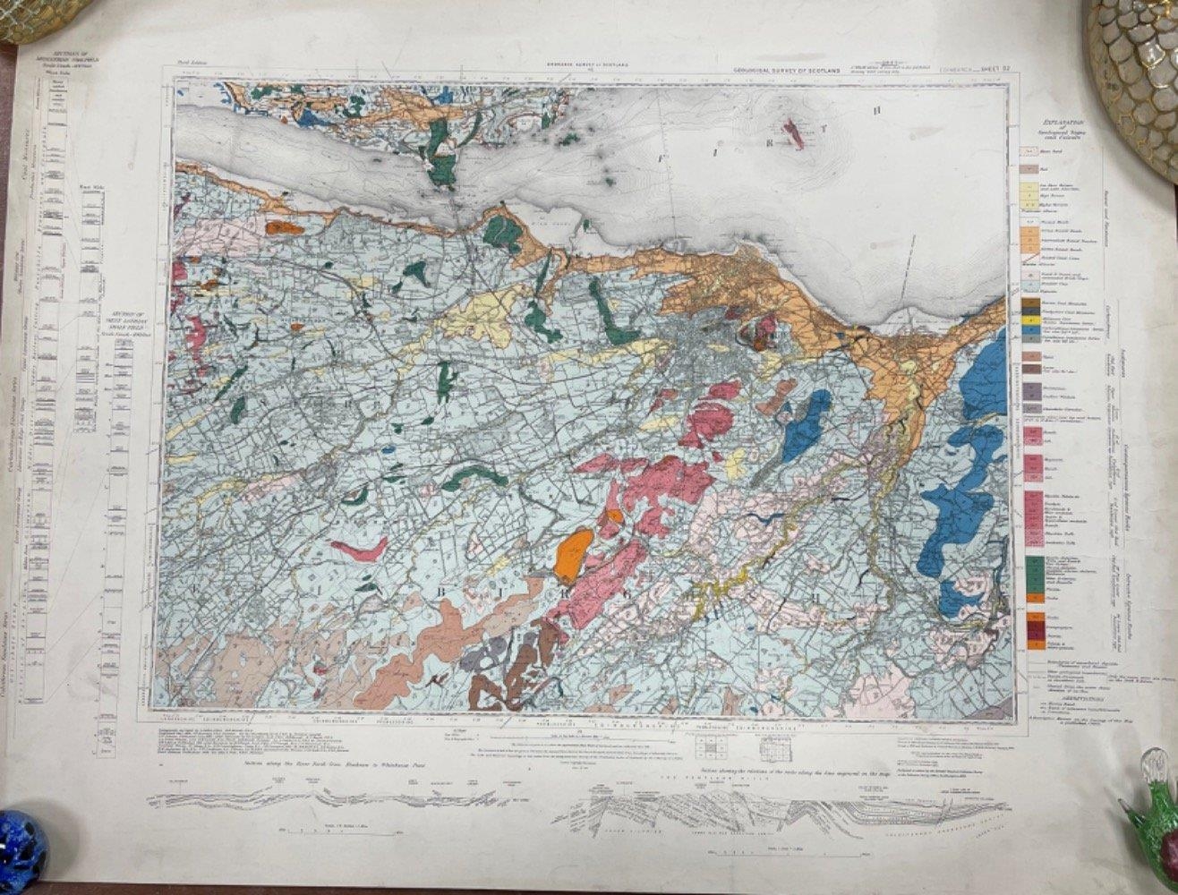 Stamped July1930 - TWO COLOURFUL ORDNANCE SURVEY OF SCOTLAND EDINBURGH AND PEEBLESSHIRE maps sheet(s) 32 GEOLOGICAL SURVEY OF SCOTLAND detailed maps - dimensions each 26" height x 36" wide approx showing sections of West Lothian Shale Field - EXTREMELY INTERESTING!