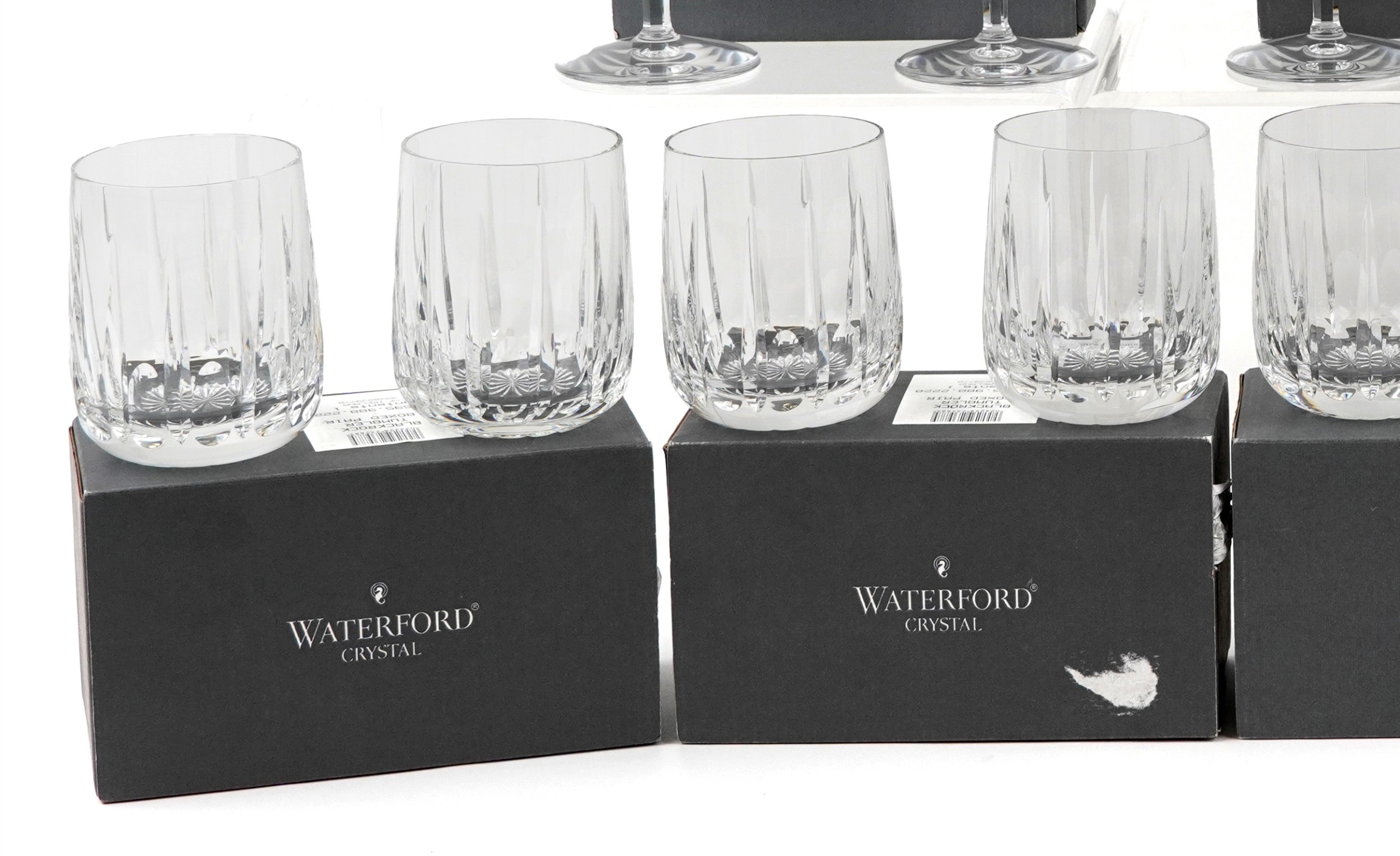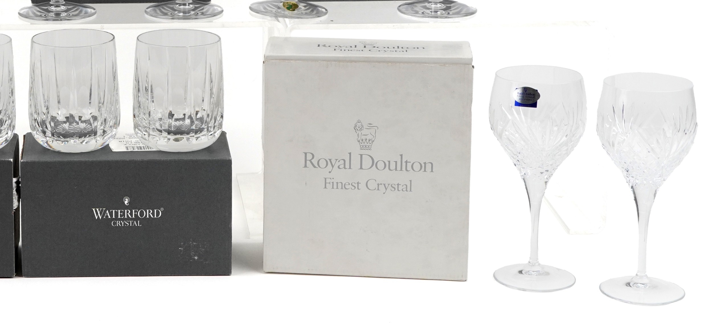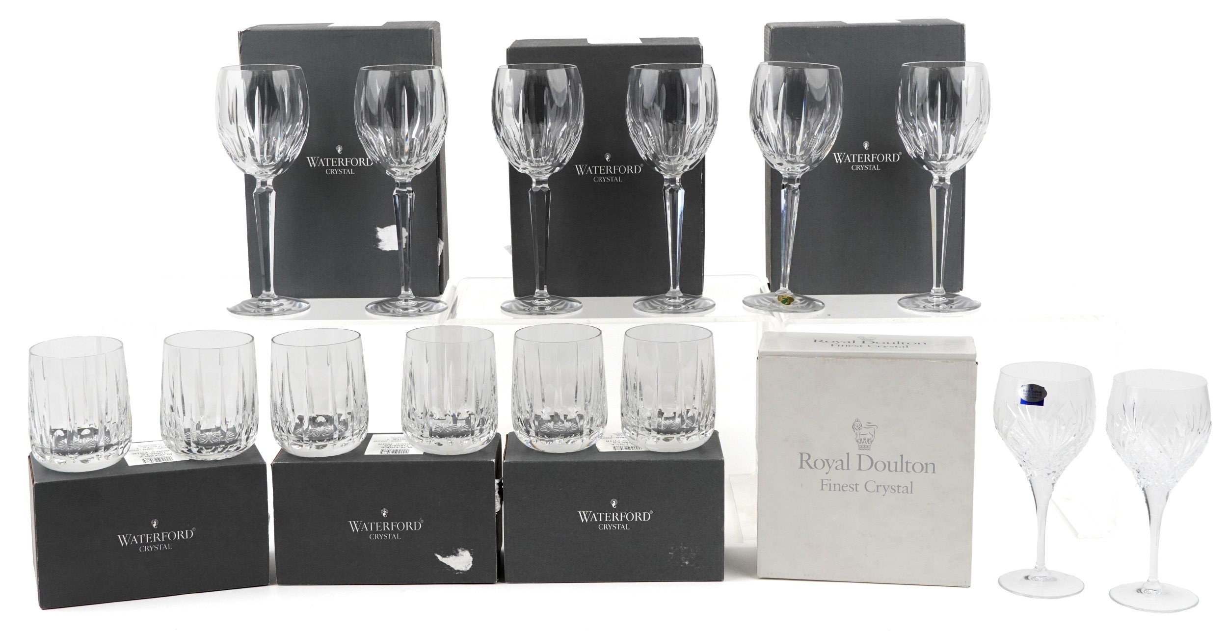 A collection of Waterford Crystal glasses comprising flutes, tumblers and goblets, unused and boxed, together with a pair of Royal Doulton Finest Crystal wine glasses, boxed.