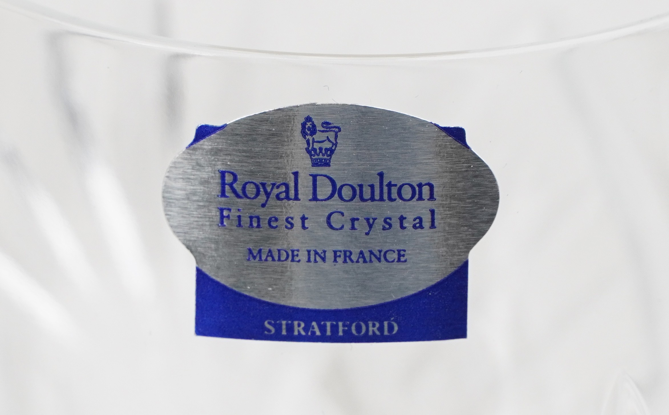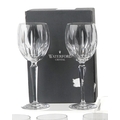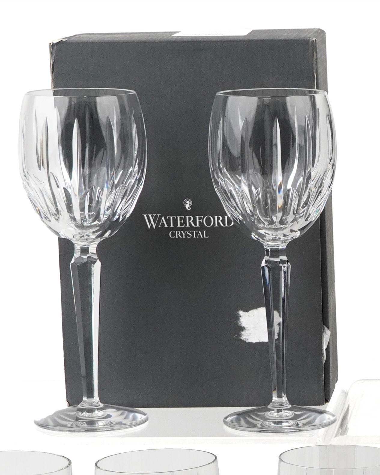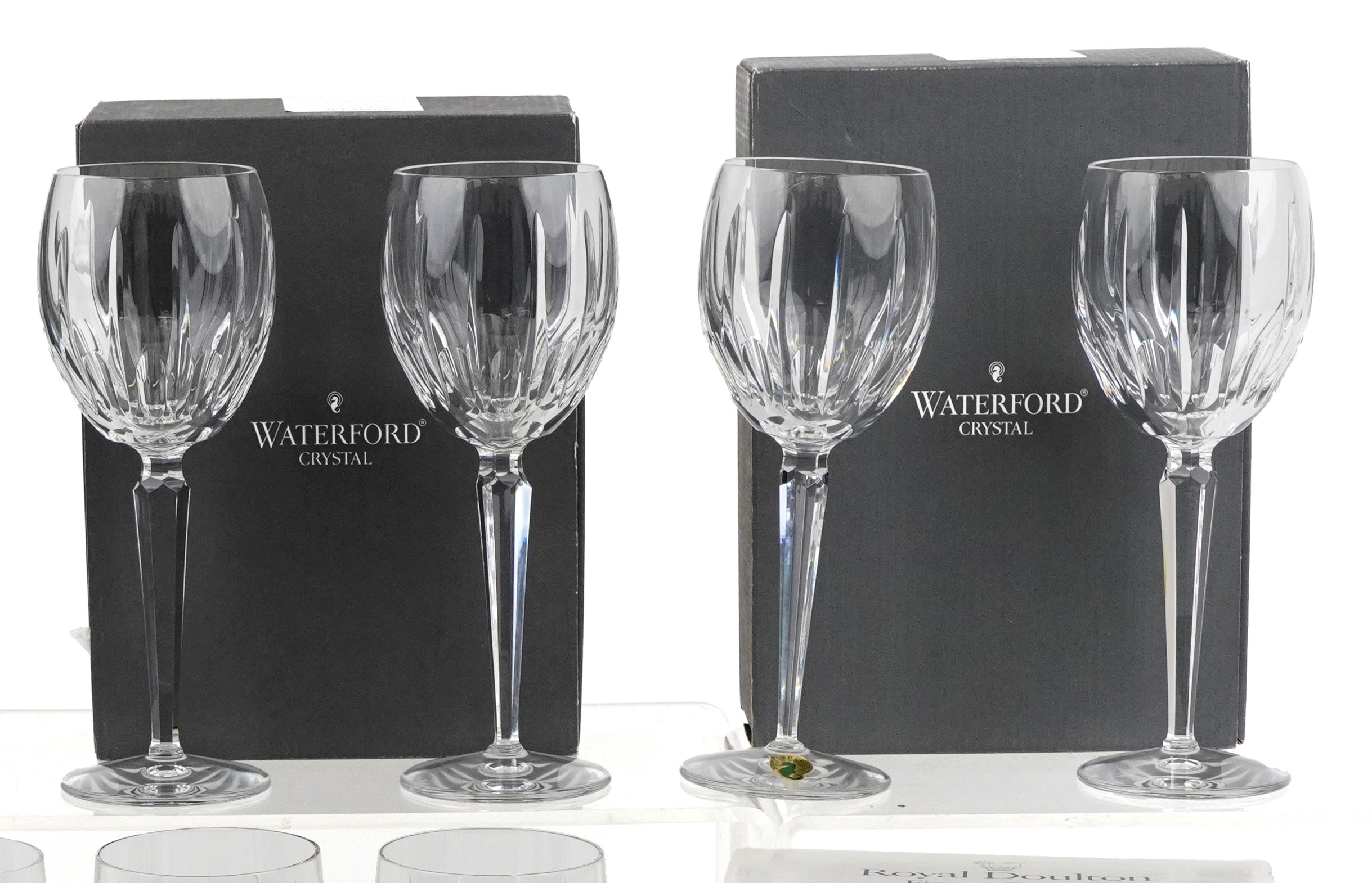 A collection of Waterford Crystal glasses comprising flutes, tumblers and goblets, unused and boxed, together with a pair of Royal Doulton Finest Crystal wine glasses, boxed.
