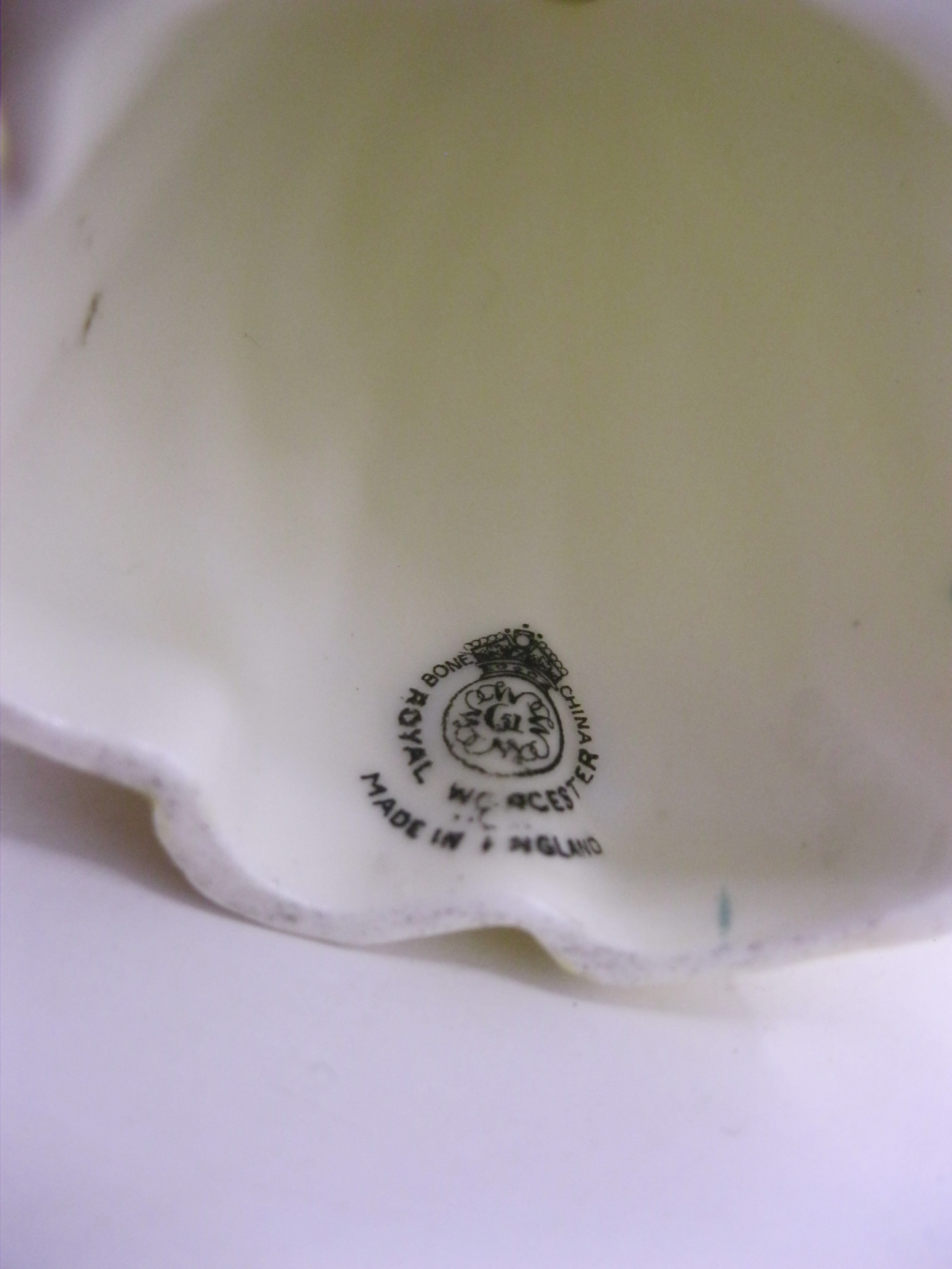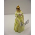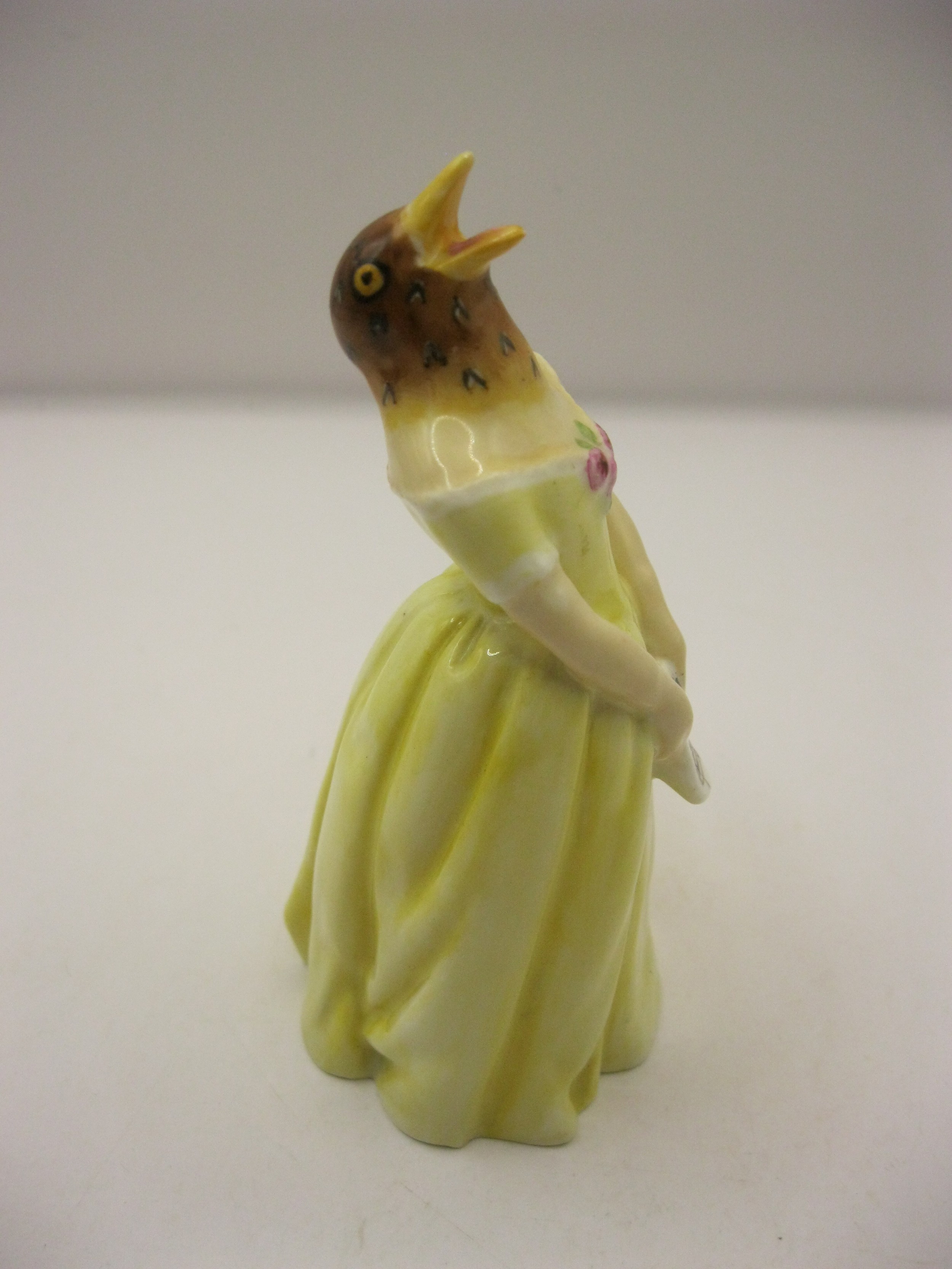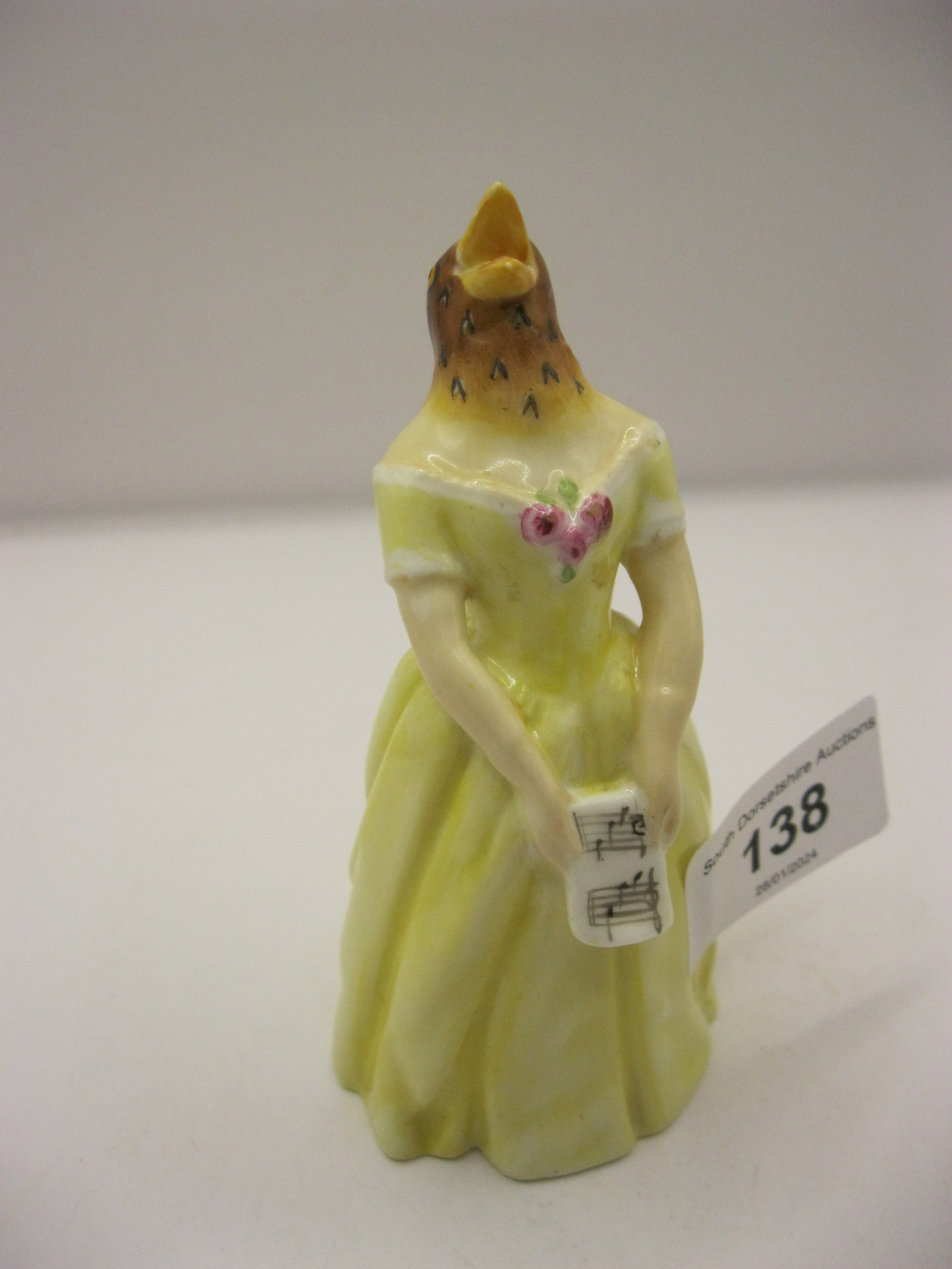Royal Worcester candle snuffer or extinguisher 'Jenny Lind', modelled as woman in yellow dress with bird's head holding song sheet, black factory transfer mark, painted number 27, height 11cm