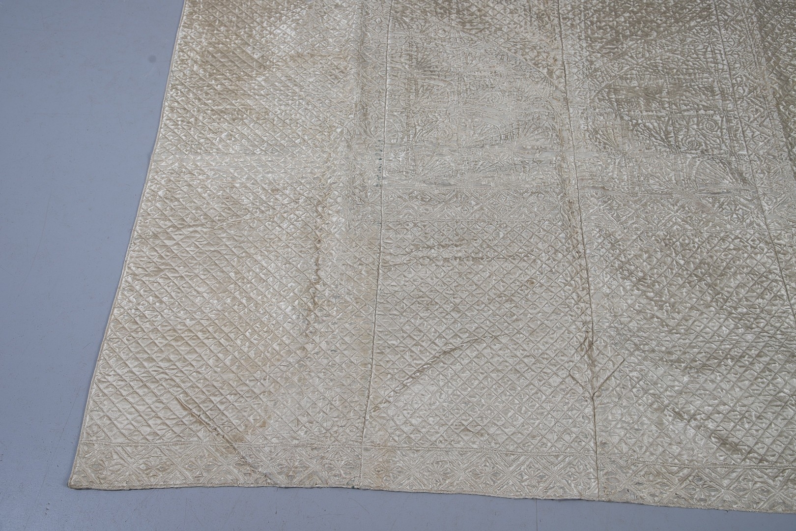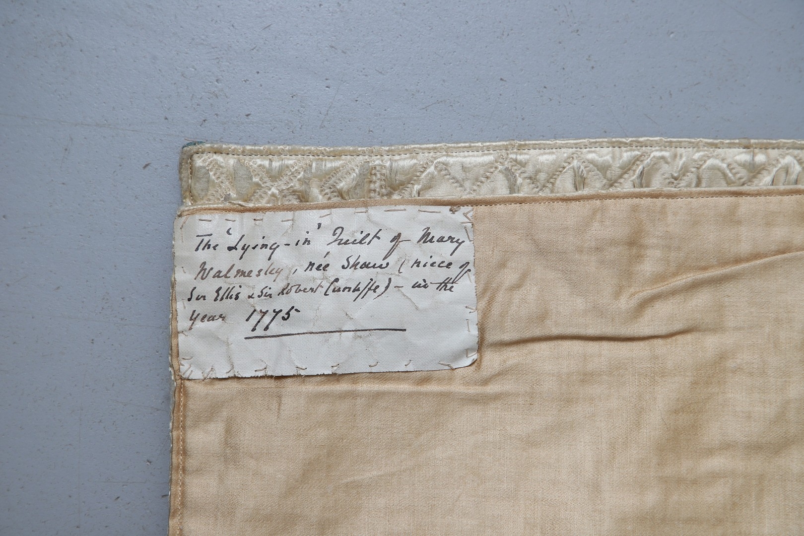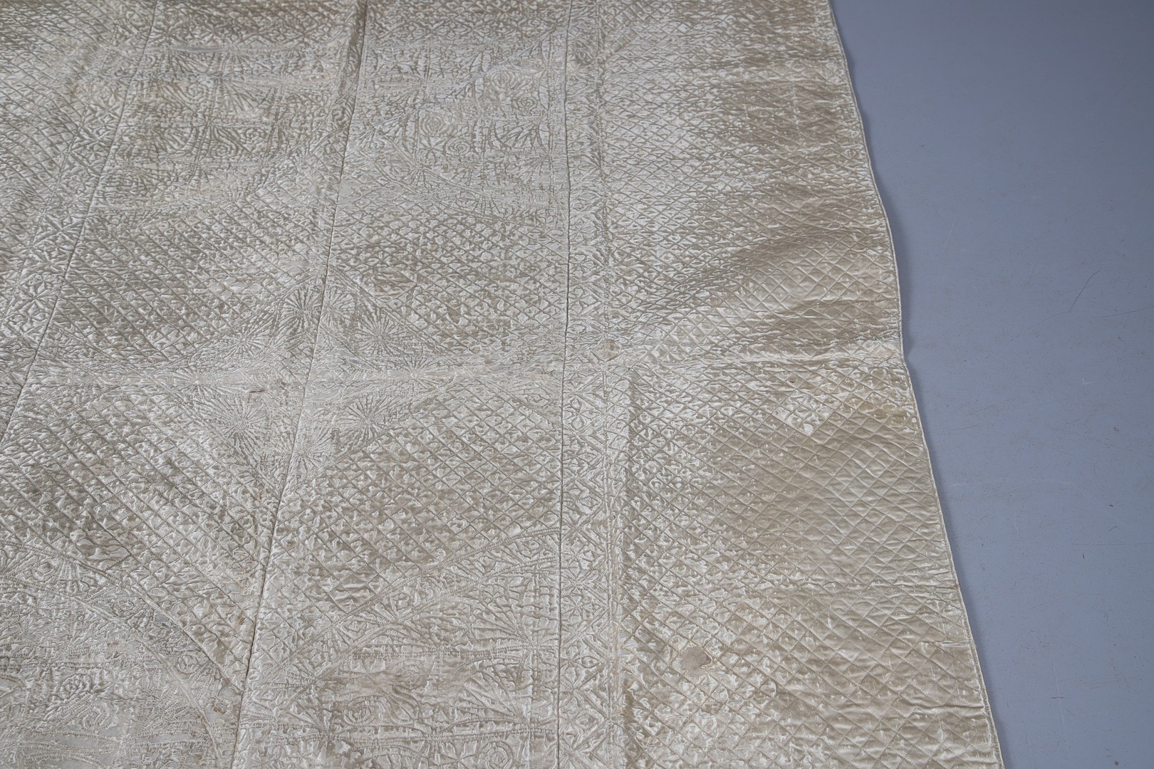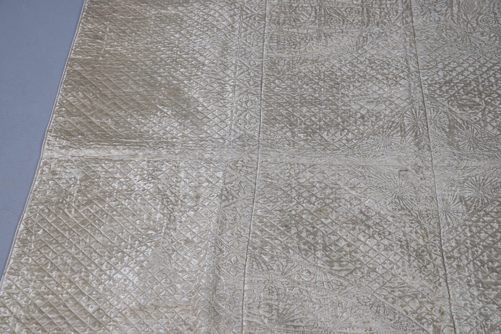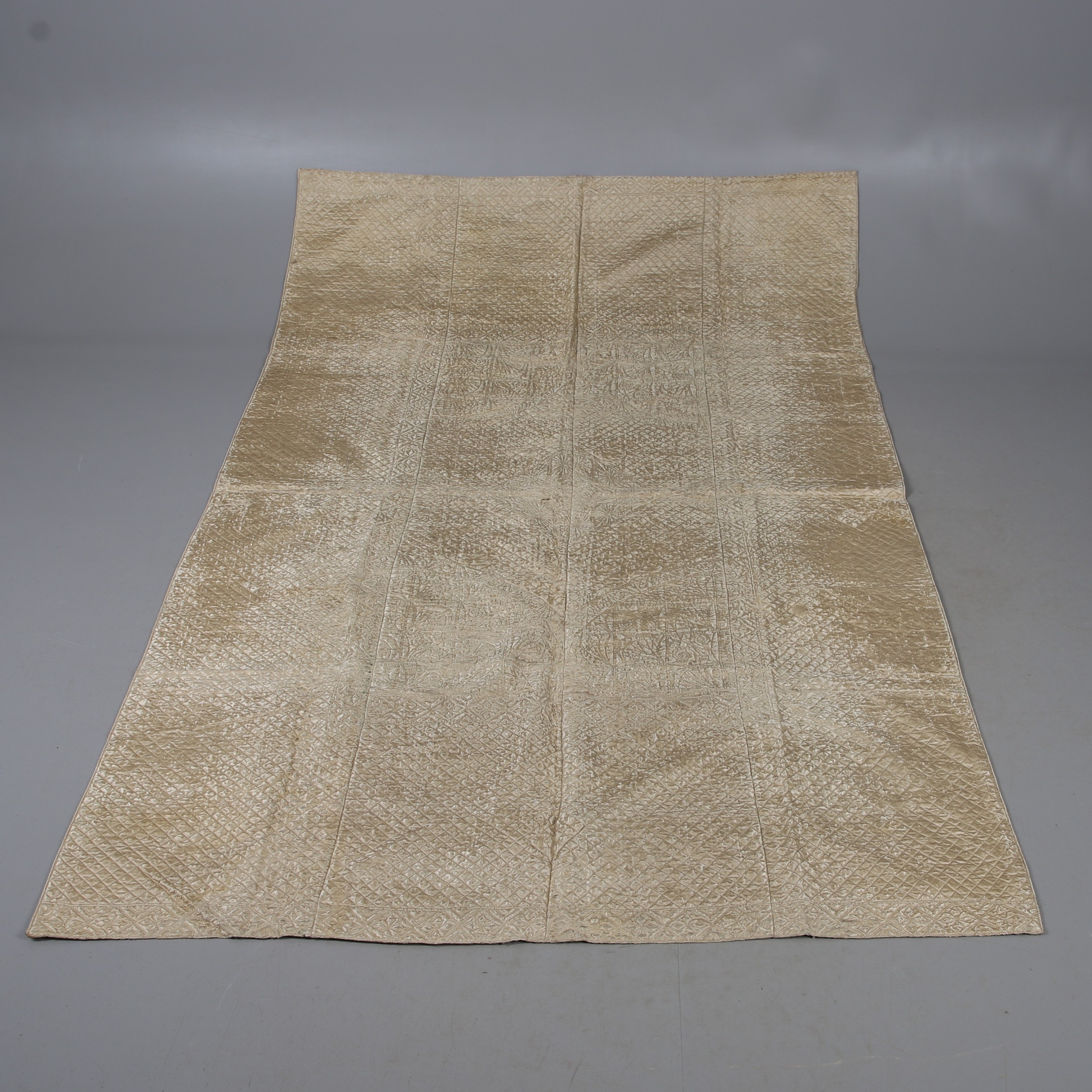 LATE 18THC SILK QUILTED BEDSPREAD - DATED 1775. The silk quilted bedspread made in 4 long sections, with foliate and other motifs. With a hand written label to the reverse dated 1775, and provenance to the Walmesley Family (approx 250cms by 158cms)