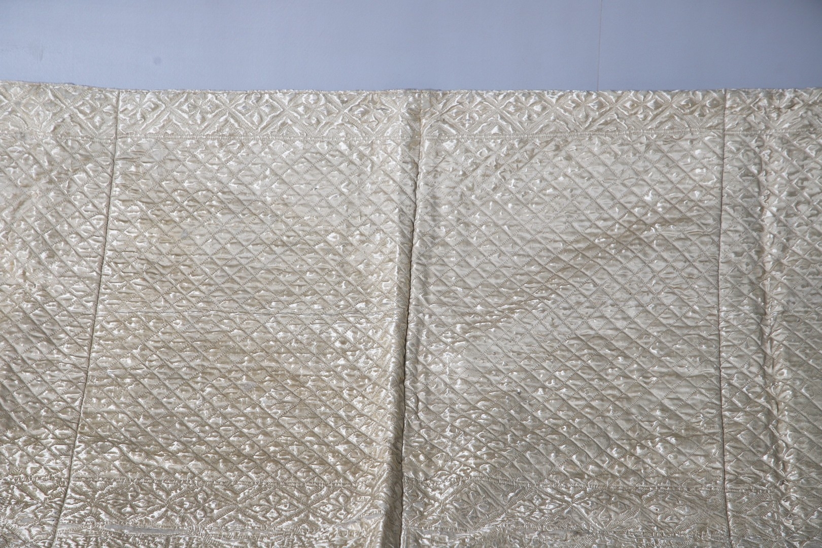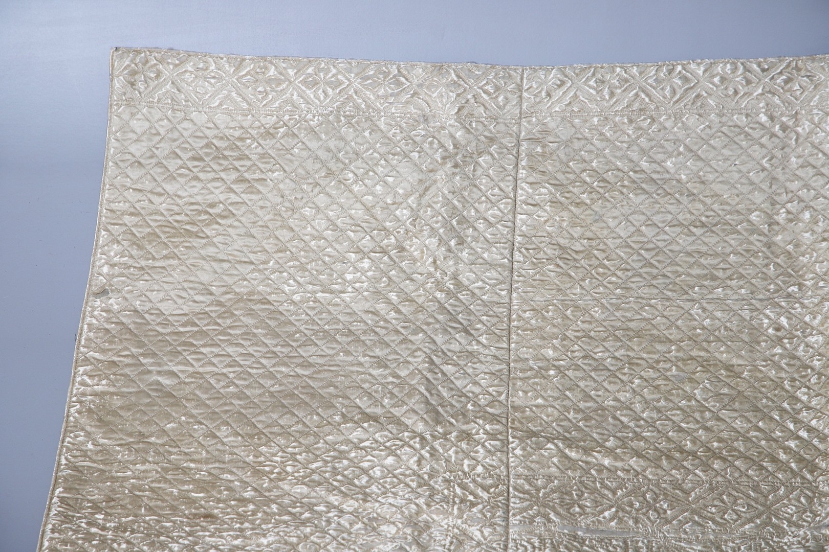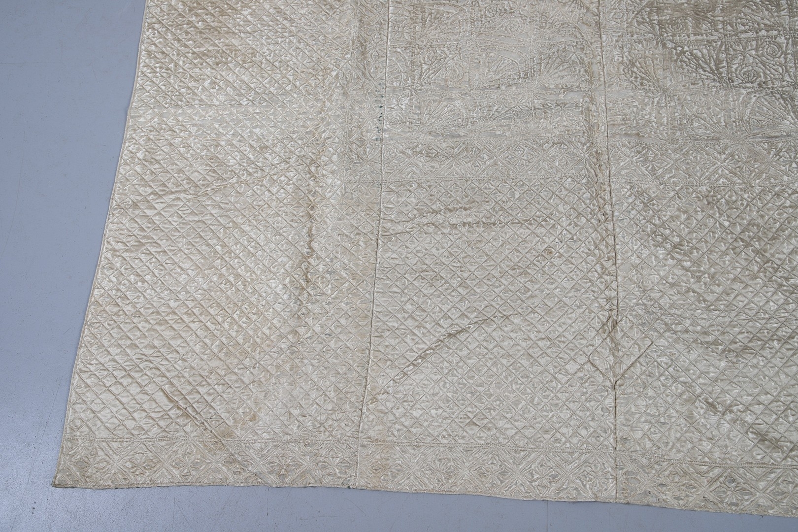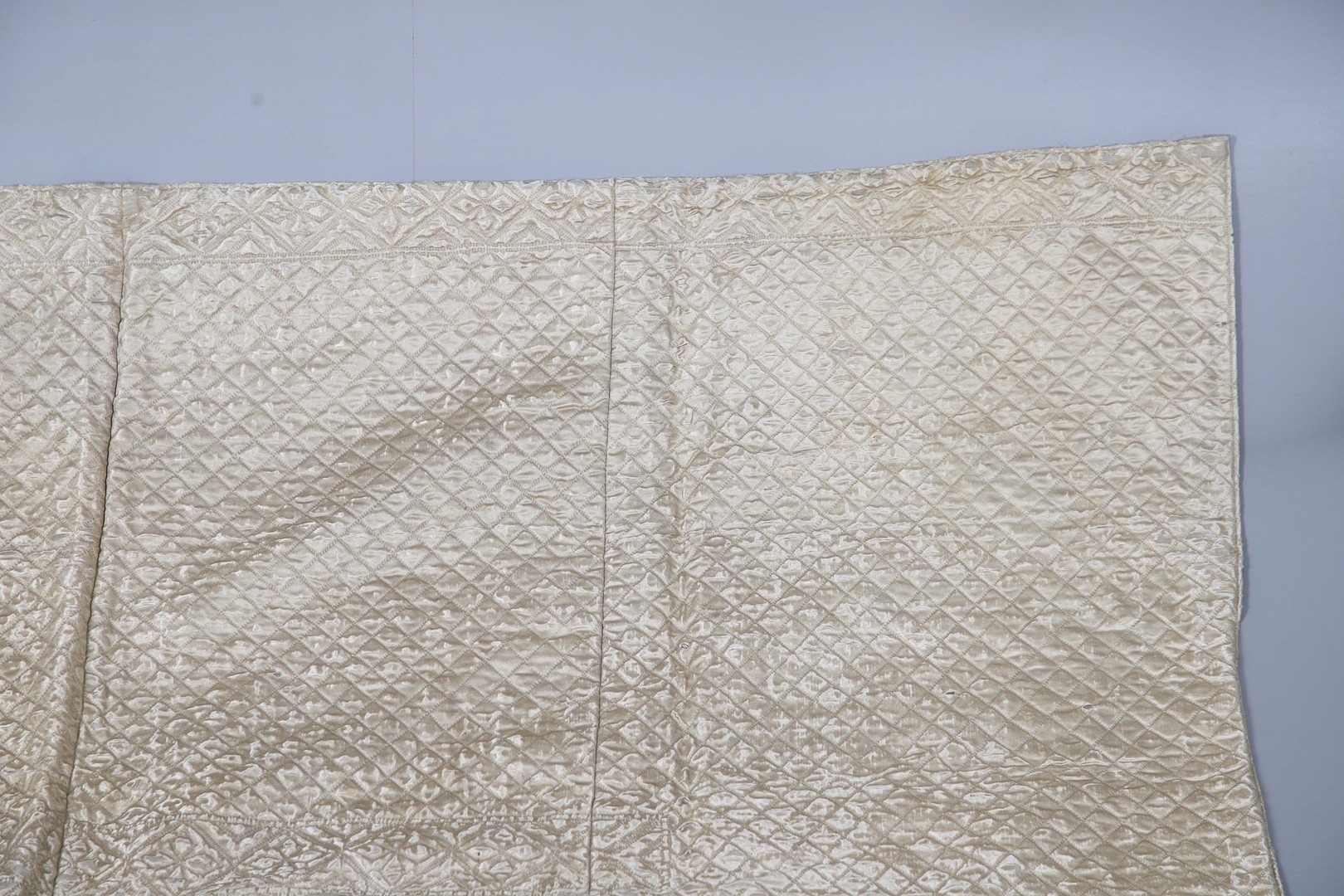 LATE 18THC SILK QUILTED BEDSPREAD - DATED 1775. The silk quilted bedspread made in 4 long sections, with foliate and other motifs. With a hand written label to the reverse dated 1775, and provenance to the Walmesley Family (approx 250cms by 158cms)