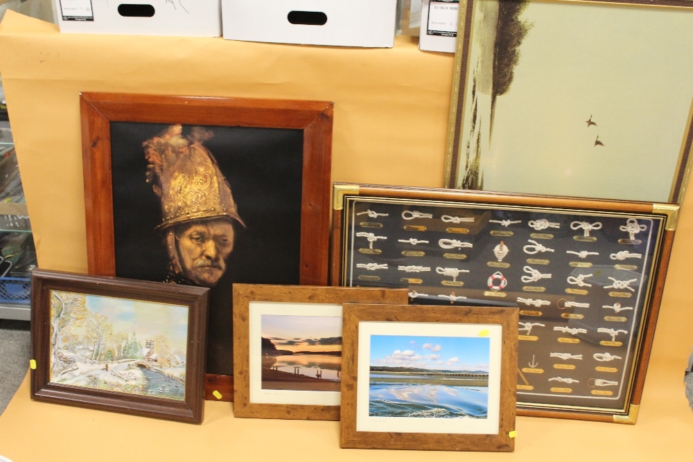 A COLLECTION OF PICTURES AND PRINTS TO INCLUDE SIGNED PRINTS, OIL ON BOARD ETC, TOGETHER WITH A FRAMED AND GLAZED KNOT DISPLAY (6)