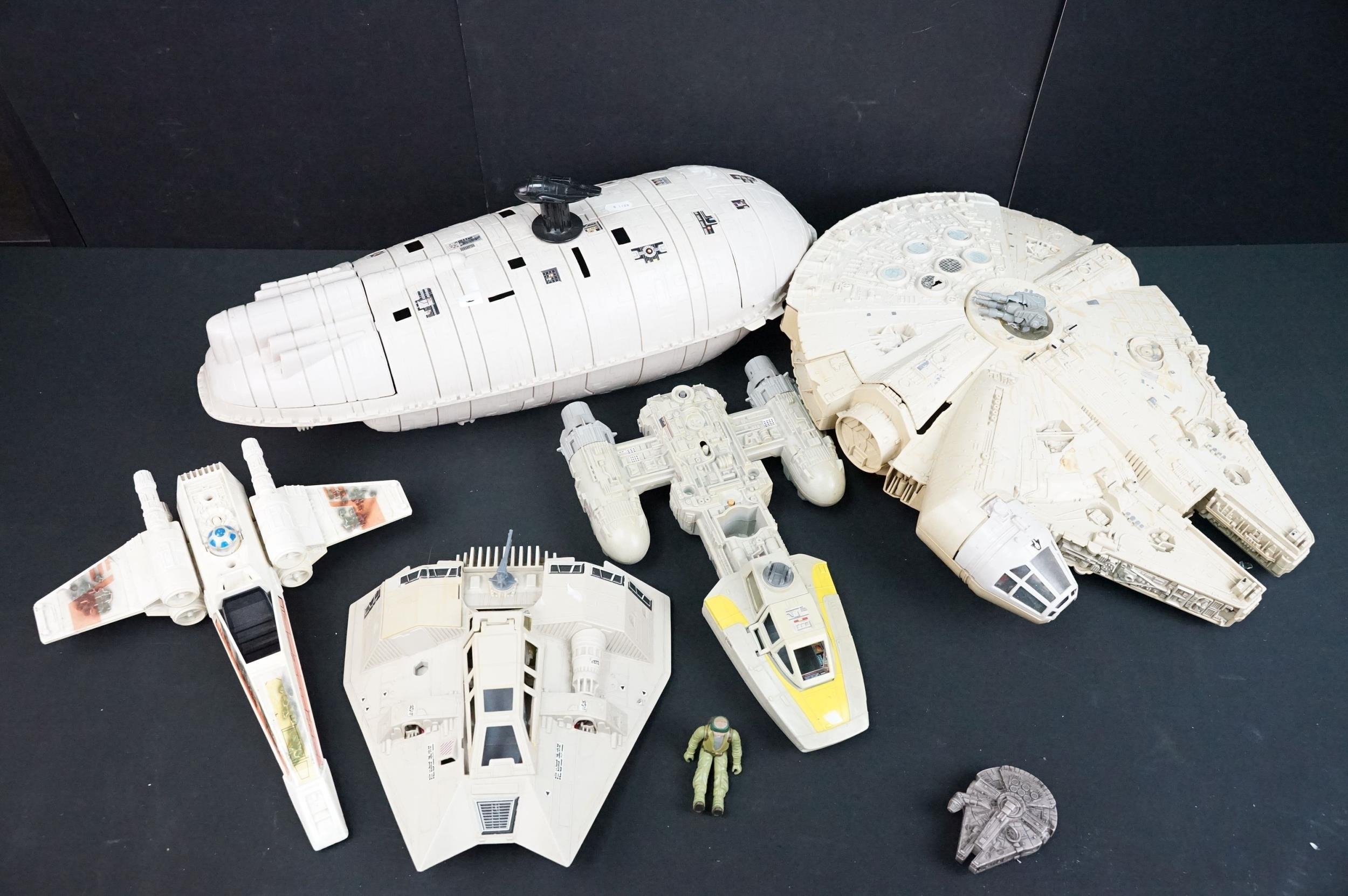 Star Wars - Five original Star Wars vehicles featuring Rebel Transport, Rebel Armored Snowspeeder, X-Wing Fighter, Y-Wing Fighter & Millennium Falcon in playworn condition