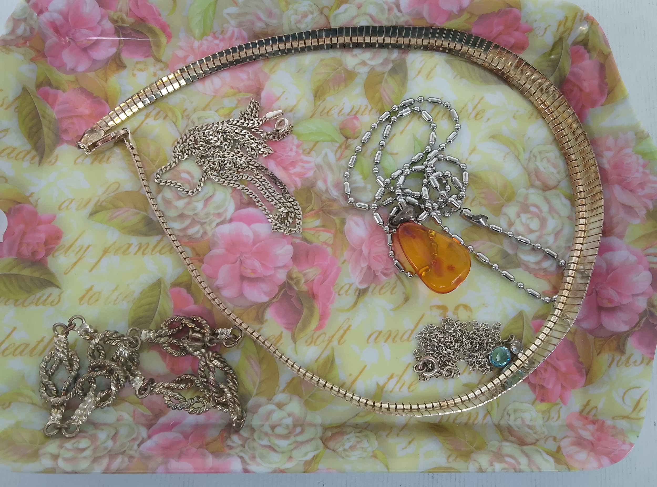 Four silver stamped necklaces and bracelet