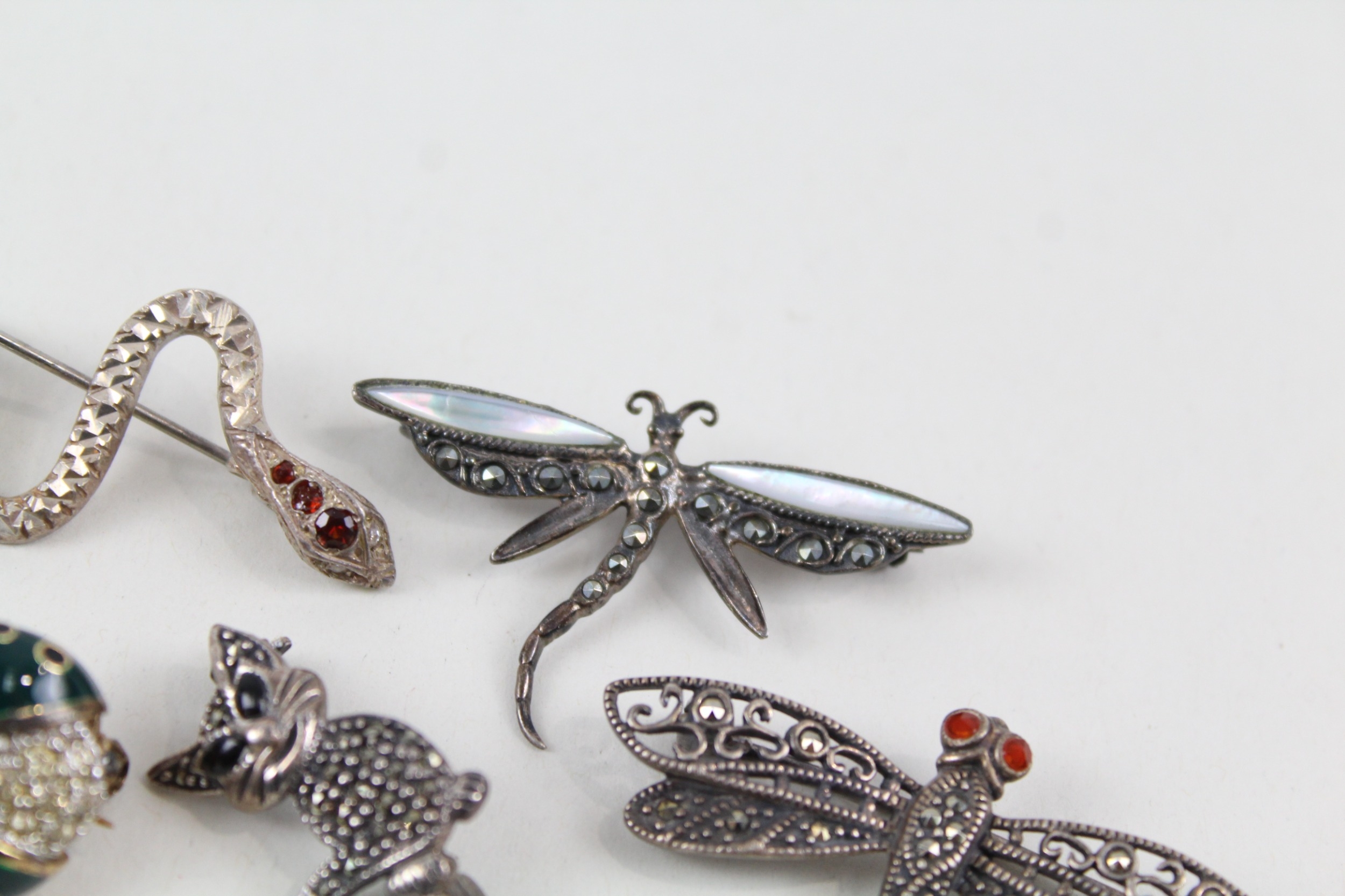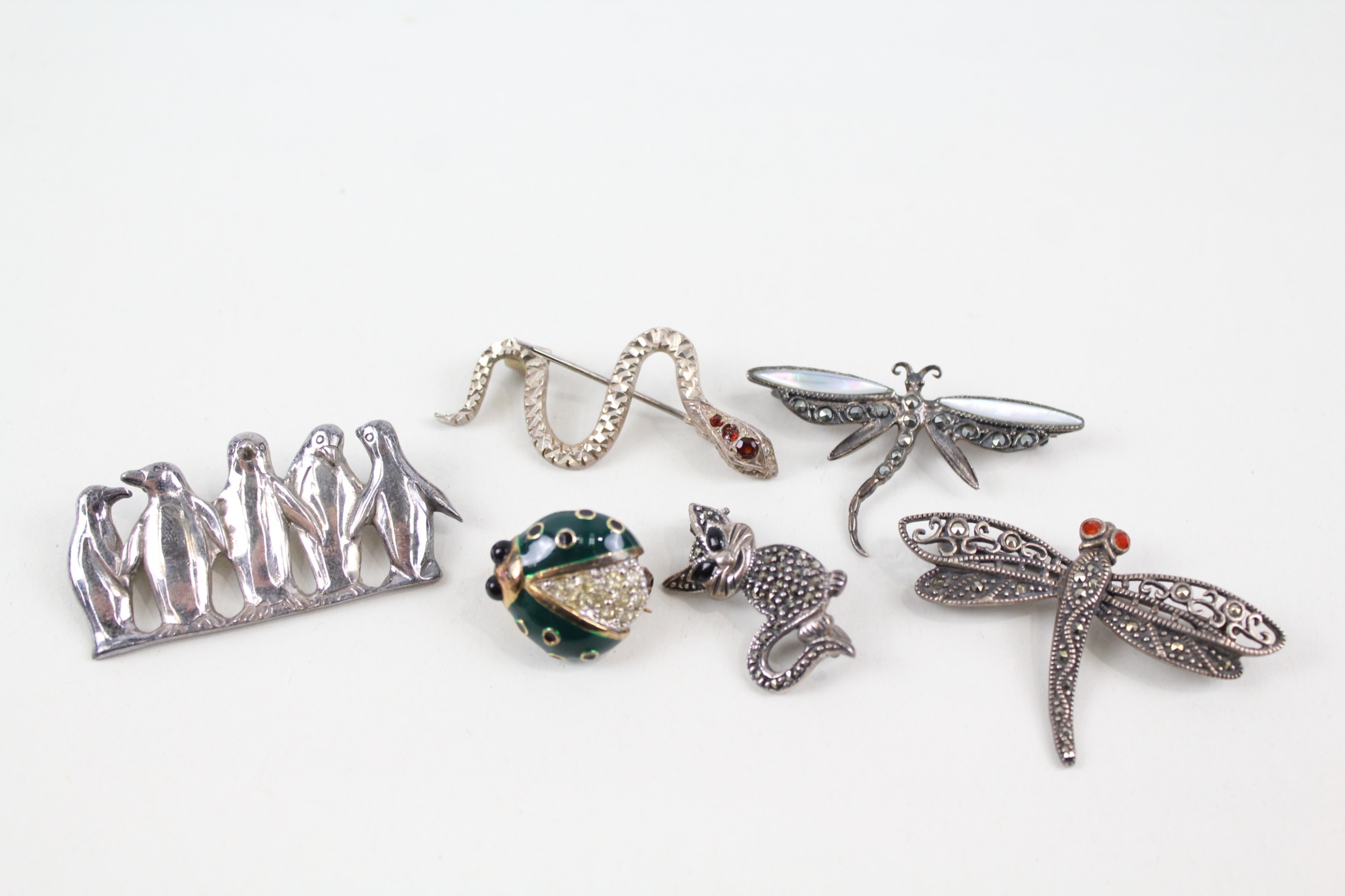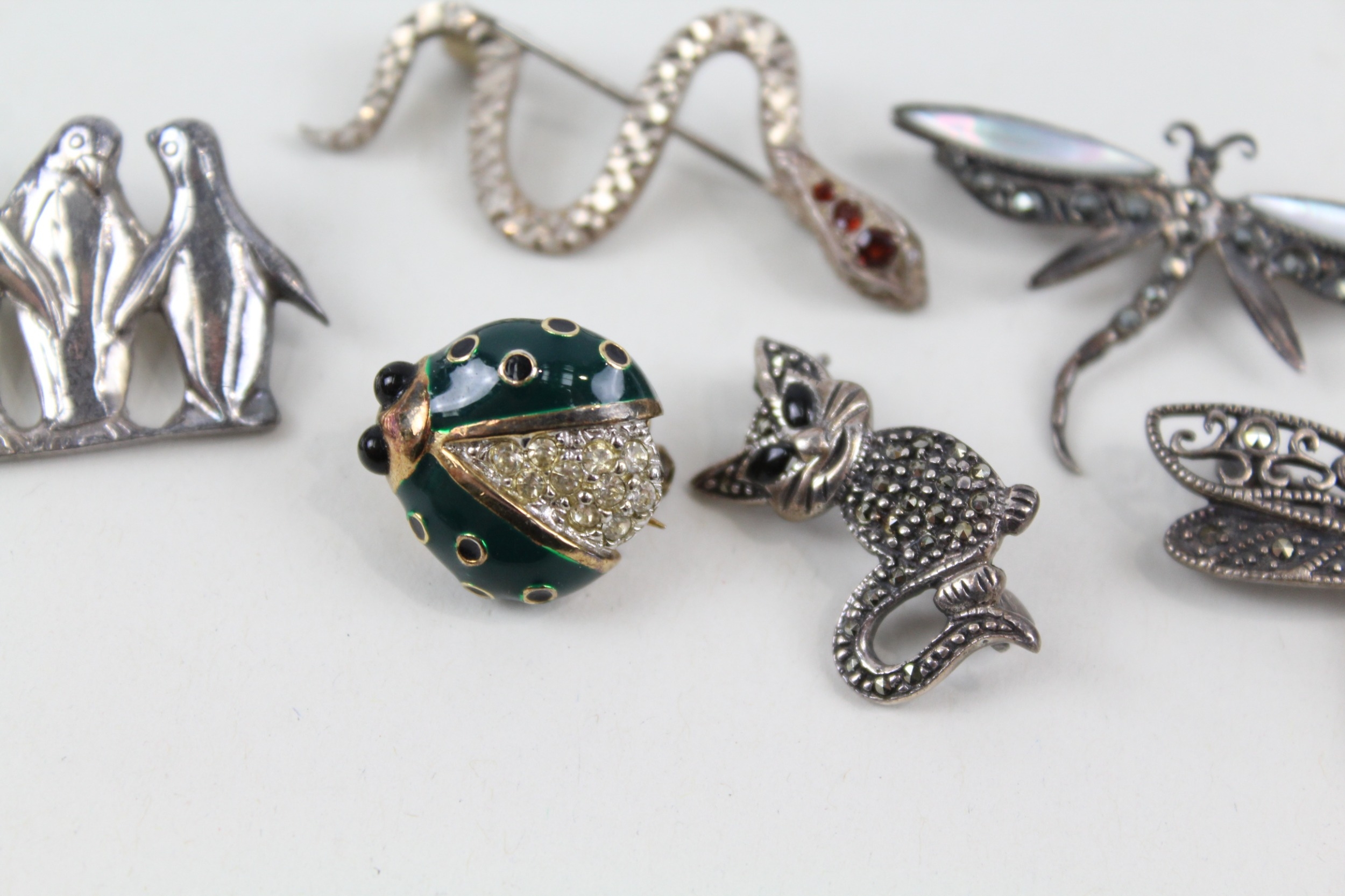 Collection of Sterling Silver Animal Brooches inc. Marcasite, Enamel x 6 27g