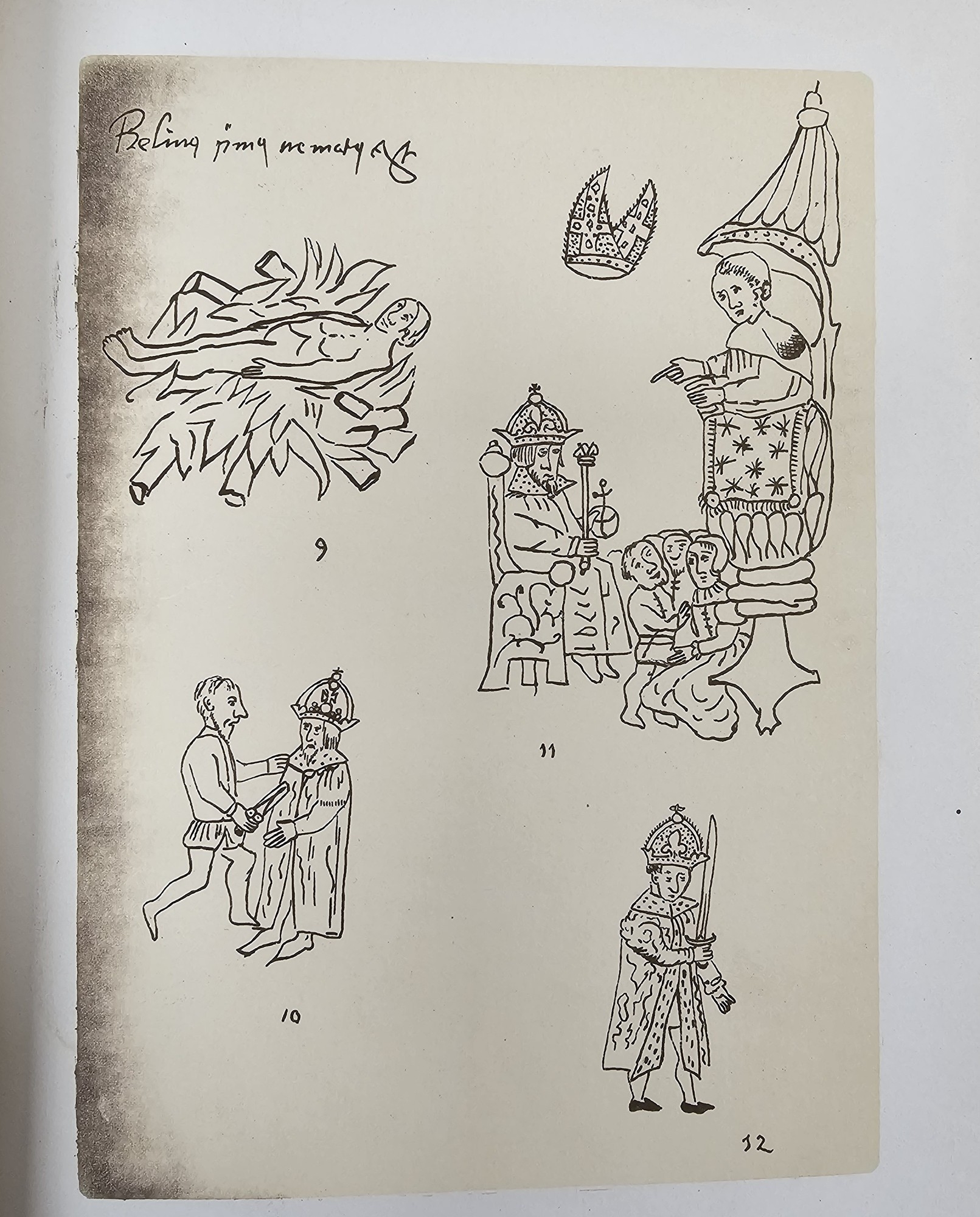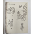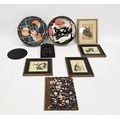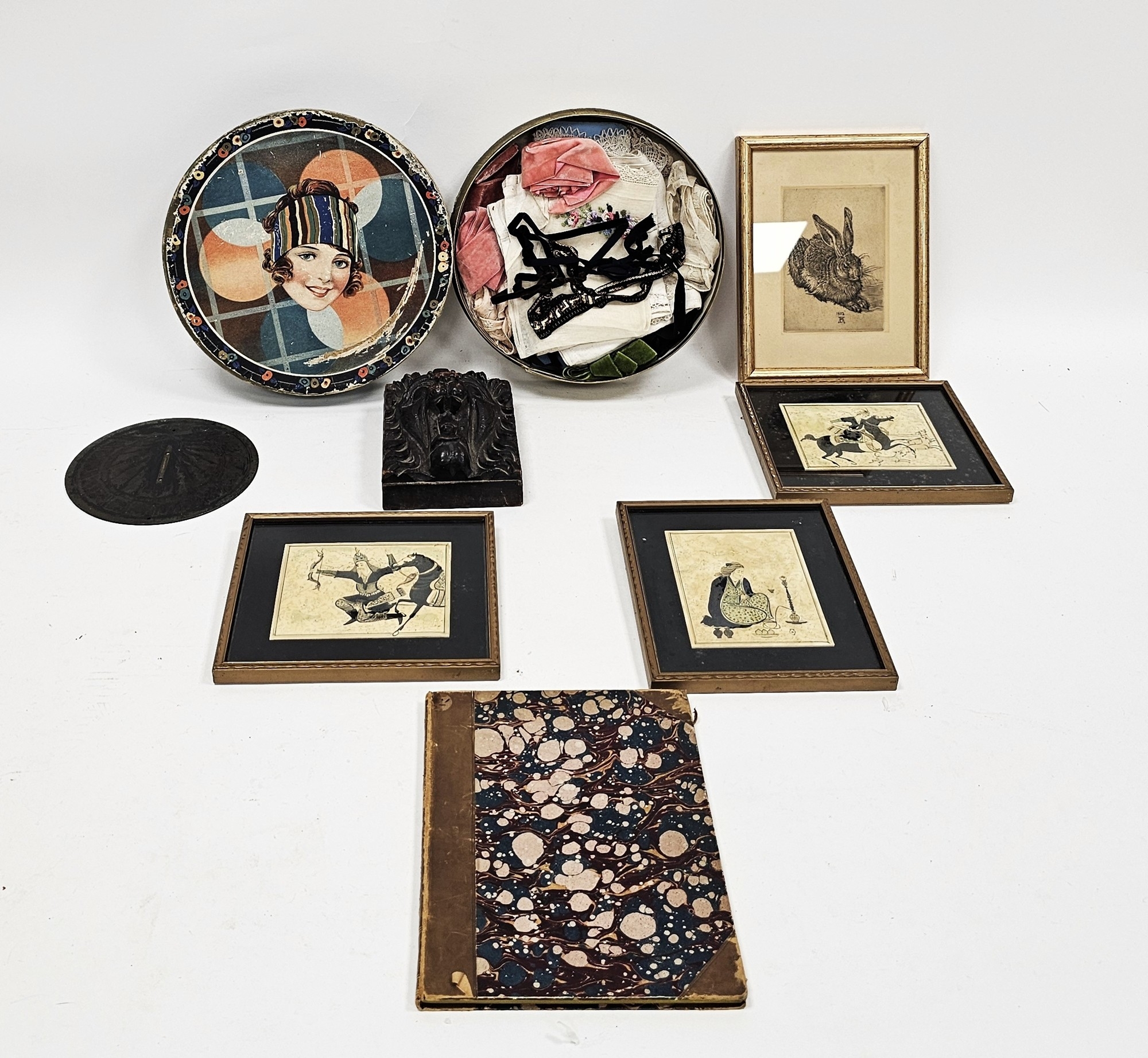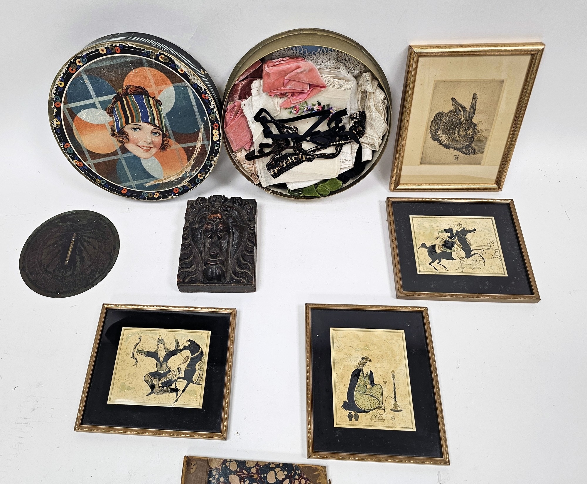 Collection of items including an antique oak panel carved in relief with a lion mask, sketches by Polydore Vergil leather bound book, a 1920's Rowntrees cardboard chocolate box with various materials, a brass sundial (damaged), a Durer print of a young hare and three small Persian scene prints