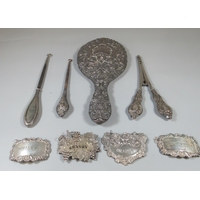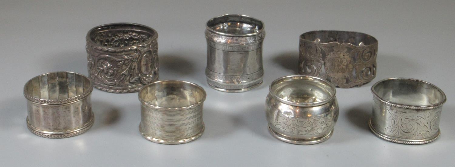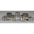Collection of seven silver napkins rings, some with ornate decoration. 5.1oz troy approx.