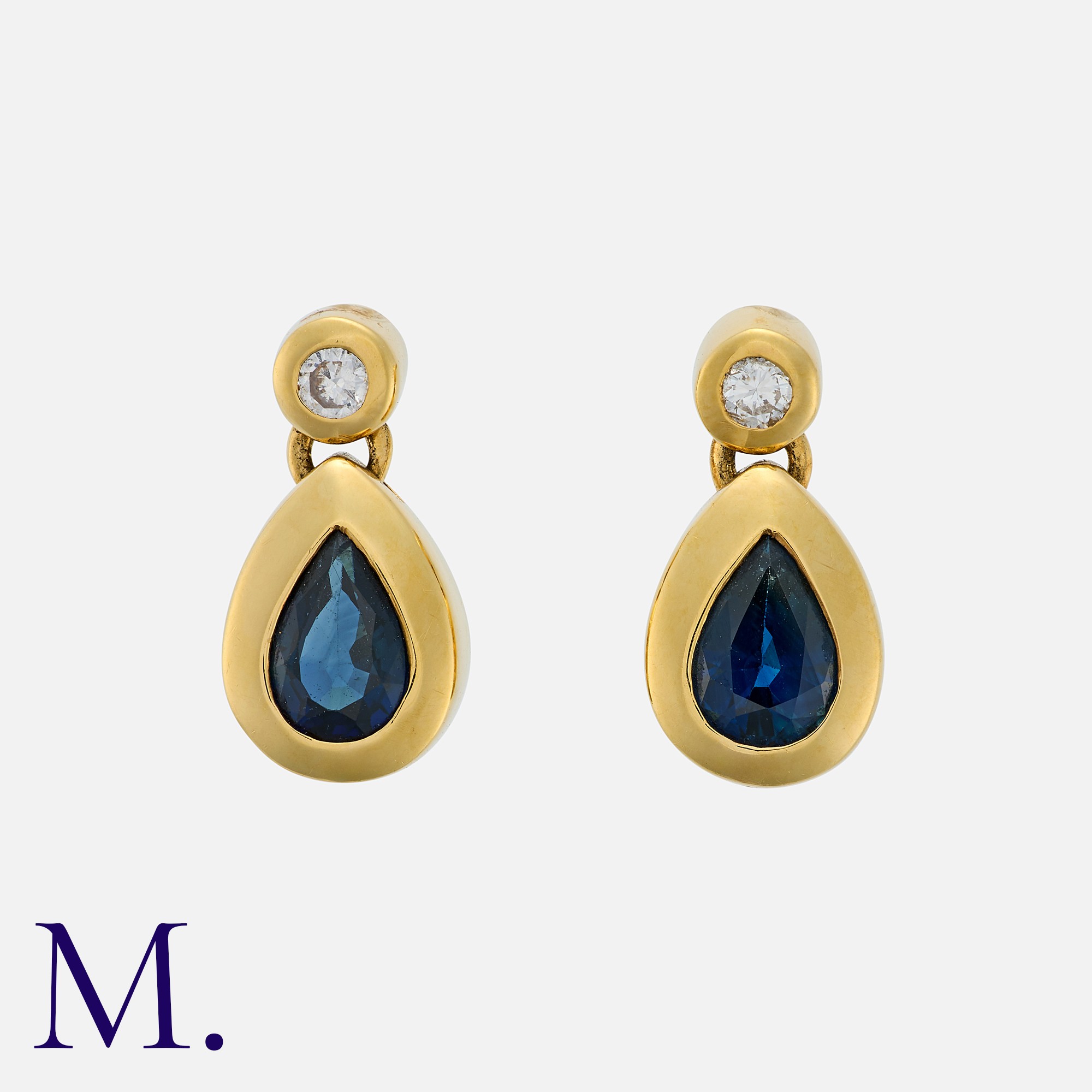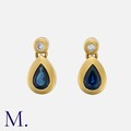 A Pair Of Sapphire And Diamond Drop Earrings in 18k yellow gold, each set with a pear shape sapphire below a round cut diamond. Stamped 750 for 18 carat gold.