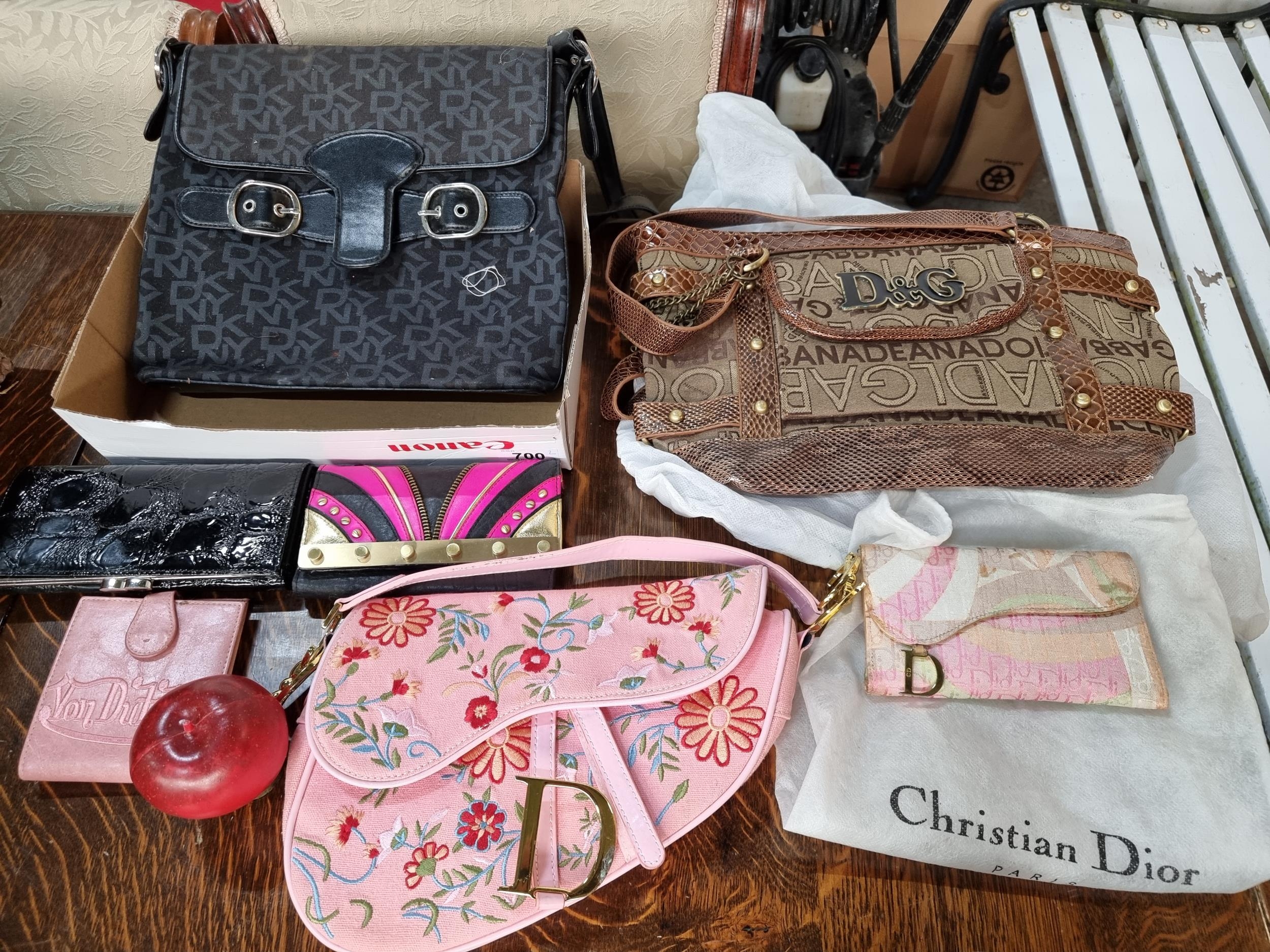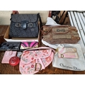 A box containing a nice variety of seven ladies purses and handbags in a range of styles and colours. Supplied with two dust covers for storage. Not sure about authenticity, judge for yourself and bid accordingly.