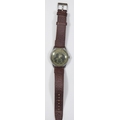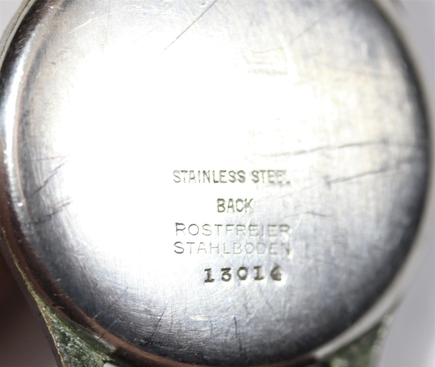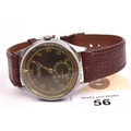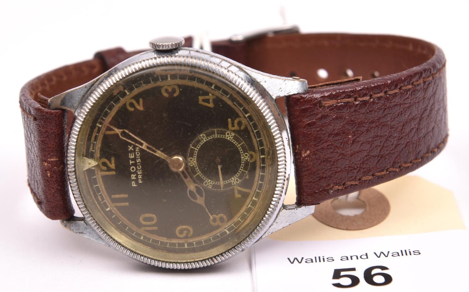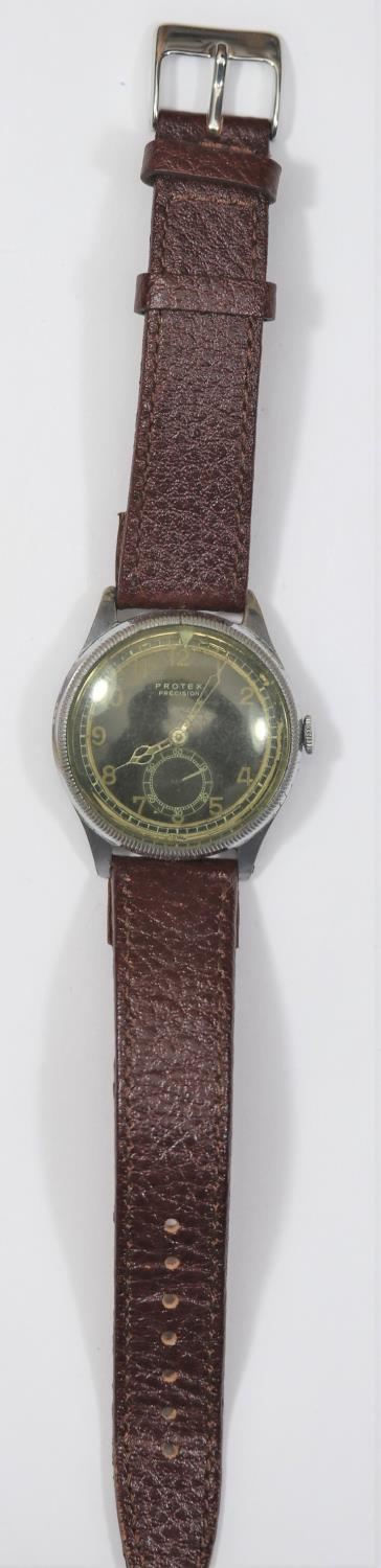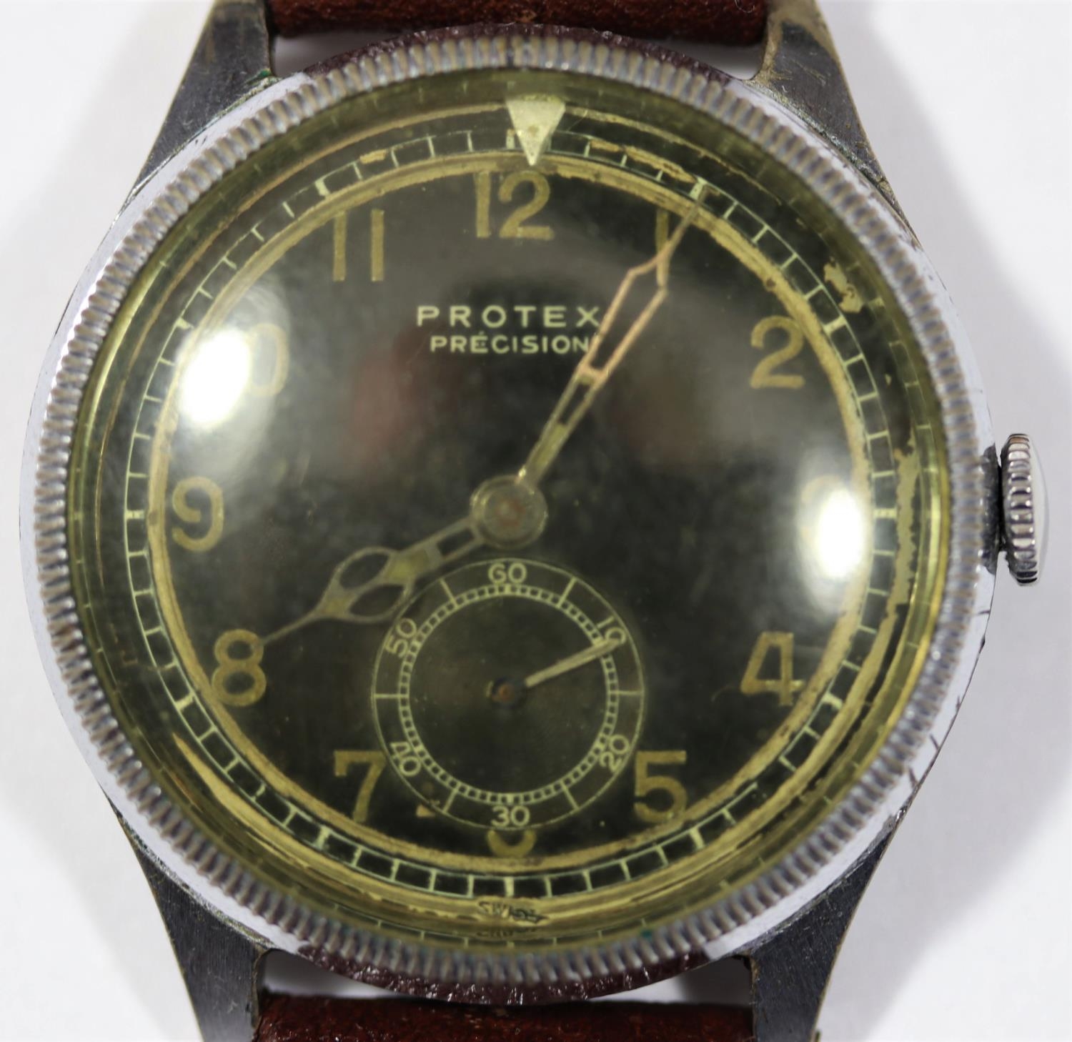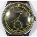 Protex "Precision" wristwatch with rotating outer bezel and pointer. Plated case, 35mm without crown, some wear to plating on lugs. Fixed strap bars. Snap caseback marked "stainless steel back, rostfreier, sthalboden." Black dial with luminous markers, damage around outer dial track. Hands missing luminous compound. 16 jewel movement marked Swiss, signed S.Kocher & Co. Running condition, marks and discolouration to movement plates, movement retaining screws replaced. GC