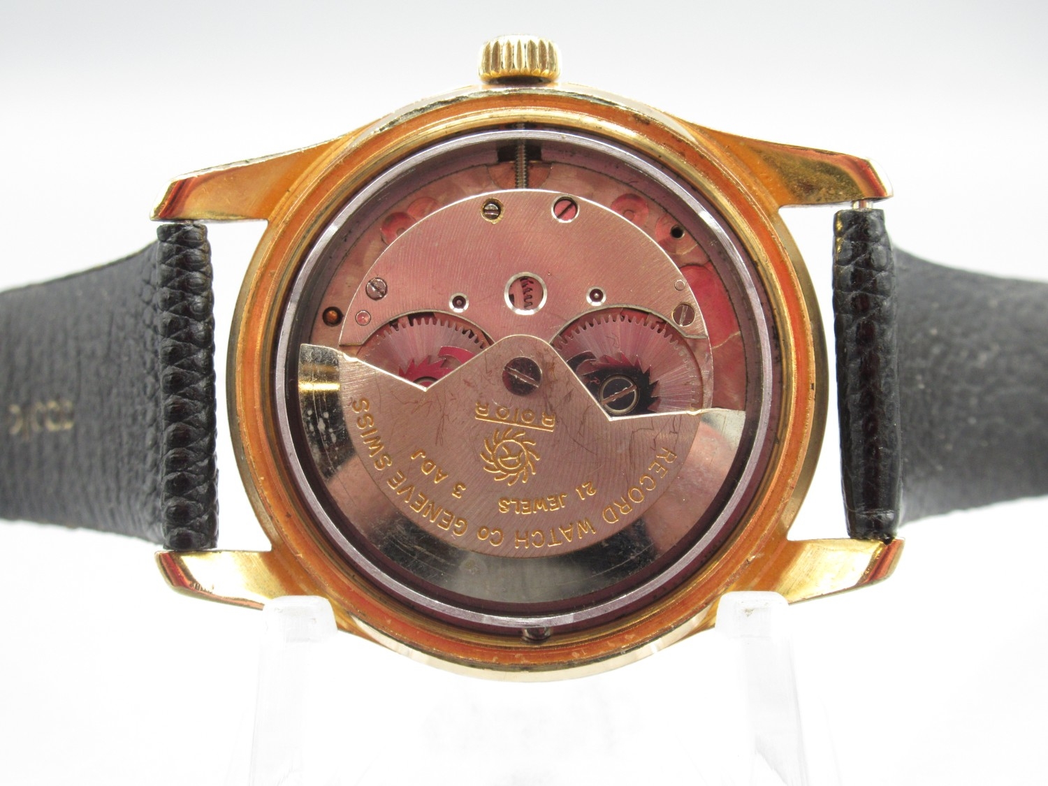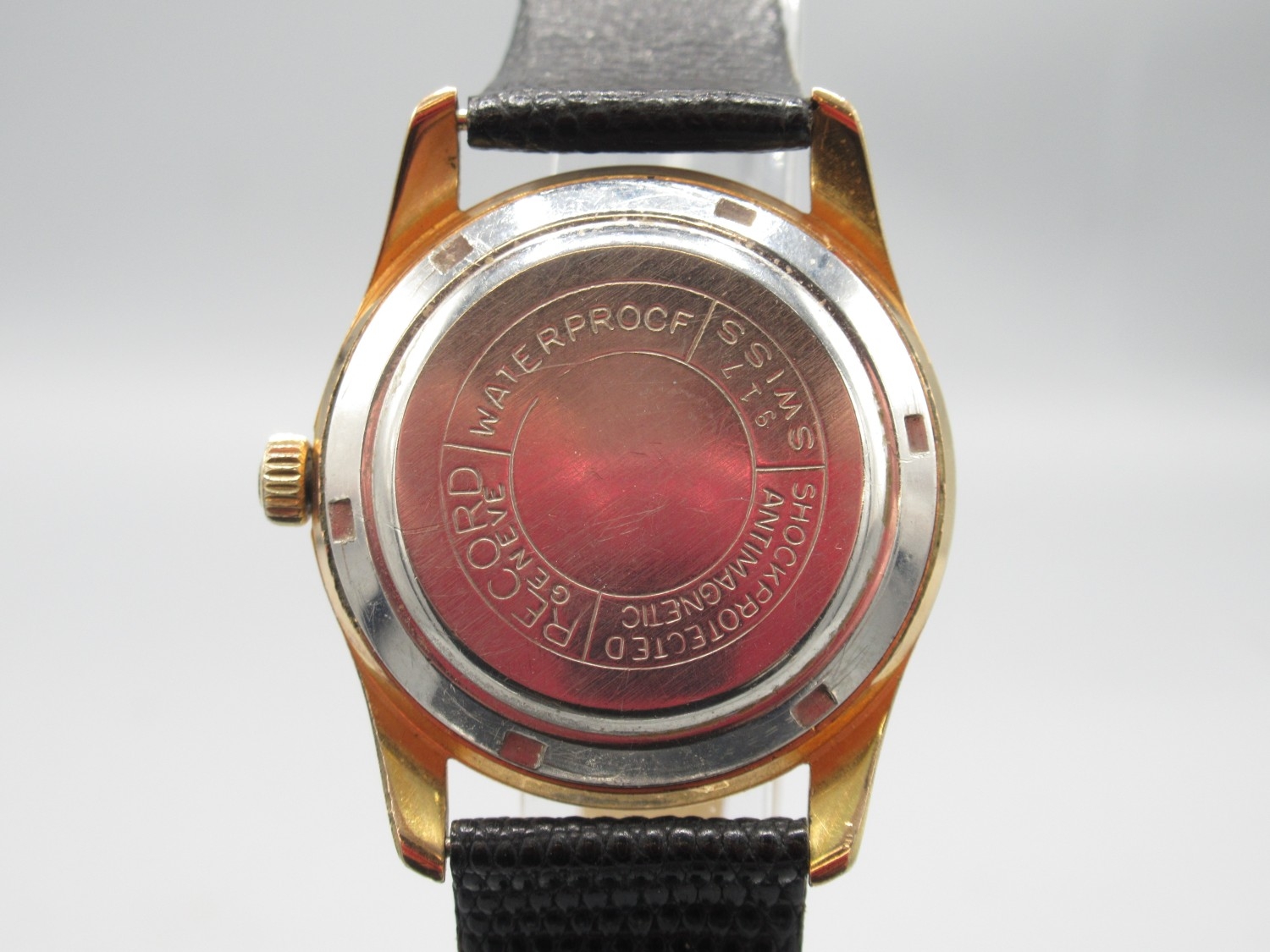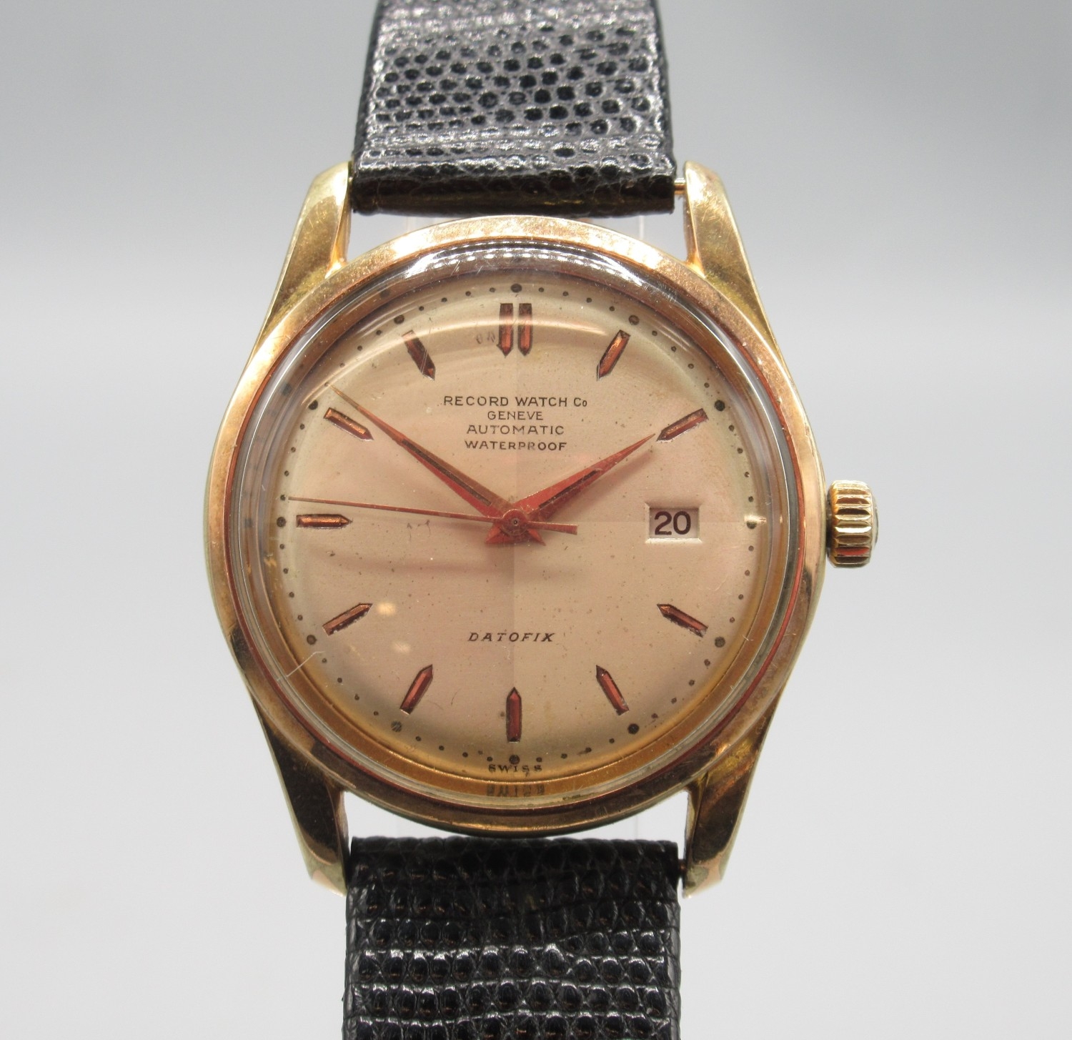 Record Watch Co., Datofix gold plated automatic wristwatch with date, signed silver sector dial with baton indices and centre seconds, signed screw on case back no. 917, inner case no. 1106907, Record 174 calibre 21 jewel movement adjusted to three positions, D35.5mm
