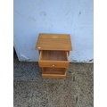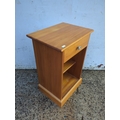This is a compact pine bedside table featuring a single drawer with a metallic knob, offering both functionality and a classic look. It has an open storage compartment underneath, ideal for keeping books or personal items. The table's natural pine finish complements any bedroom decor.