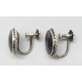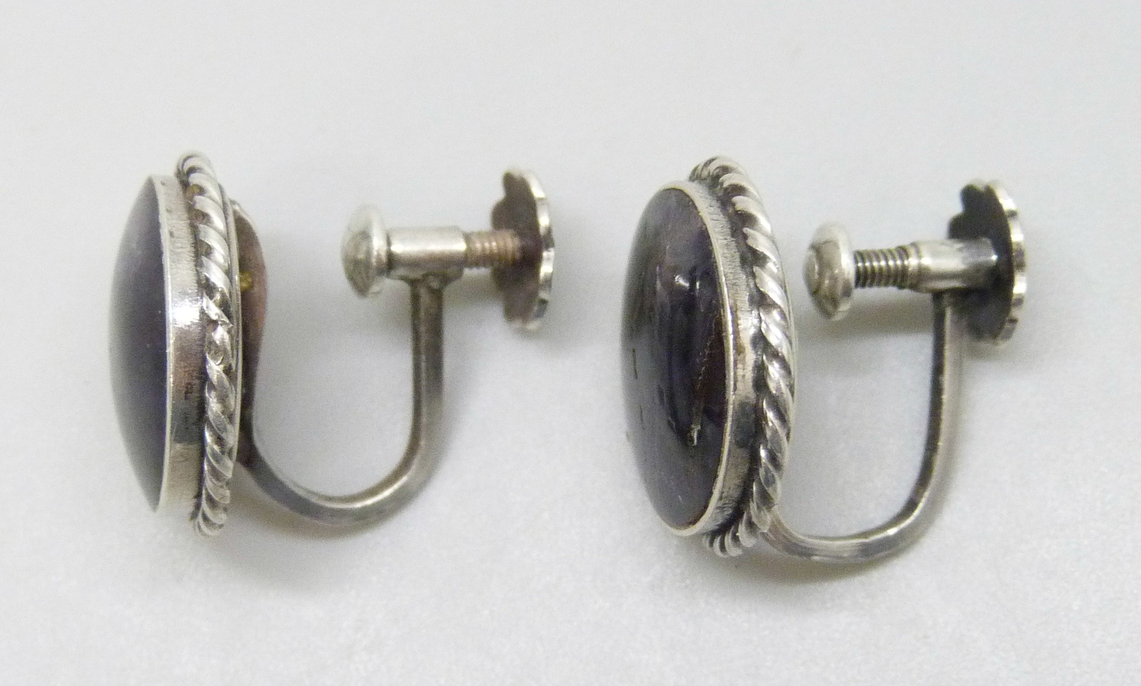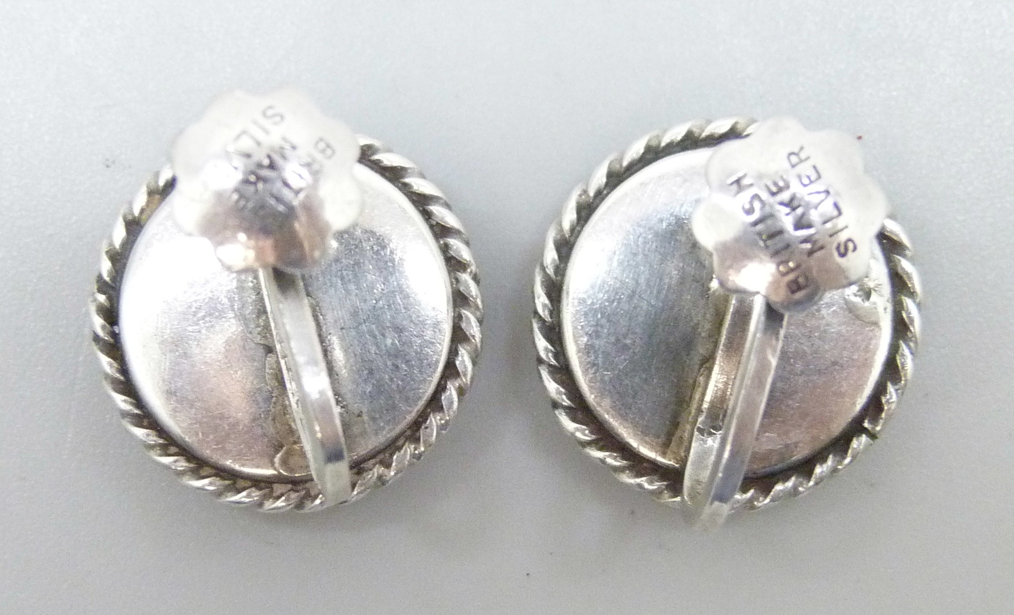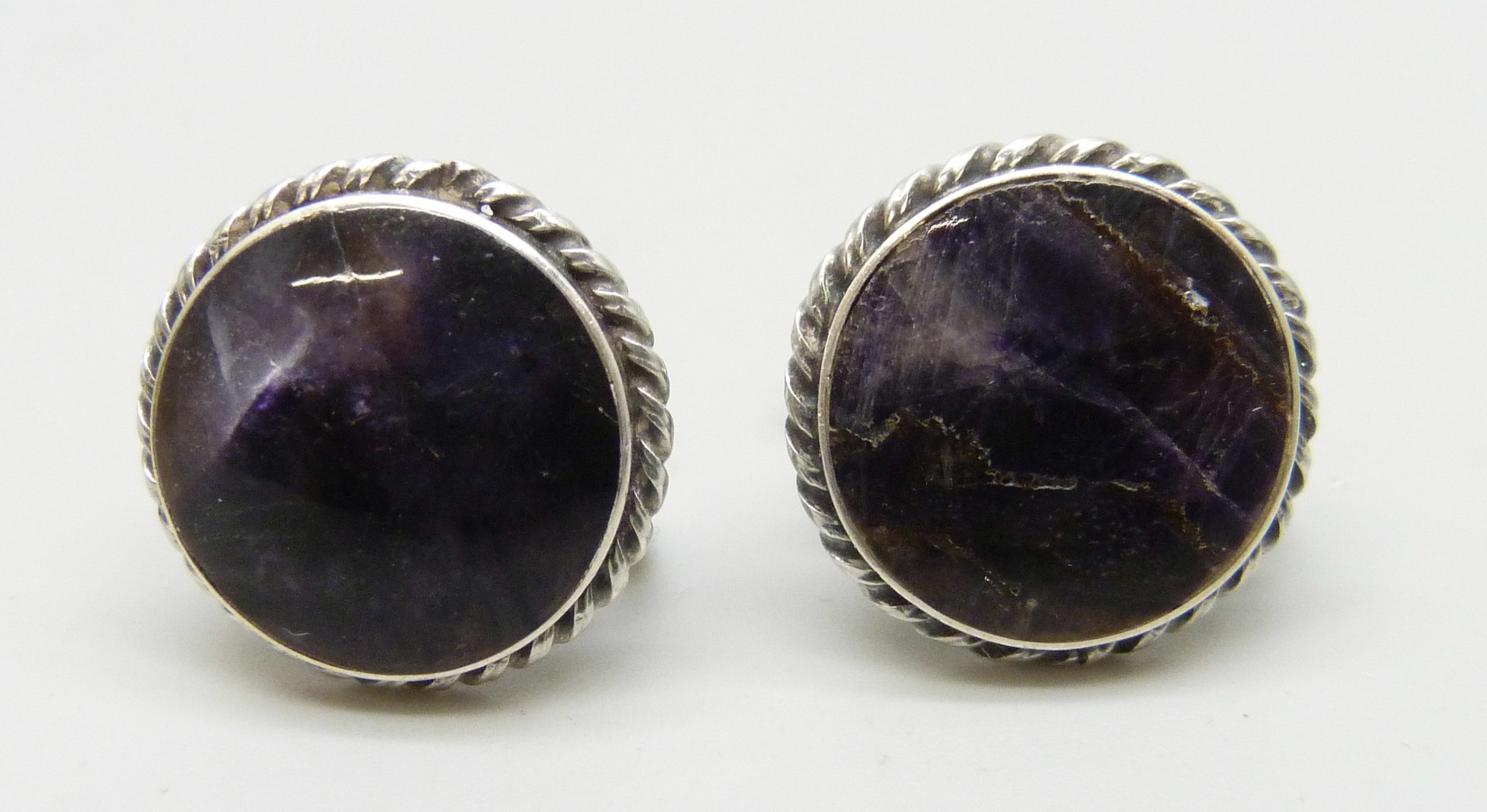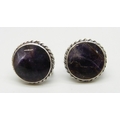 A pair of Blue John silver earrings with rope design border, marked ‘British Make, Sterling’, stones 1.3cm