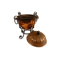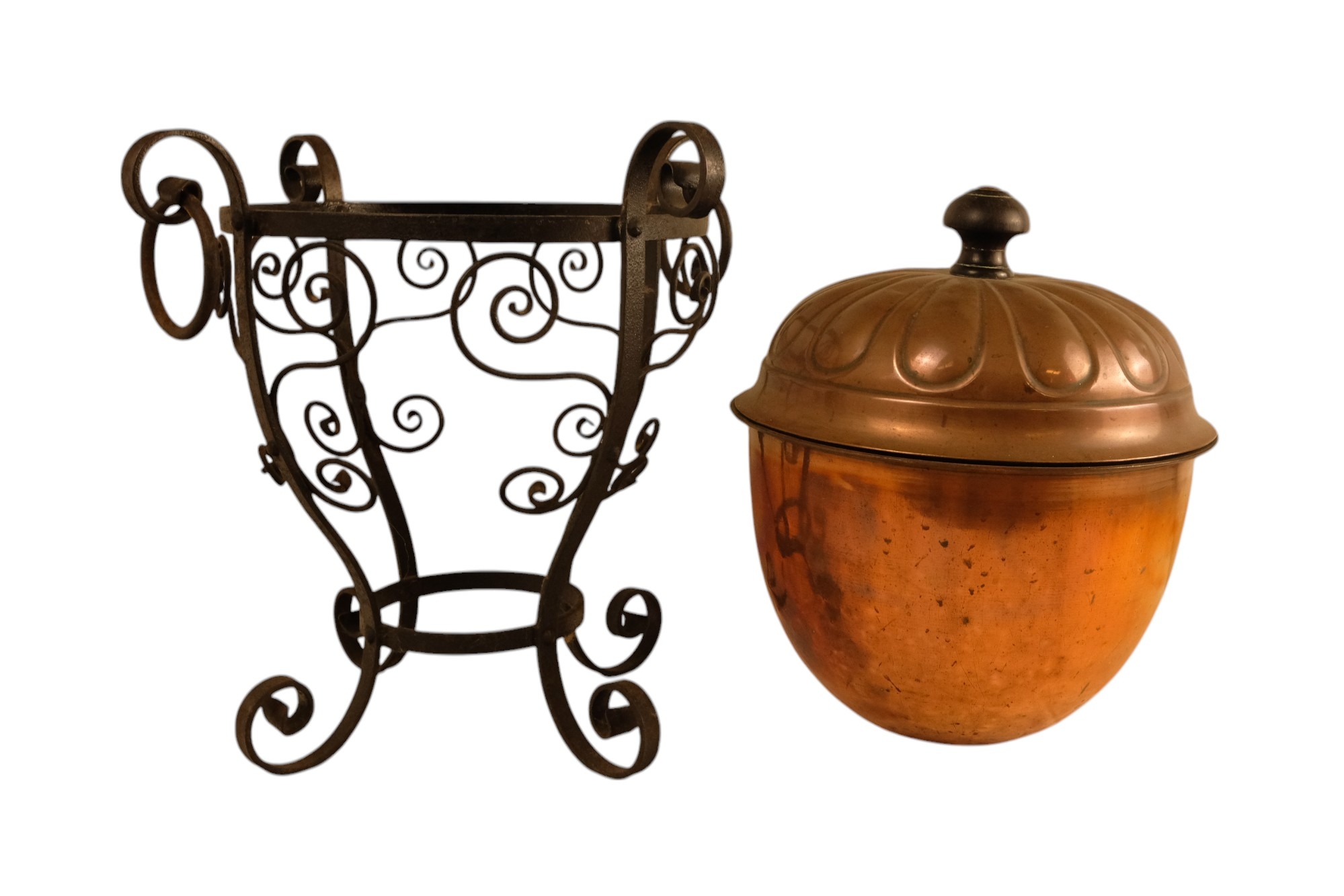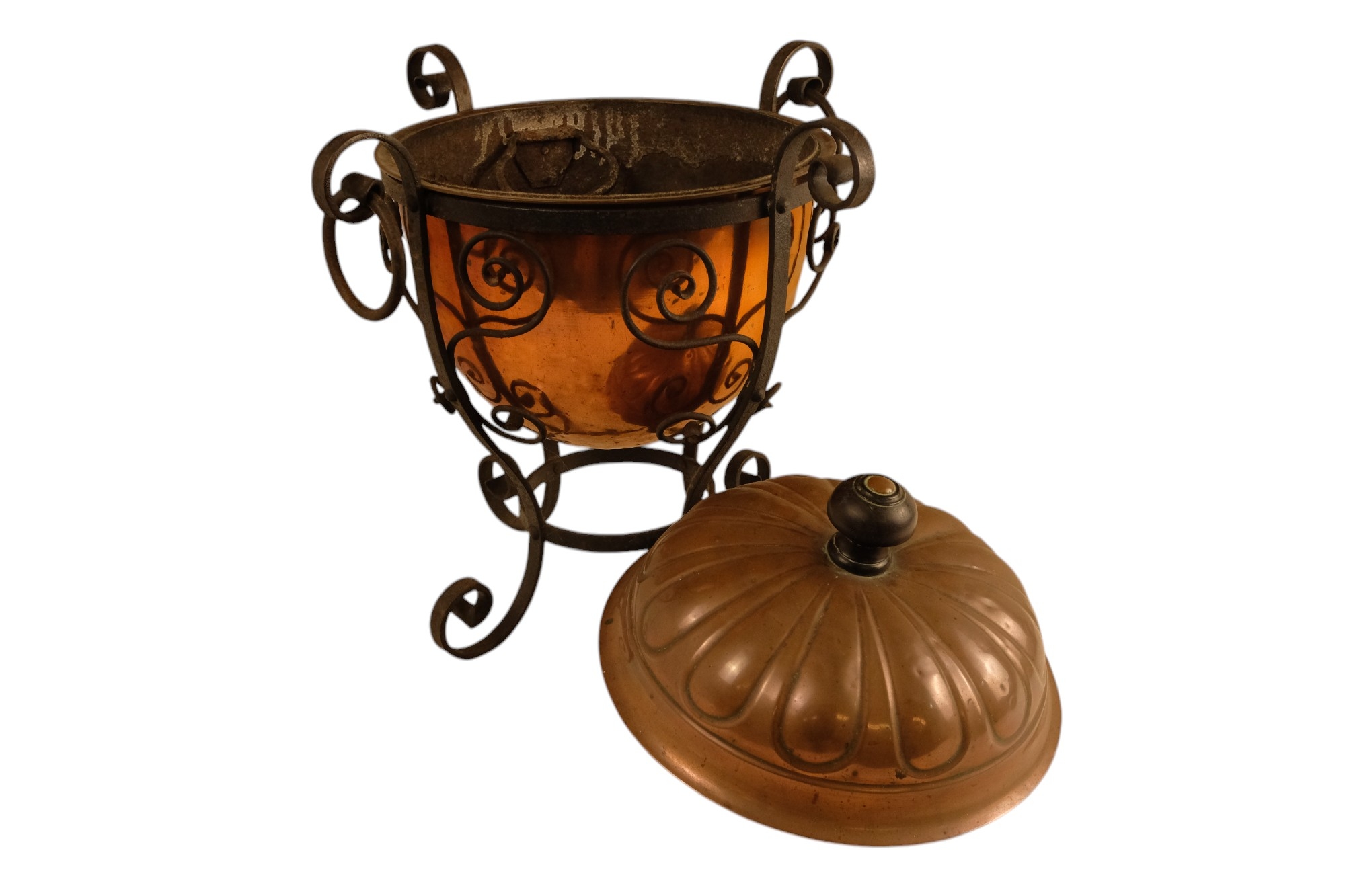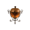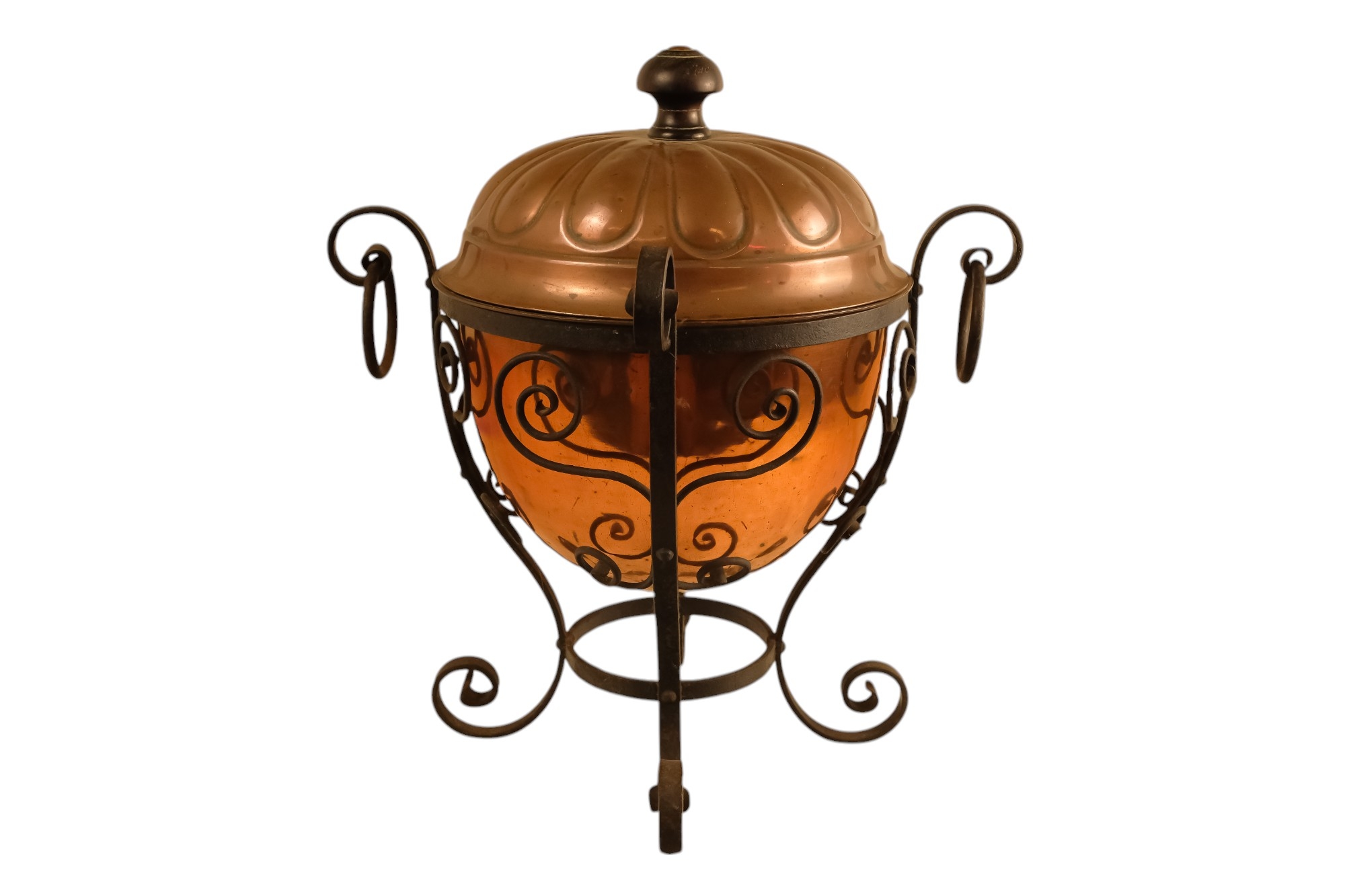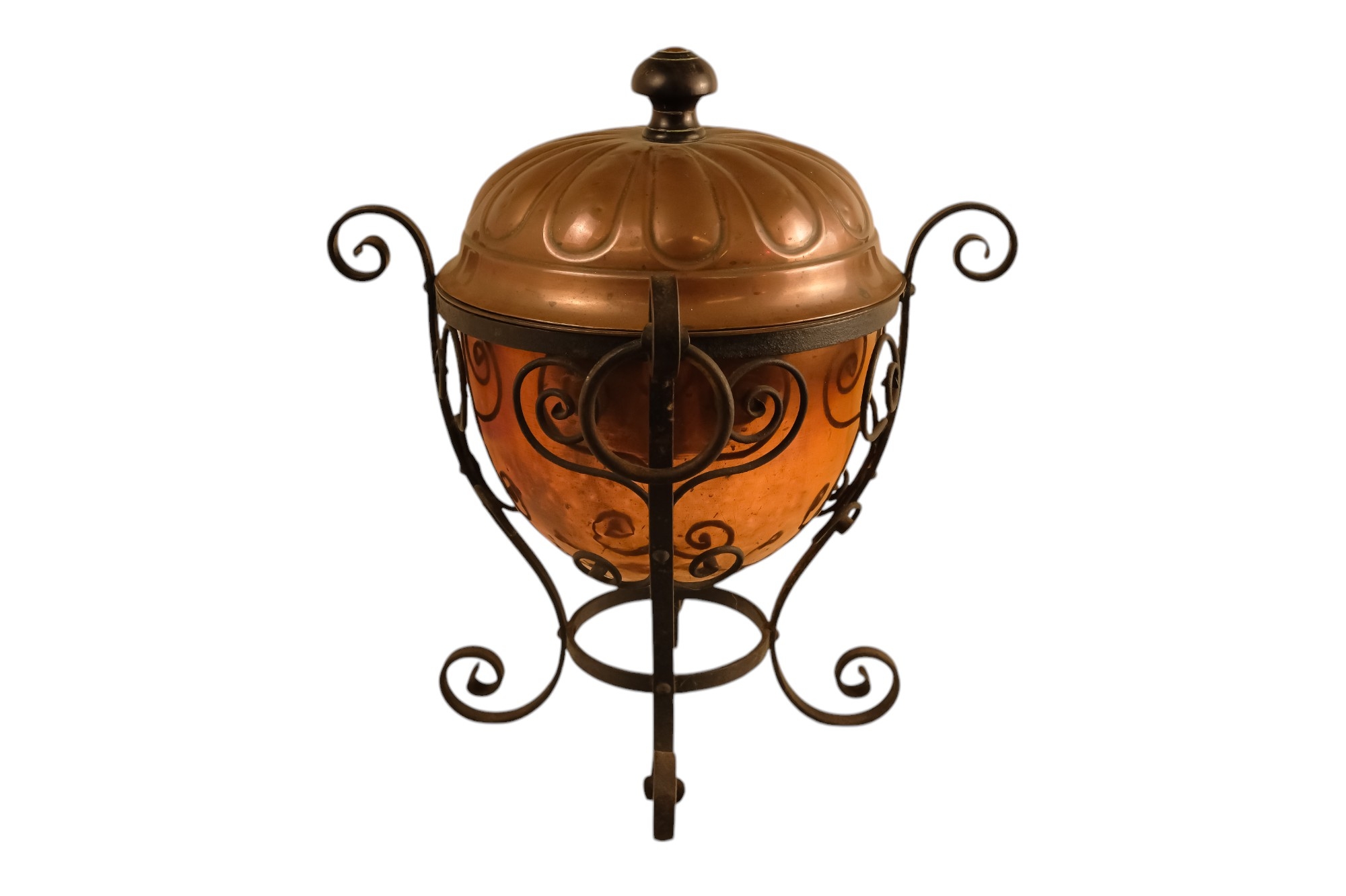 A late 19th century Arts and Crafts style copper and wrought iron coal scuttle - circular with a gadrooned cover, globe shaped body with in an iron frame, 48cm high.