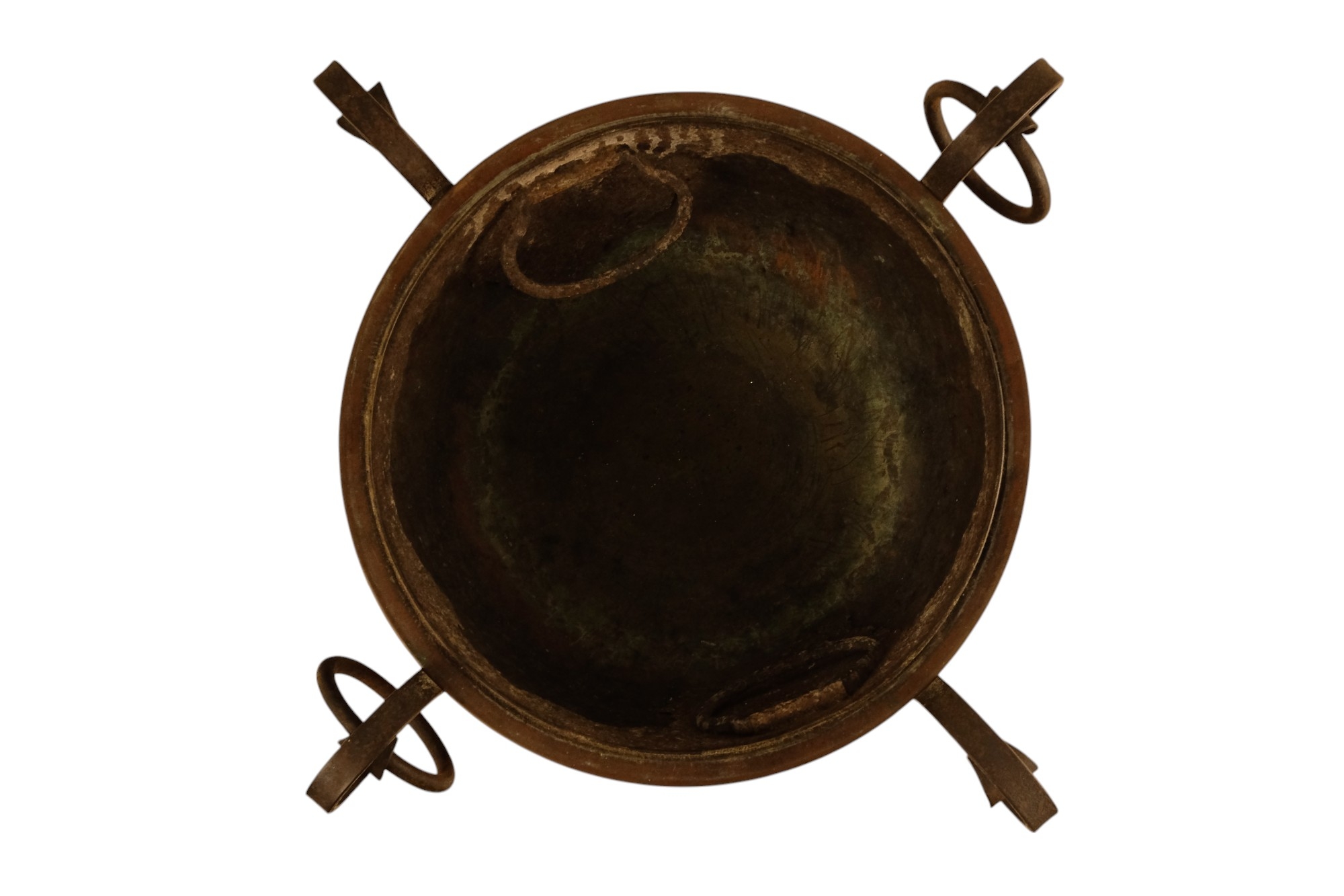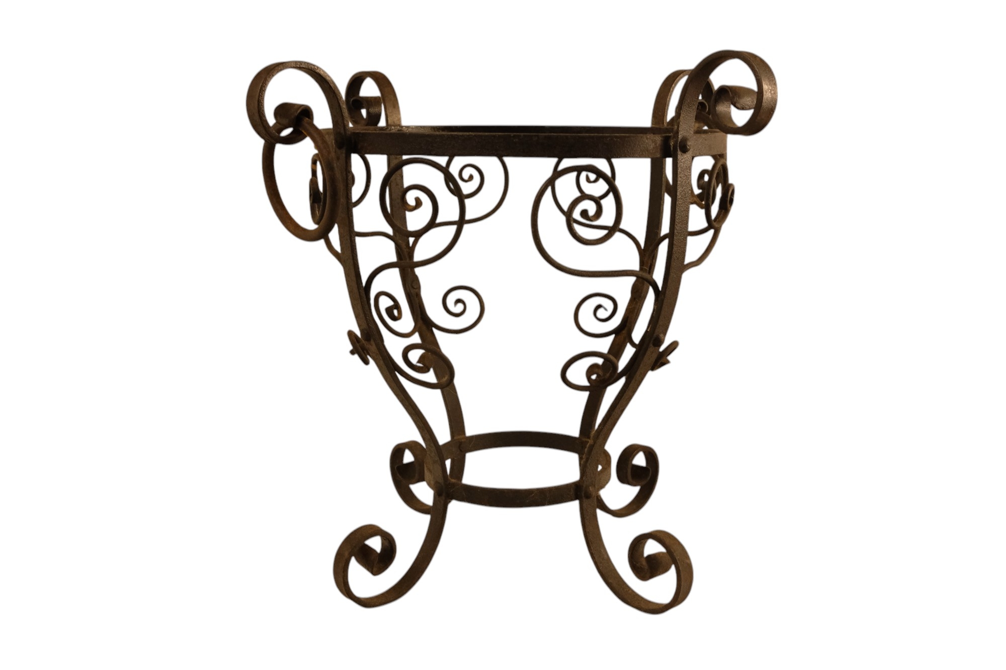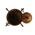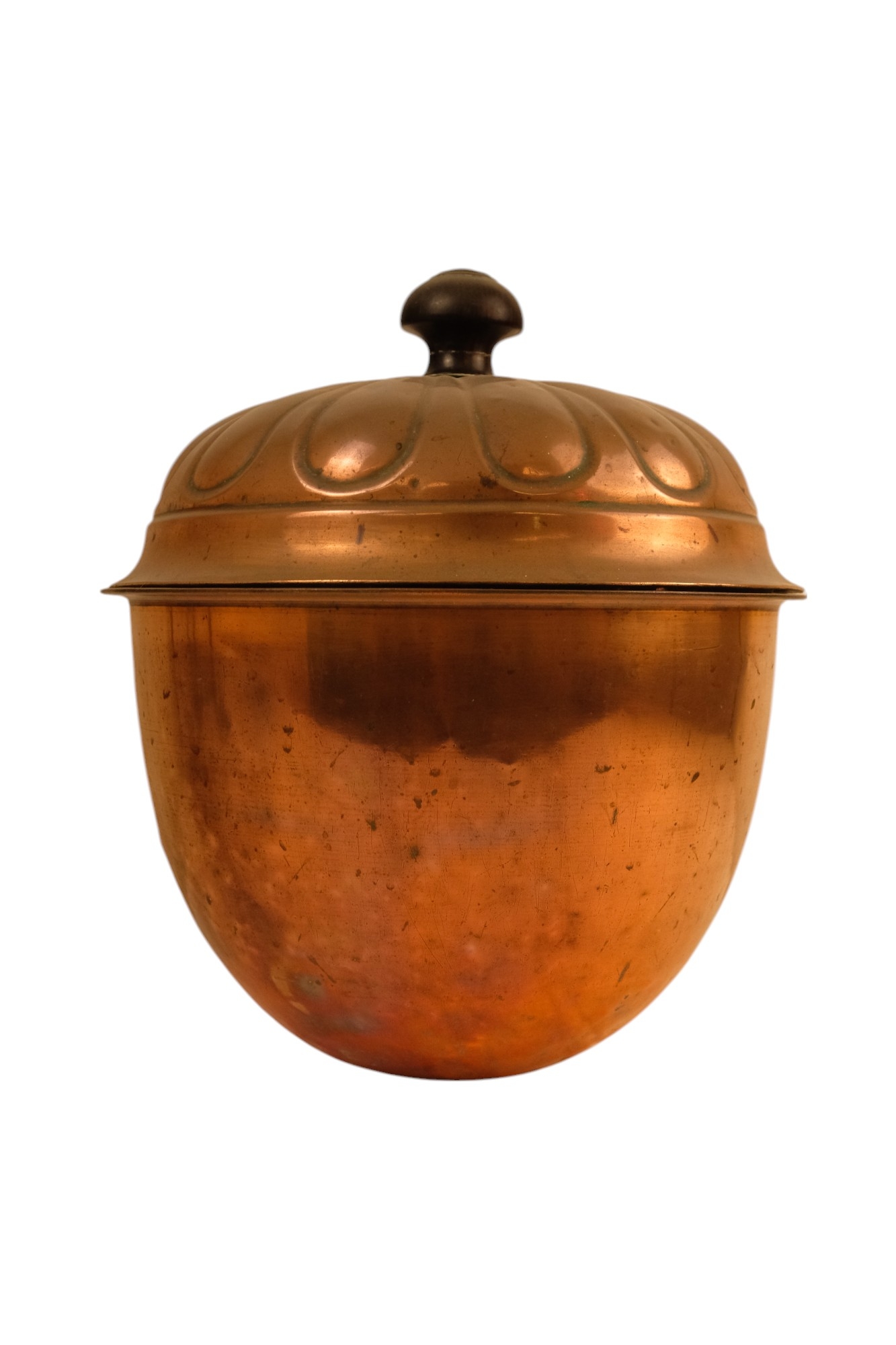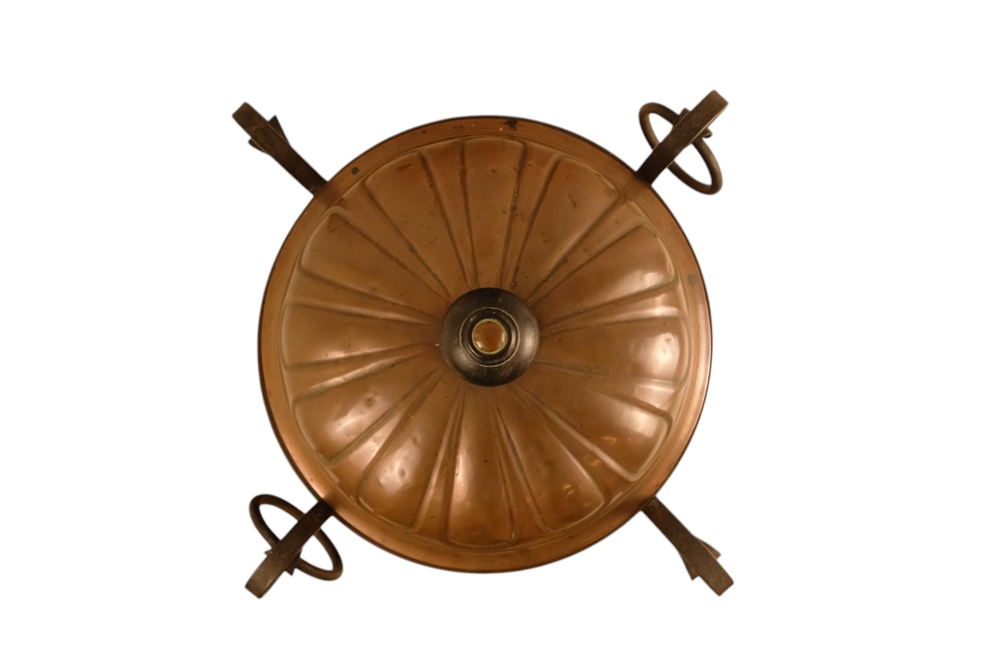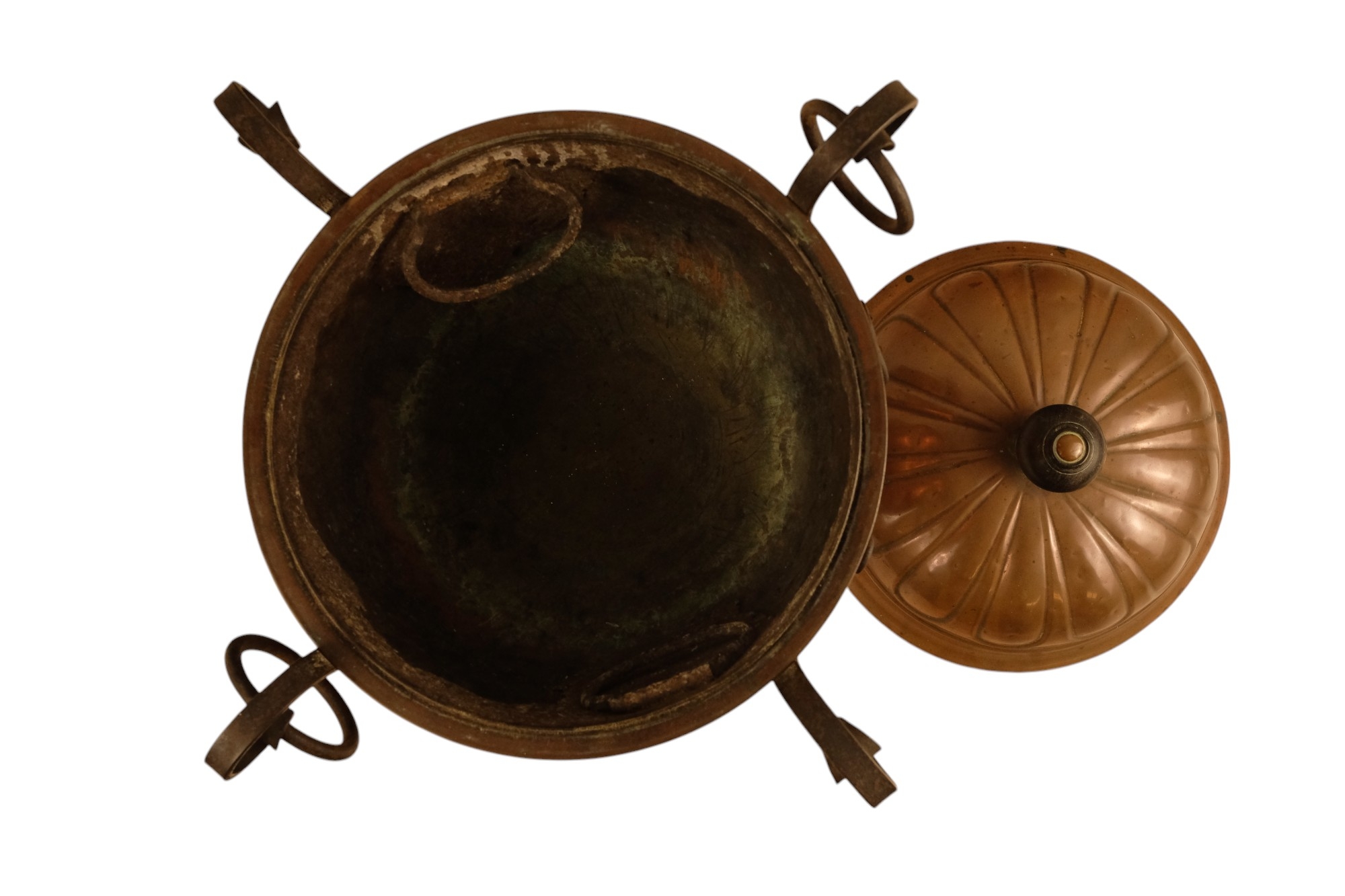 A late 19th century Arts and Crafts style copper and wrought iron coal scuttle - circular with a gadrooned cover, globe shaped body with in an iron frame, 48cm high.
