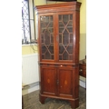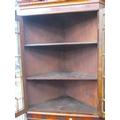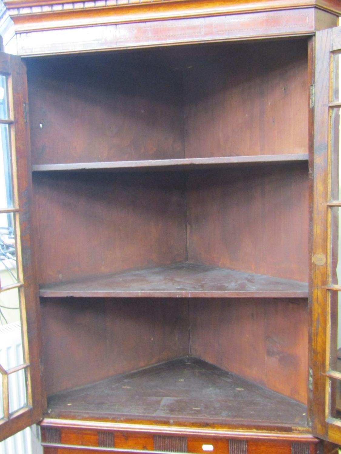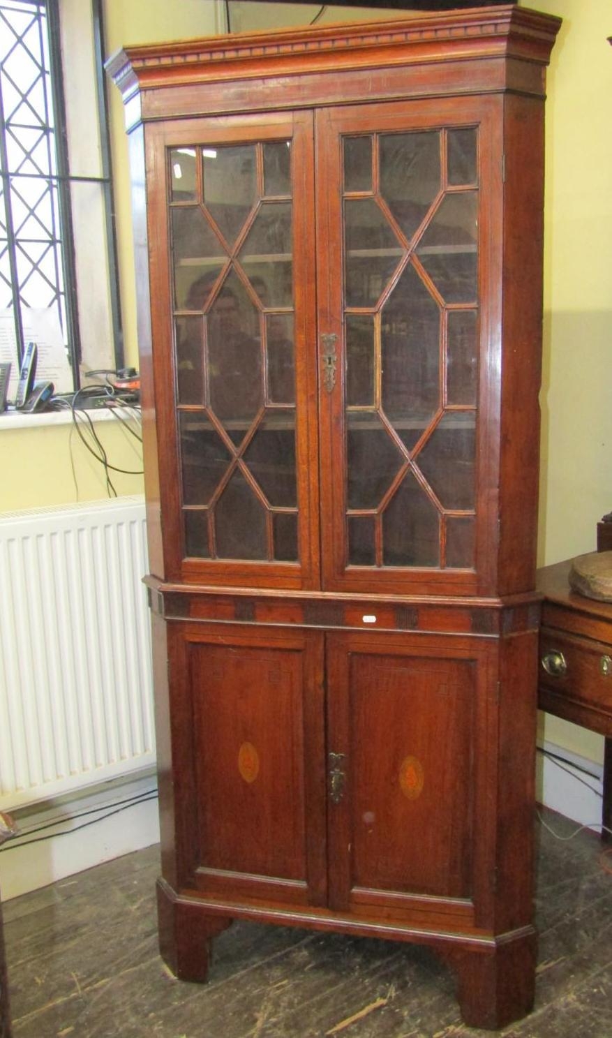 A Georgian oak freestanding corner cupboard, the lower section enclosed by two panelled doors, the upper section by two astragal glazed panelled doors, with chequered string inlay, raised on bracket supports, 84cm wide