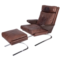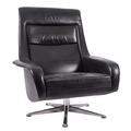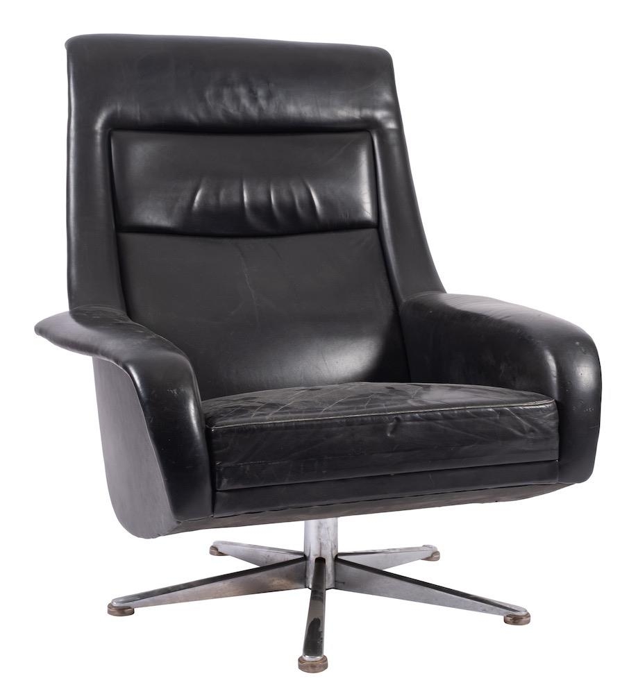 A black leather upholstered swivel armchair, circa 1960s; with rectangular back and shaped arms on a metal five legged stand; 99cm high, 86cm wide