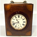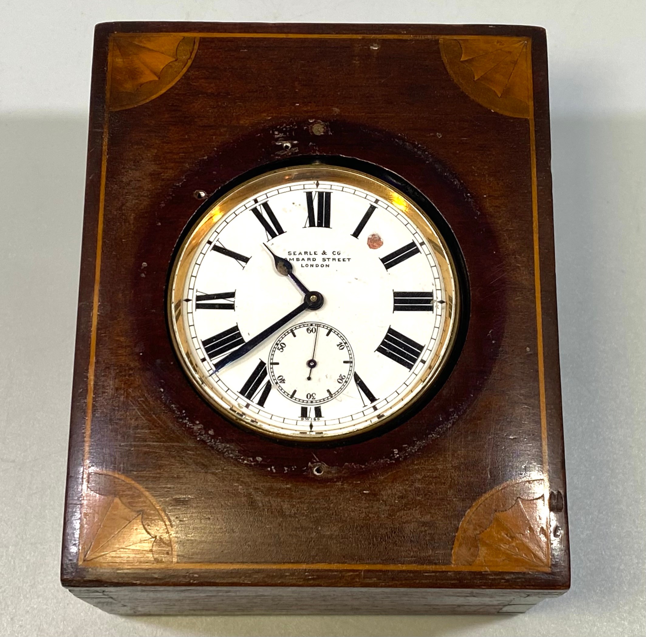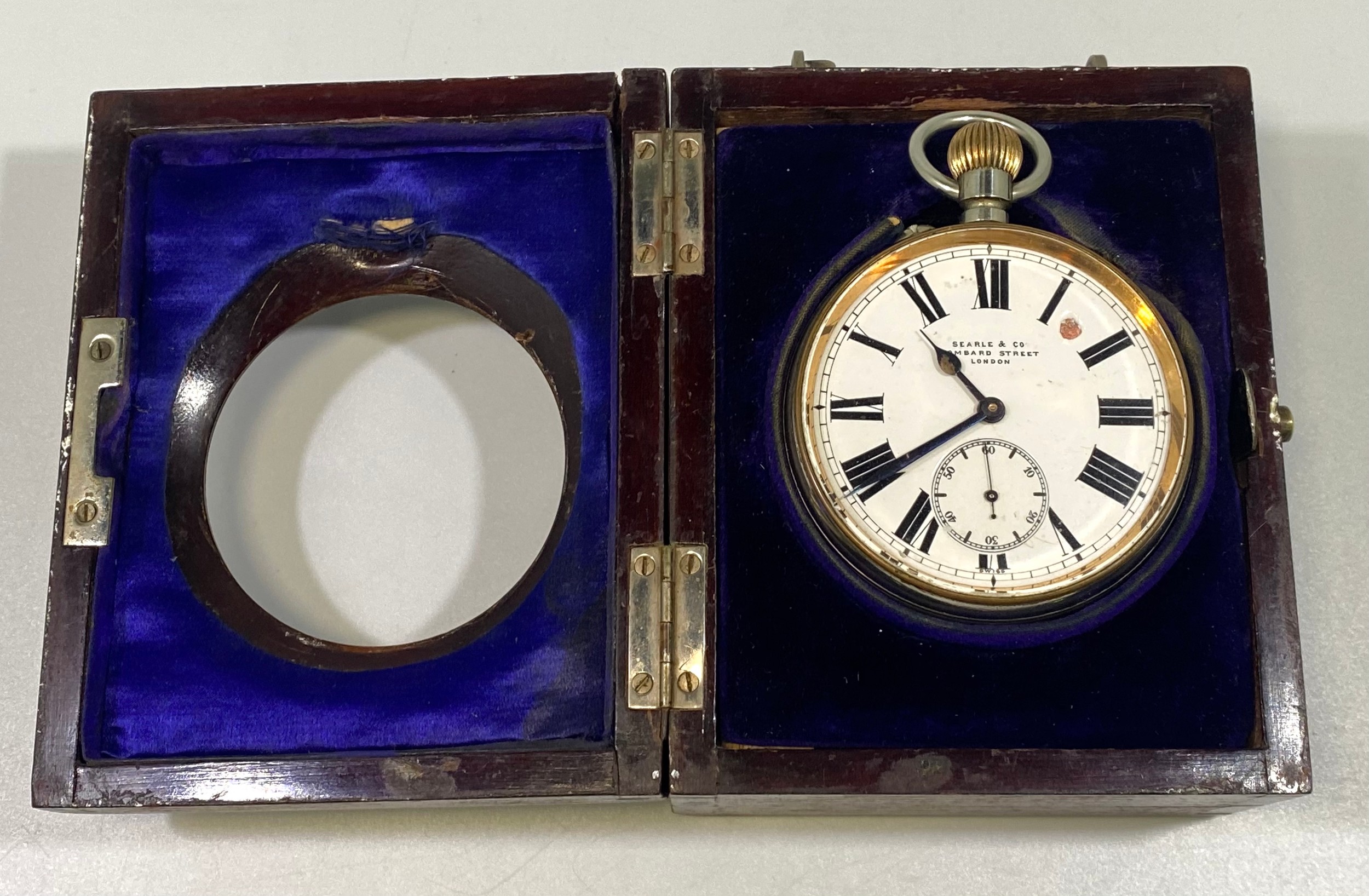 A white-metal cased open-faced Goliath pocket watch by Searle & Co, Lombard Street, London, the white enamel dial with Roman numerals denoting hours and subsidiary seconds dial, housed in a fitted and lined, inlaid mahogany box