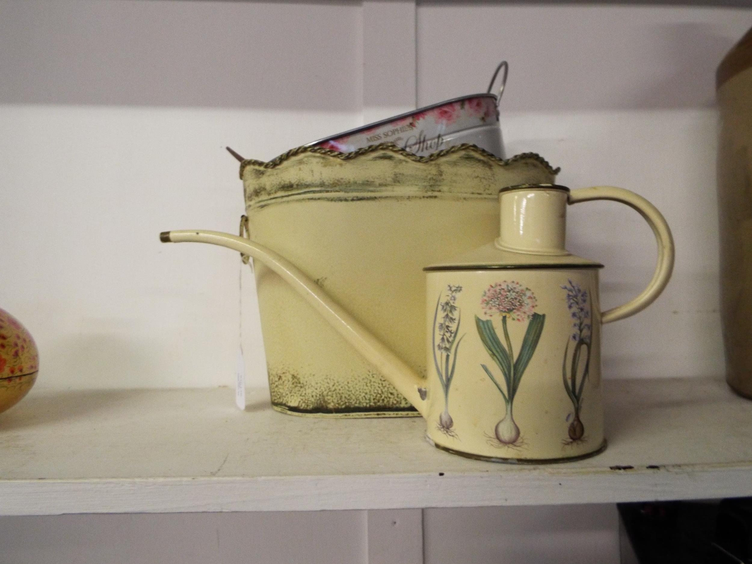 Two tin planters and watering can and a lidded container