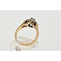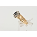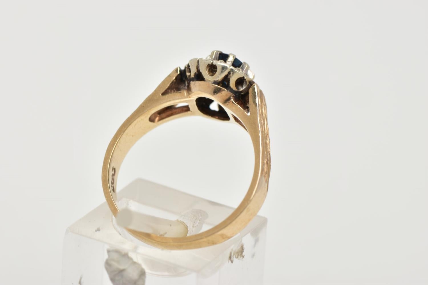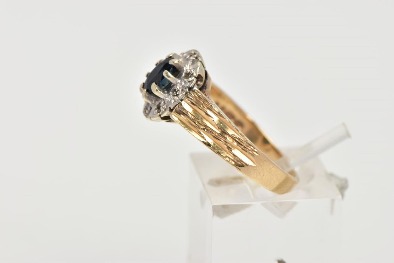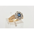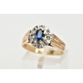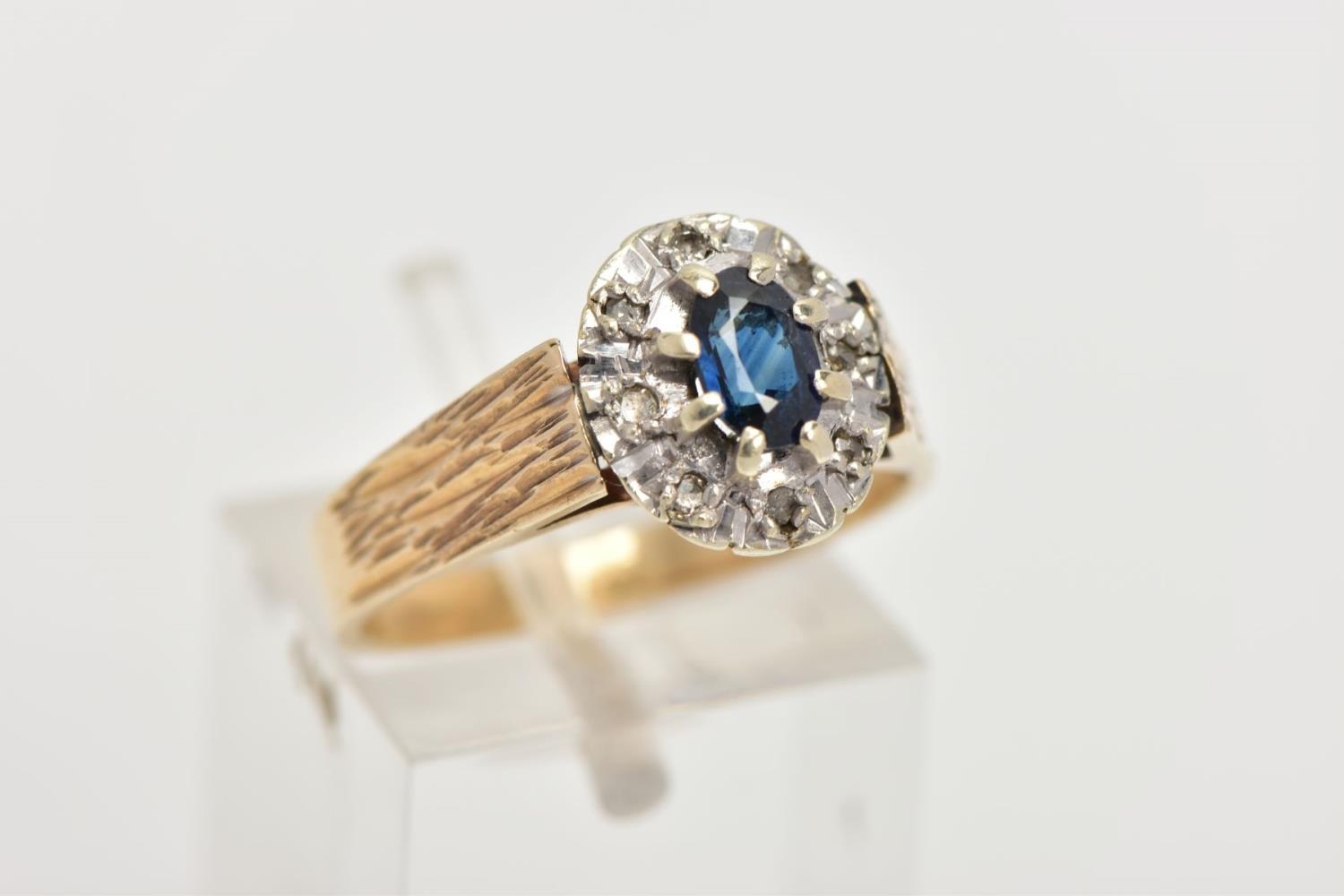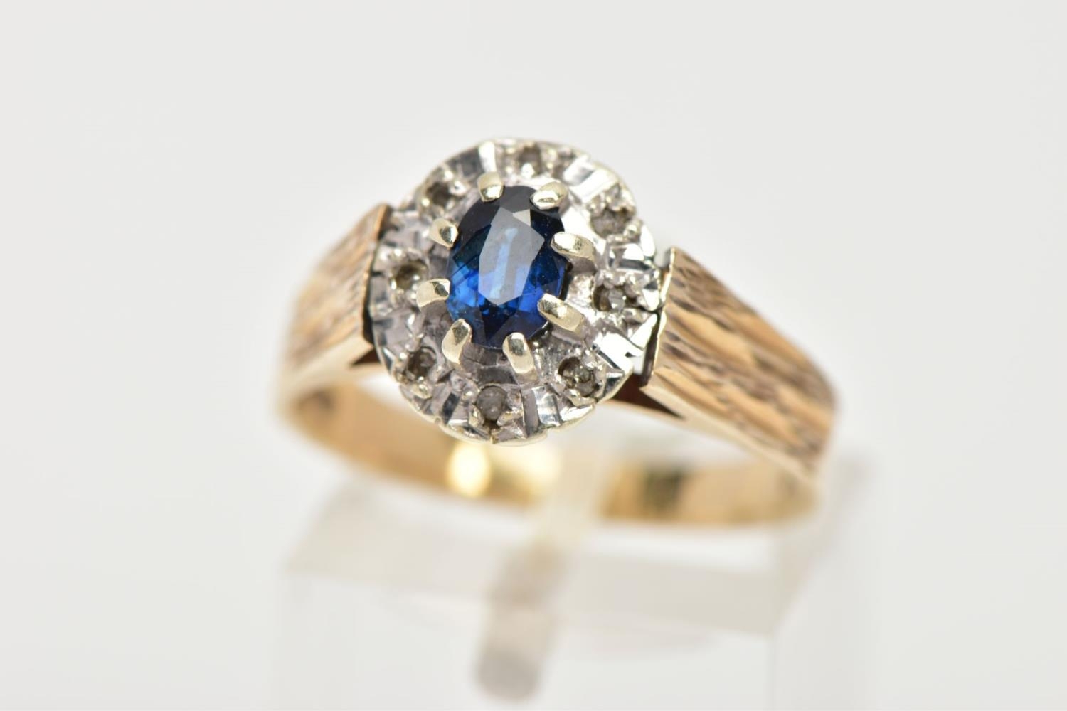 A 9CT GOLD SAPPHIRE RING, designed with an oval cut blue sapphire, prong set, within a halo surround set with eight round brilliant cut diamonds, a slightly tapered bark effect leading on to a polished band, hallmarked 9ct gold London, ring size M 1/2, approximate gross weight 3.7g, (condition report: general moderate wear, overall condition good)