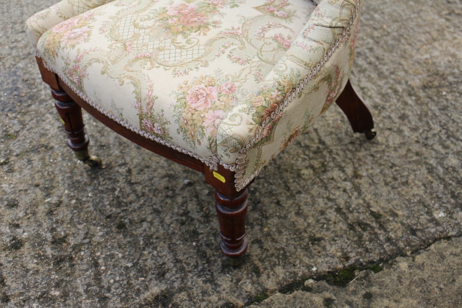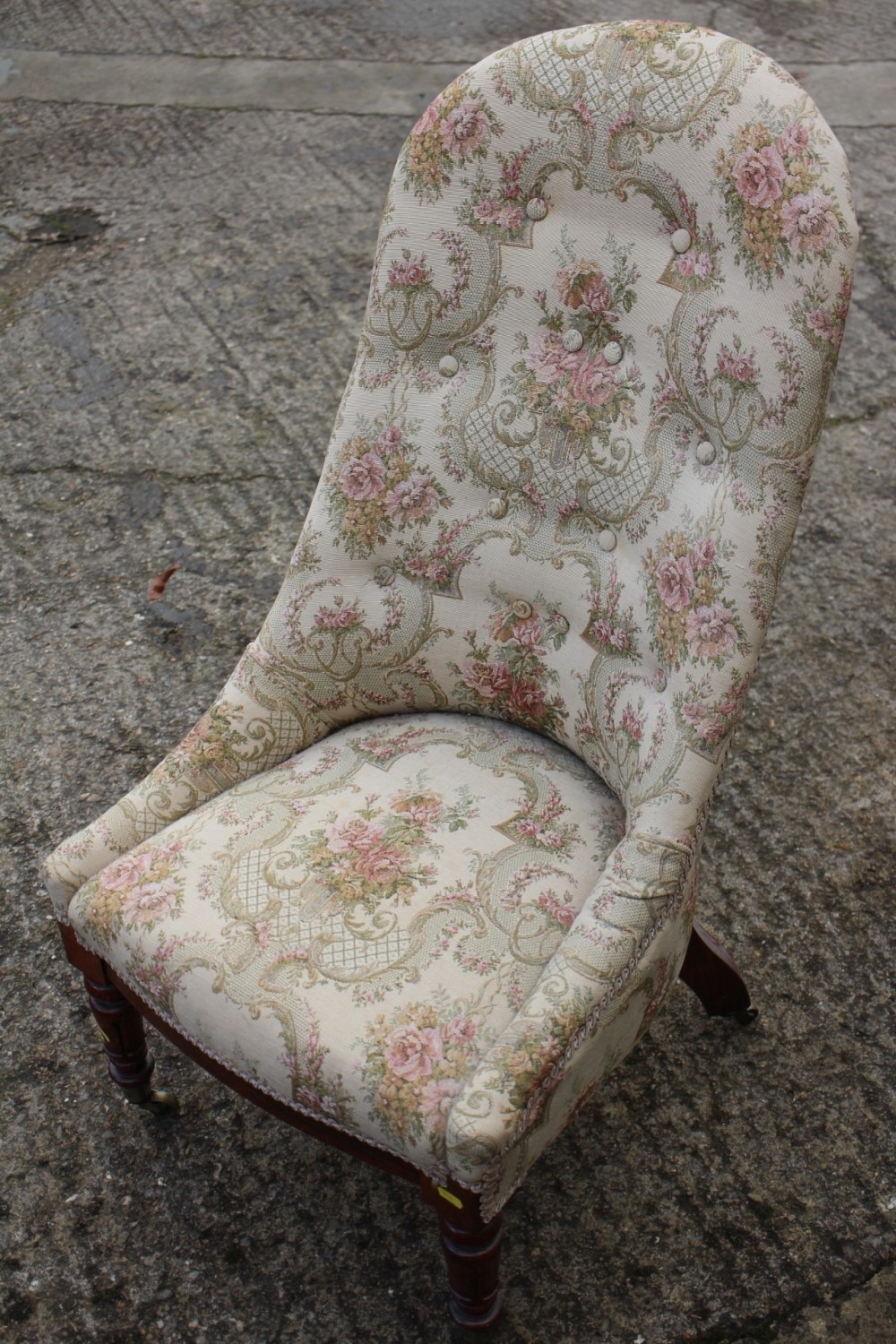 A low seat nursing chair with jacquard woven cover, on cabriole supports