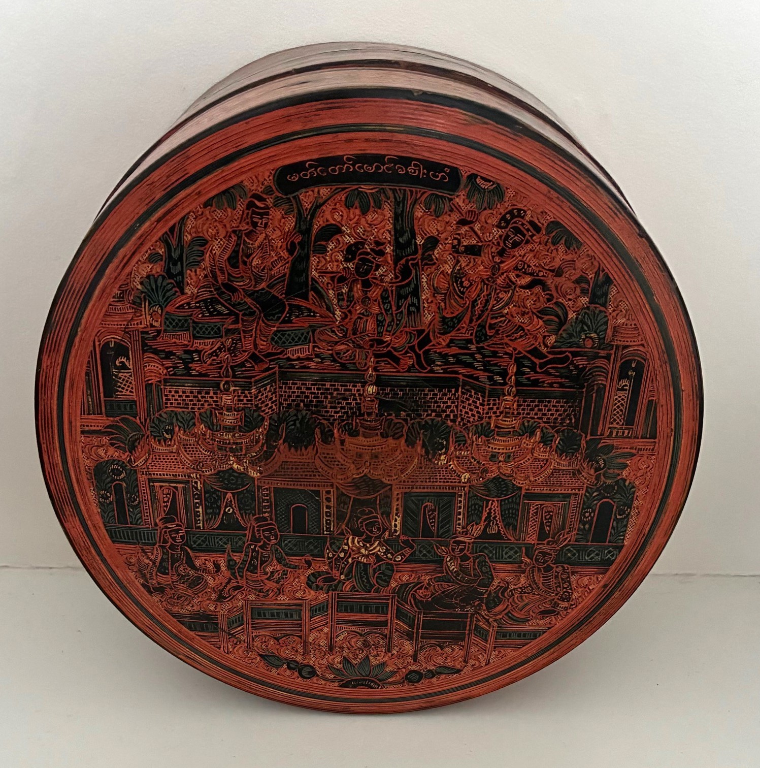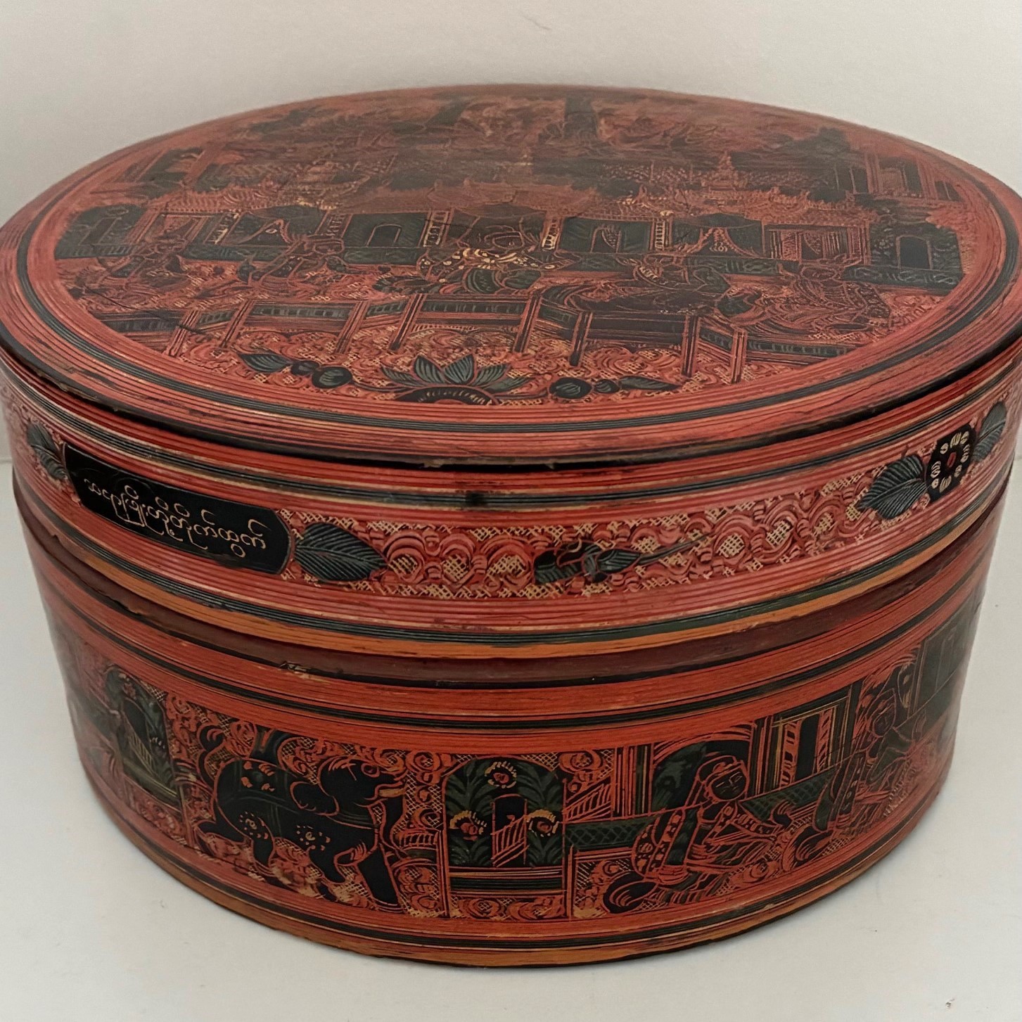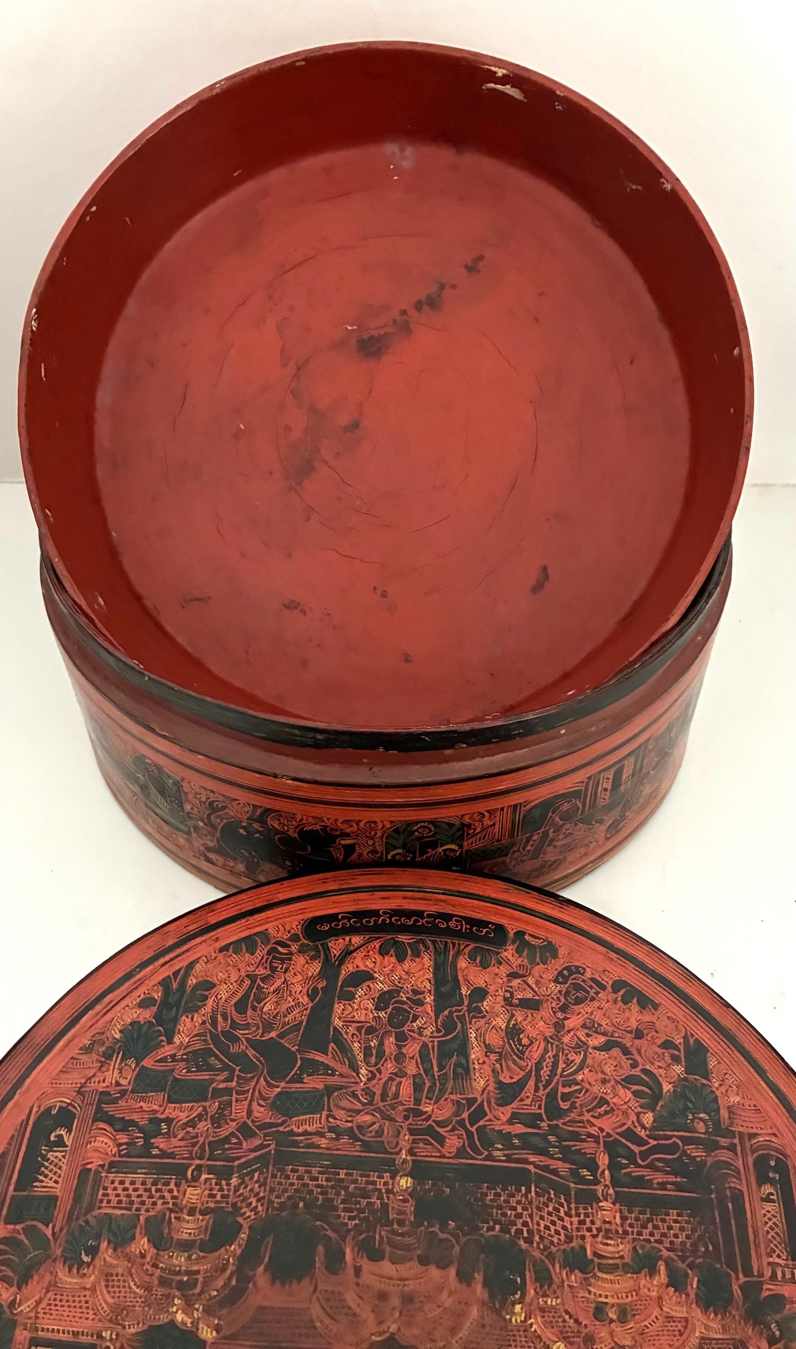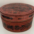 Burmese red and black lacquer betel box, of circular form with lid and fitted interior trays, 20cm diameter.