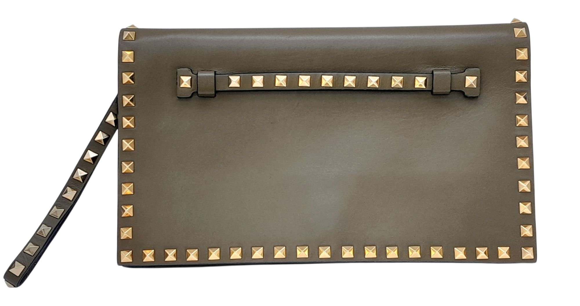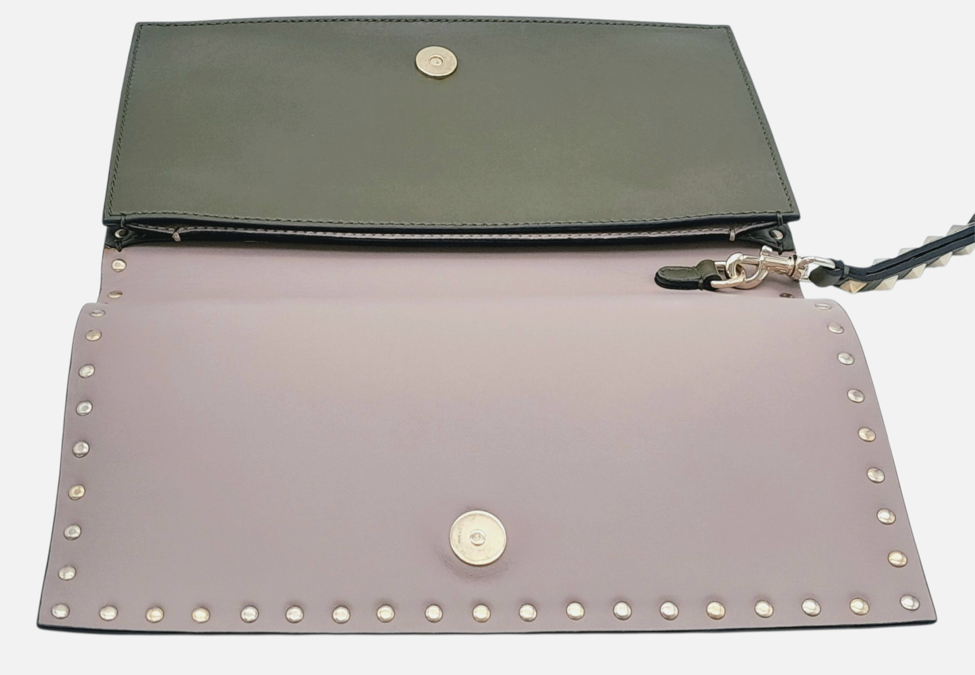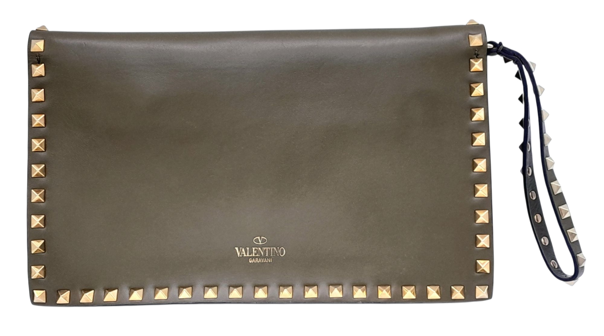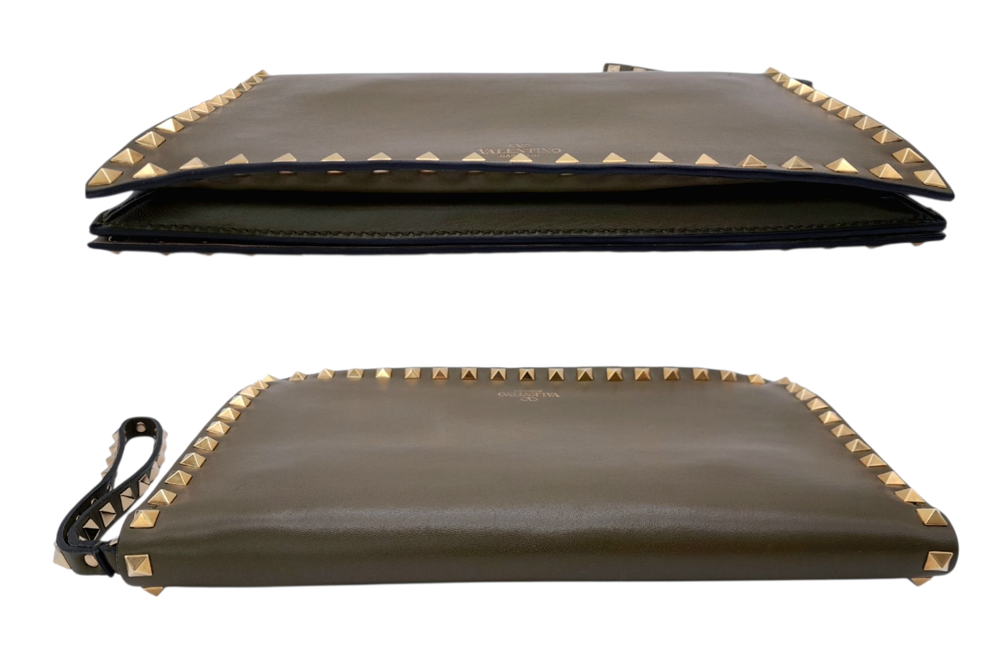 A Valentino Garavani Nappa Rockstud Wristlet Clutch. Olive Green leather exterior with gold-toned studs around every rim, an optional detachable studded strap handle. The flap opens to a beige leather interior with three open compartments and one zipped inner side pocket. Size approx: 28cm length x 17cm height. Light scratches and creasing to the leather, but overall in good condition—please see photos or request a condition report. Ref: J248