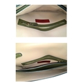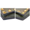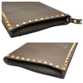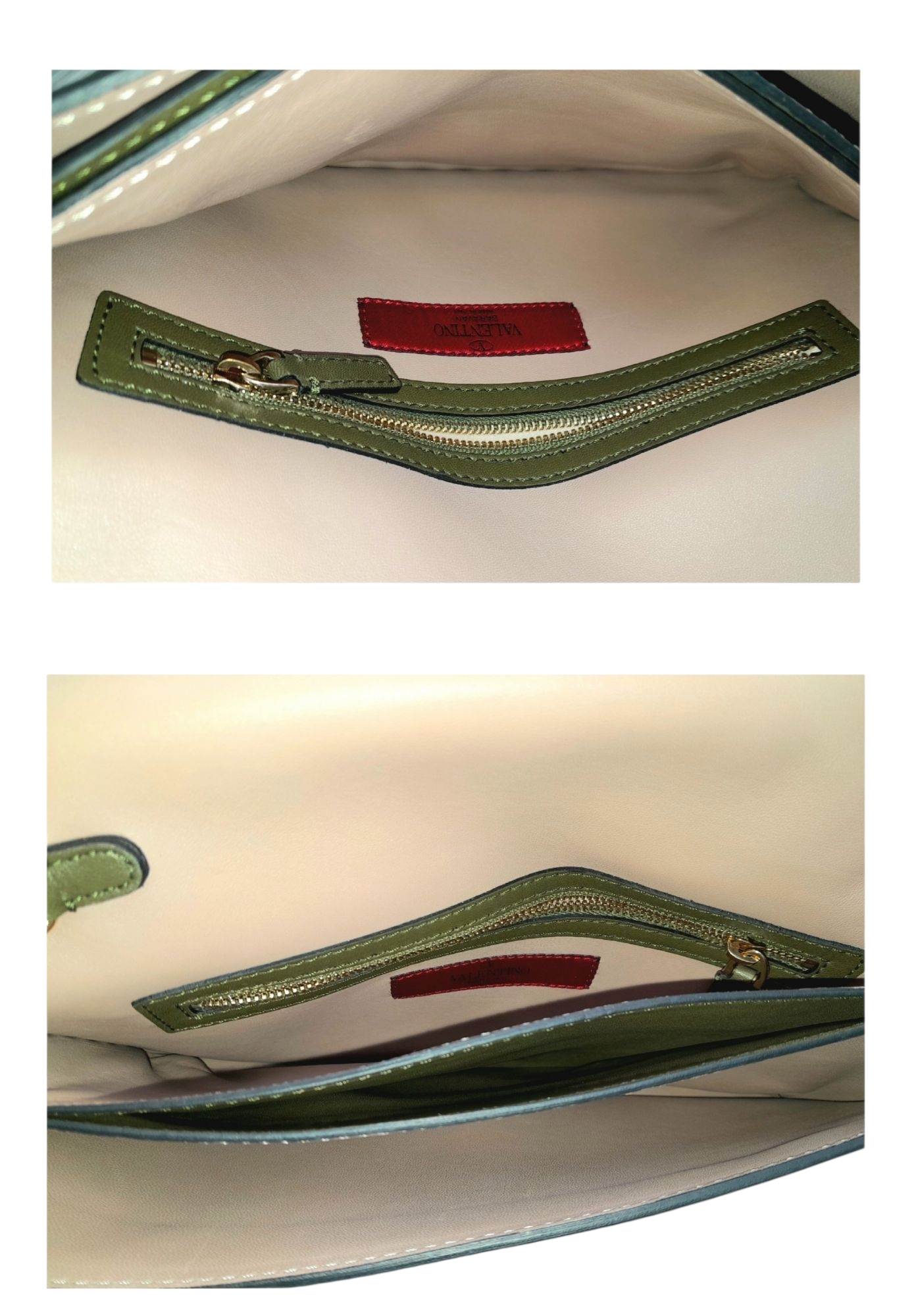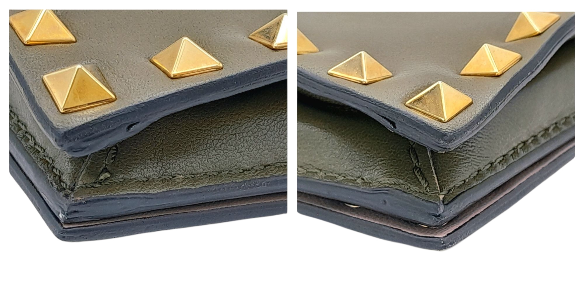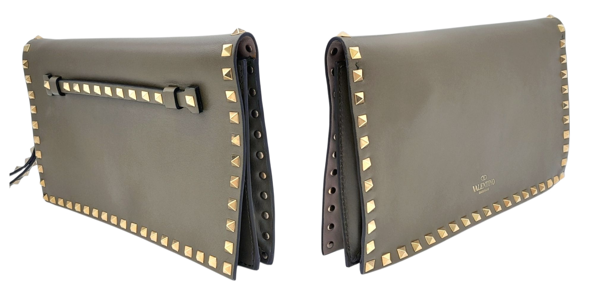 A Valentino Garavani Nappa Rockstud Wristlet Clutch. Olive Green leather exterior with gold-toned studs around every rim, an optional detachable studded strap handle. The flap opens to a beige leather interior with three open compartments and one zipped inner side pocket. Size approx: 28cm length x 17cm height. Light scratches and creasing to the leather, but overall in good condition—please see photos or request a condition report. Ref: J248