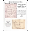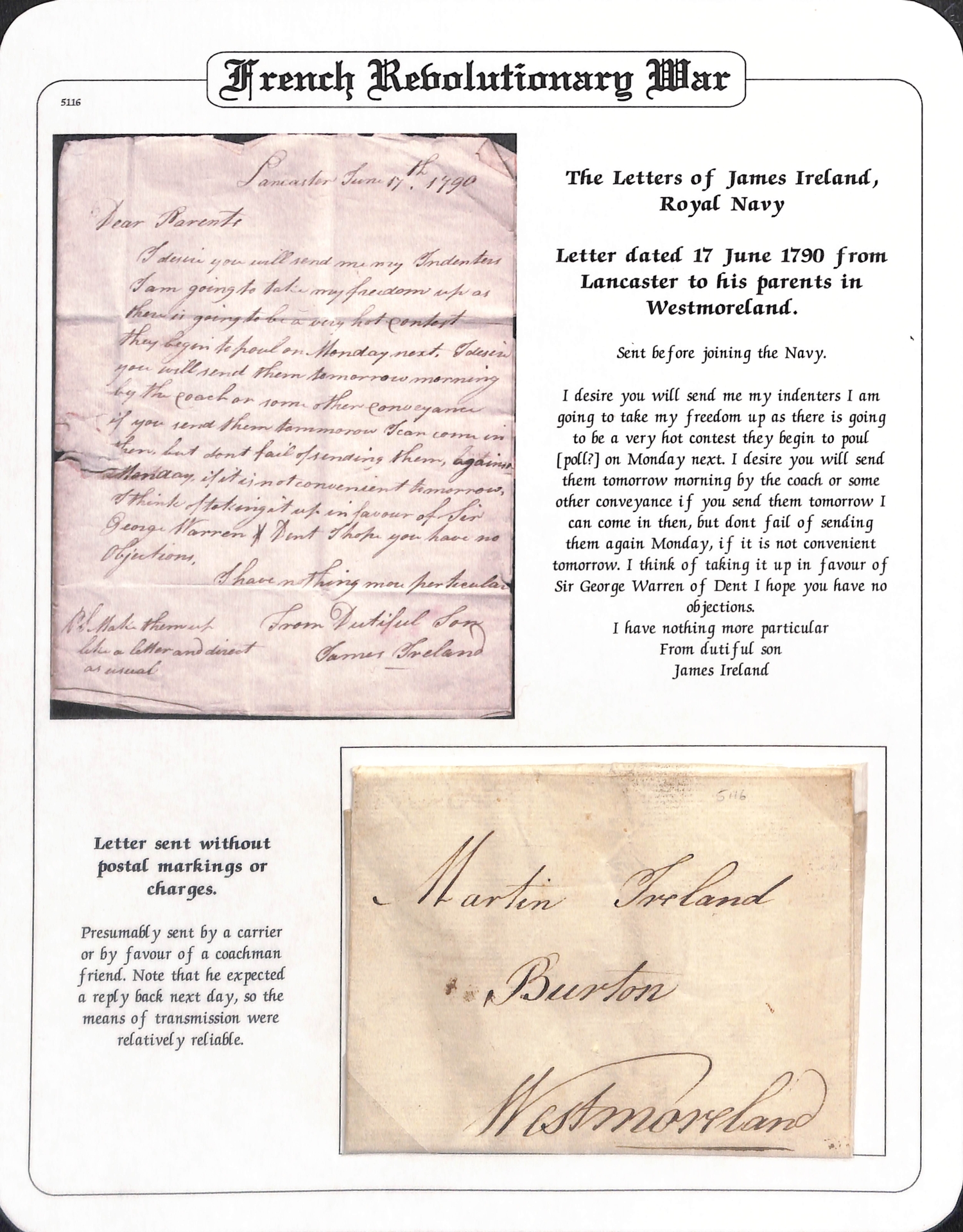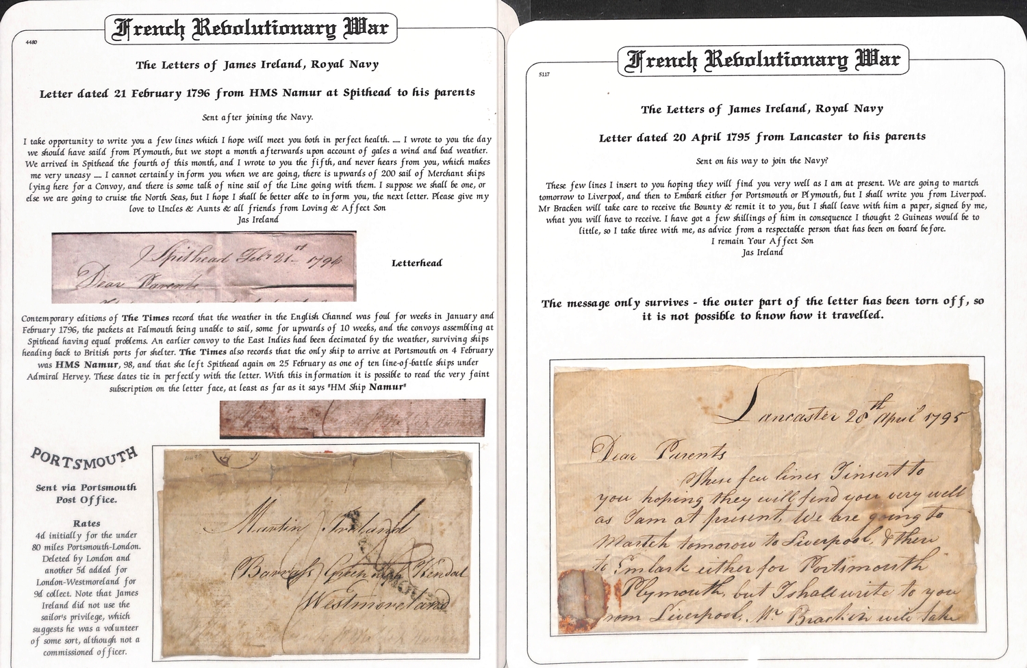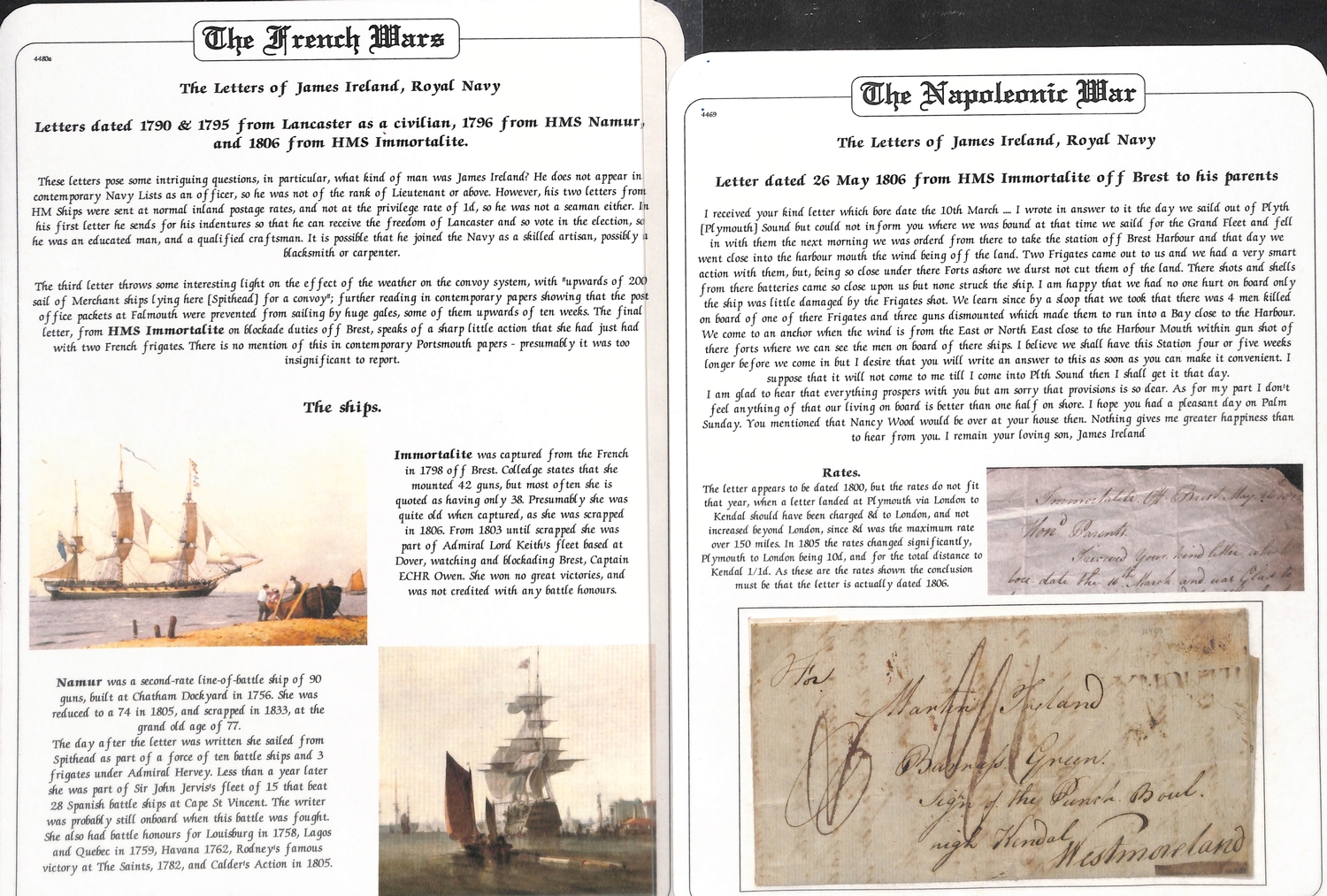 1790-96 Entire letters from James Ireland to his parents in Westmoreland comprising 1790 letter from Lancaster sent prior to joining the navy, privately carried; 1795 (Apr. 20) letter from Lancaster about to march to Liverpool to join the navy, address panel missing; 1796 (Feb. 21) letter from H.M.S "Namur" at Spithead posted at Portsmouth, the ship detained a month at Plymouth by gales, arrived at Spithead on the 4th, upwards of 200 merchant ships there awaiting a convoy with talk of nine of the line going with them; 1806 (May 26) letter from H.M.S "Immortalitie" off Brest posted at Plymouth, interesting contents describe an action with two French frigates, and shots and shells fired from the forts and batteries at Brest. An interesting correspondence, the "Namur" present at the Battle of St. Vincent in 1797. (4).