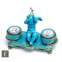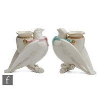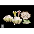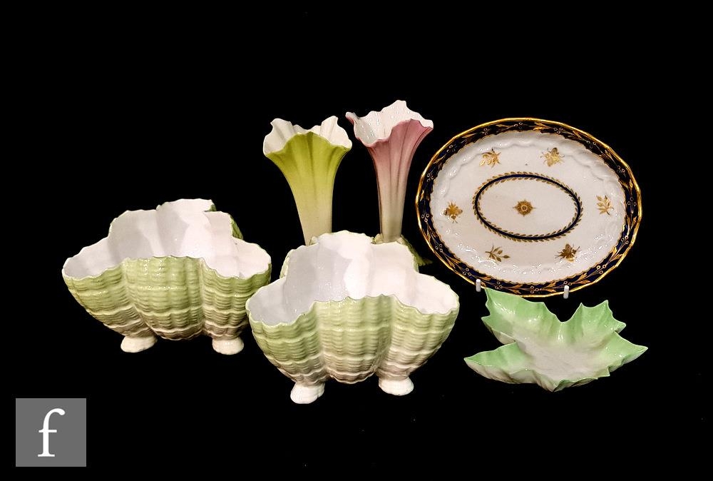 A 19th Century oval spoon tray decorated with gilt insects and floral sprays with a blue and gilt pattern edge, painted crescent mark, probably Samson, length 15cm, together with a pair of Royal Worcester shape G365 spill vases, a Grainger & Co leaf shaped dish and a pair of Royal Worcester shape G69 footed dishes. (6)
