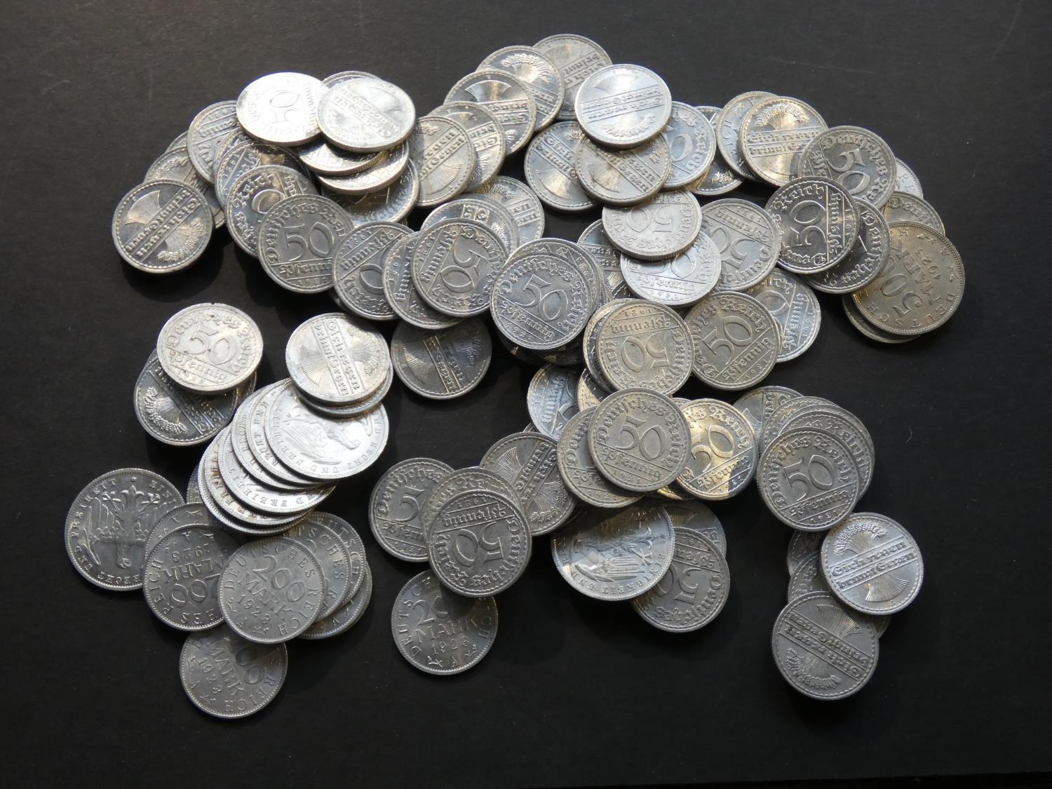 GERMANY. Weimar Republic (1919-1933). 50 Pfennig, KM35 (1920A x3, 1920J x3, 1921A x67, 1921F, 1921J x3, 1922A x9), plus 200 Mark, KM35 (1923A x14, 1923J) and 500 Mark, KM36 (1923A x10), VF to UNC (111)