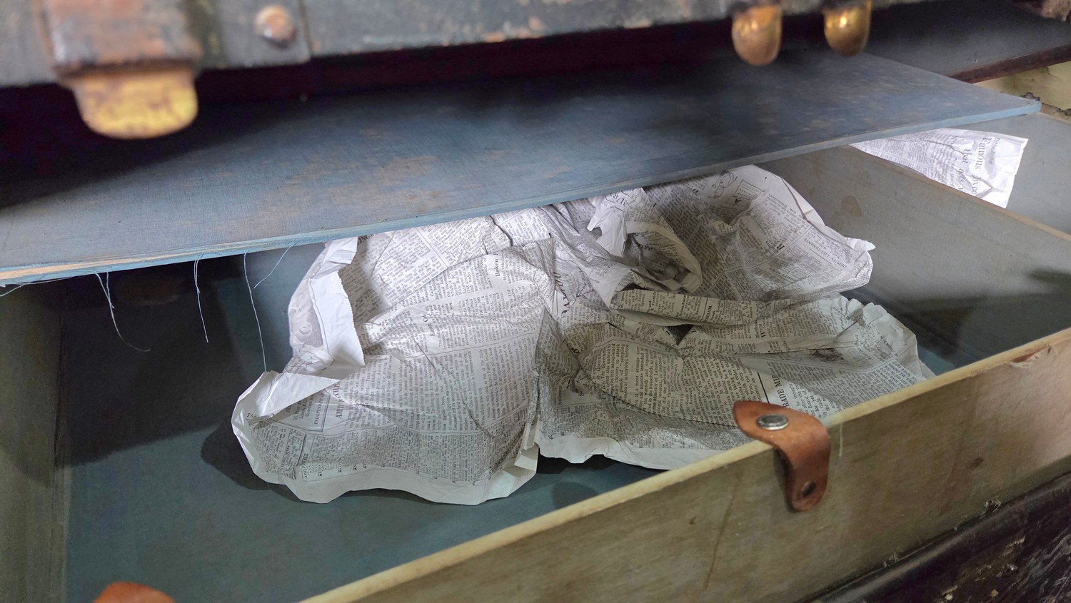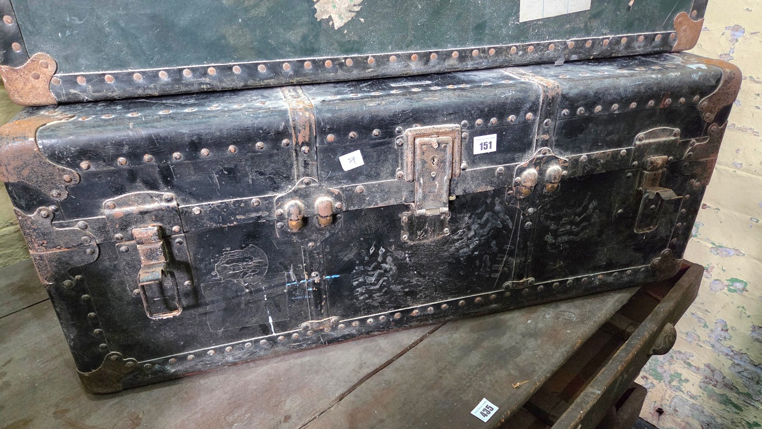 Vintage metal bound cabin trunk monogrammed EBT with internal tray