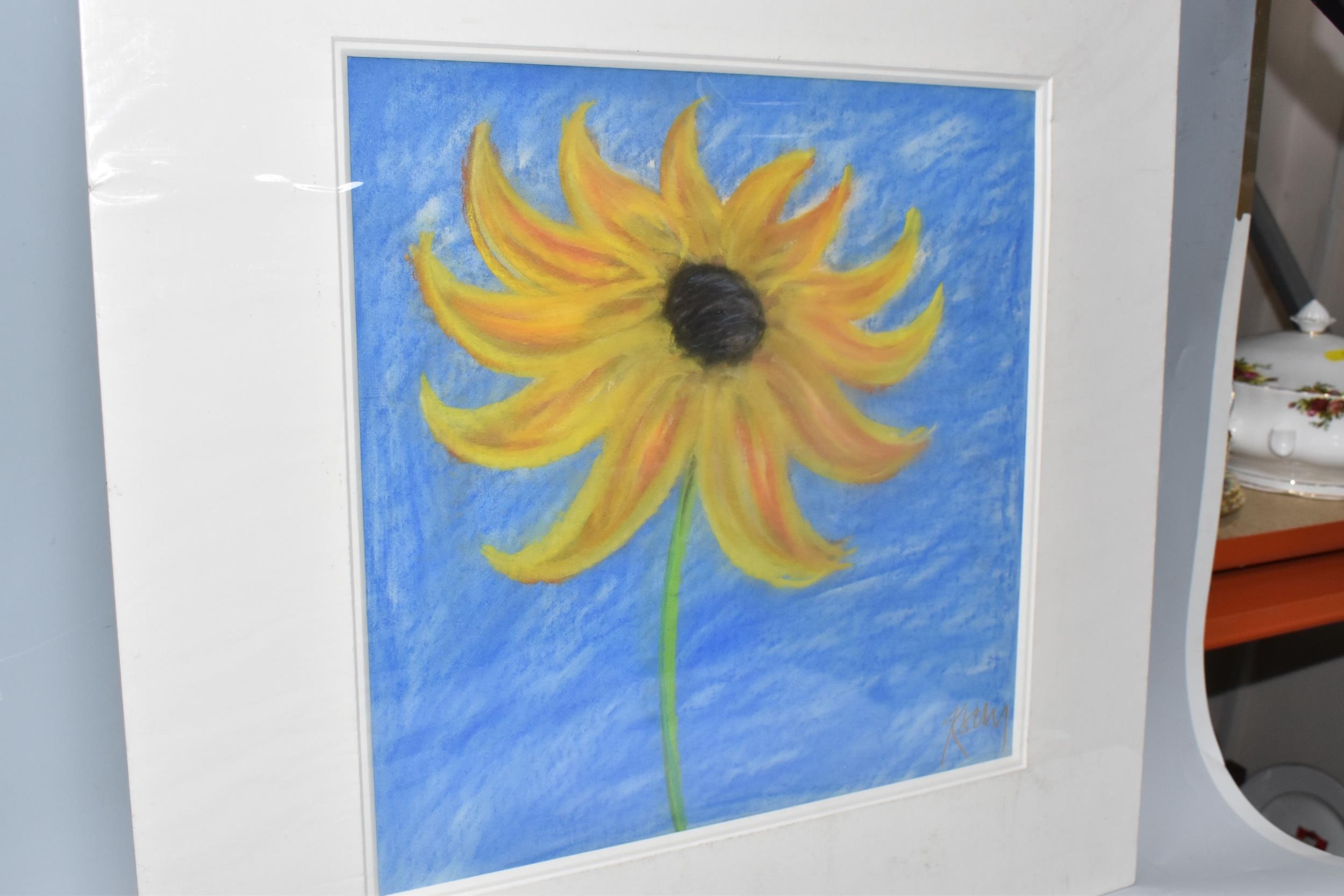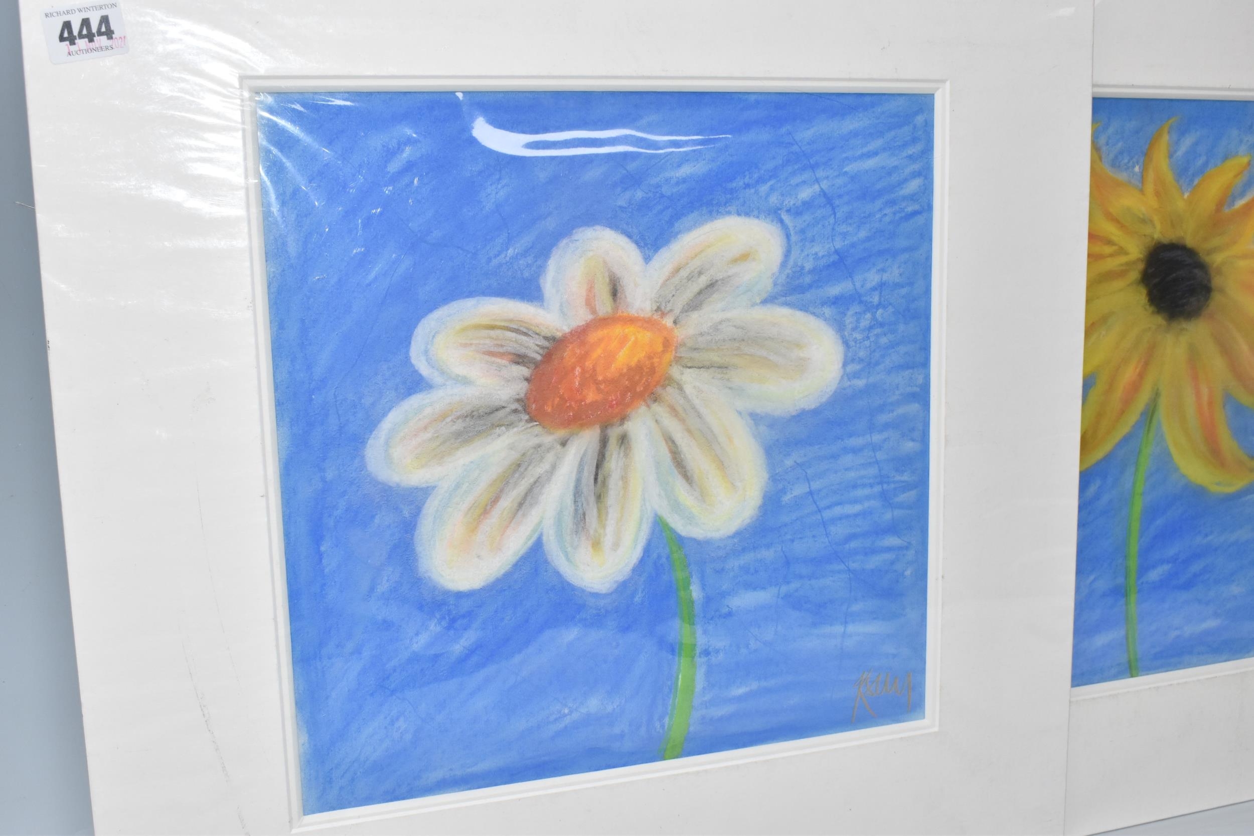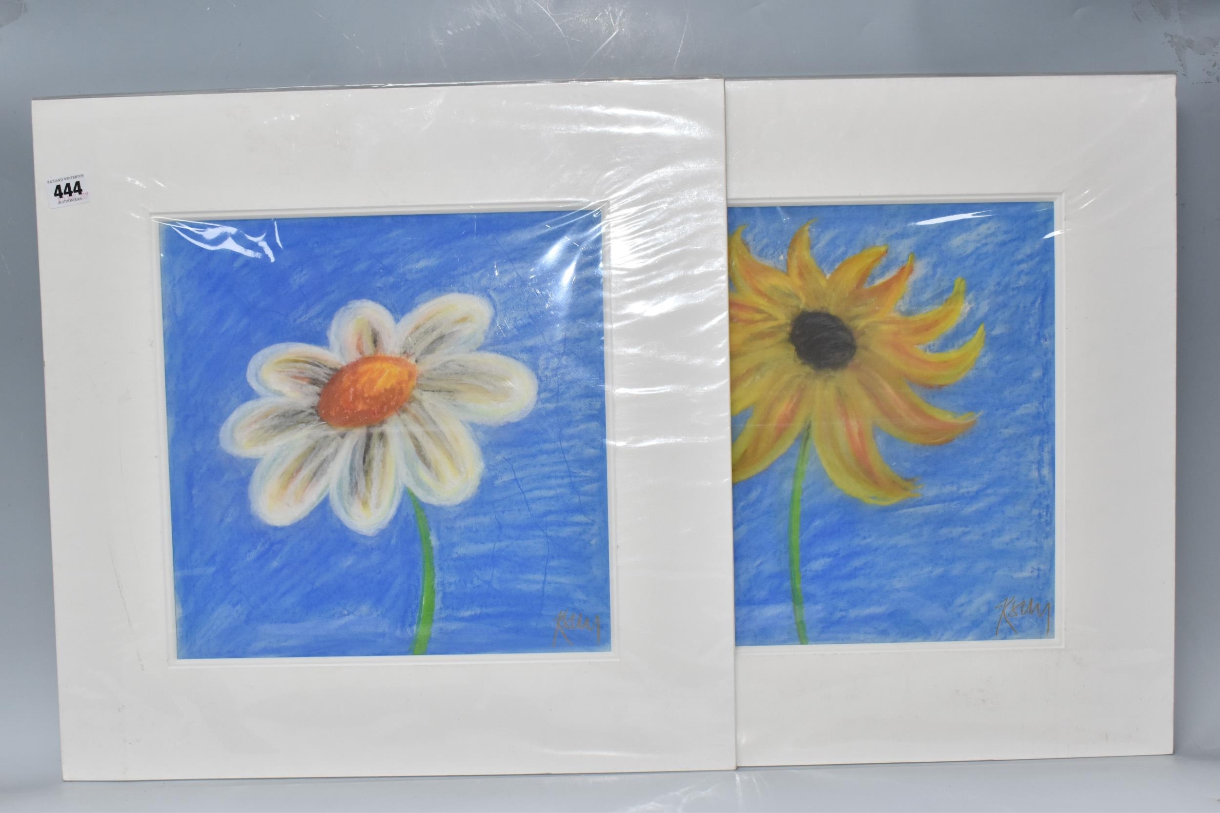 KELLY JANE (BRITISH 1971) TWO PASTEL STUDIES OF FLOWERS, one with yellow petals and the other with white petals, both signed bottom right, approximate size 32cm x 32cm, mount size 50cm x 50cm, Condition Report: bumps to the mount edges
